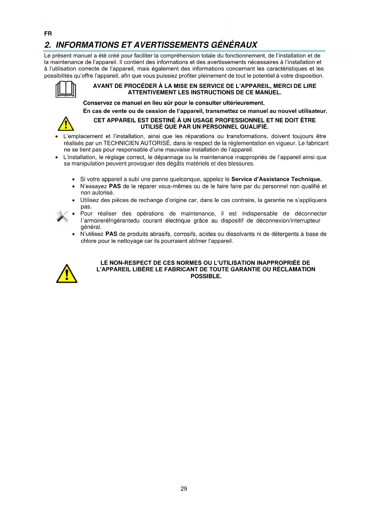 L’emplacement et l’installation, ainsi que les réparations ou transformations, doivent toujours être réalisés par un TECHNICIEN AUTORISÉ, dans le respect de la réglementation en vigueur dans chaque pays. L’installation, le réglage correct, le dépannage ou la maintenance inappropriés de l’appareil ainsi que sa manipulation peuvent provoquer des dégâts matériels et des blessures. Déballage Déballez l’appareil et vérifiez qu’il ne présente pas de dégât dû au transport ; si c’est le cas, merci d’en informer immédiatement votre fournisseur et le transporteur. En cas de doute, n’utilisez pas l’appareil avant d’avoir analysé l’étendue des dégâts.