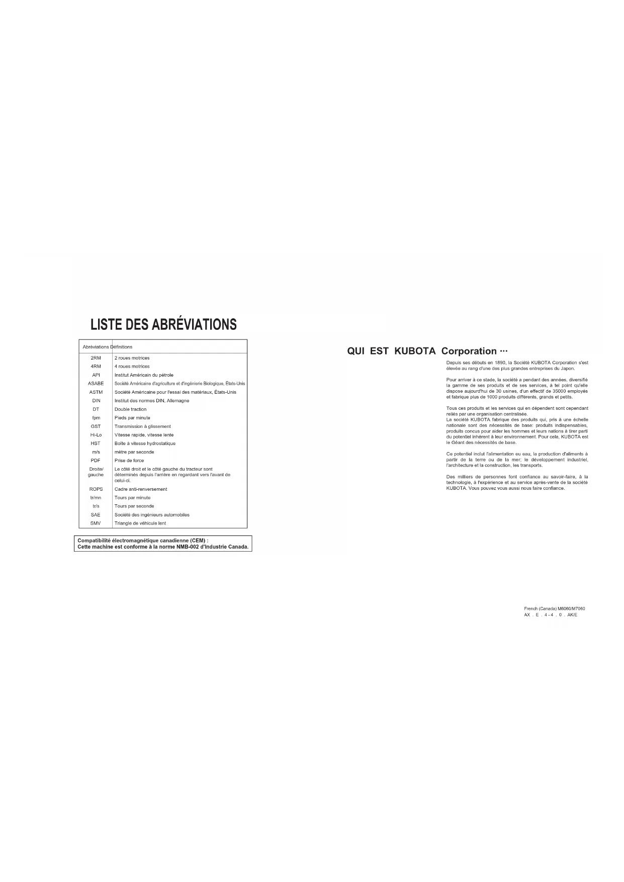MANUEL A LIRE ET A CONSERVERFrench (Canada) M6060/M7060AX . E . 4 - 4 . 0 . AK/E QUI EST KUBOTA Corporation ··· Depuis ses débuts en 1890, la Société KUBOTA Corporation s'est élevée au rang d'une des plus grandes entreprises du Japon. Pour arriver à ce stade, la société a pendant des années, diversifié la gamme de ses produits et de ses services, à tel point qu'elle dispose aujourd'hui de 30 usines, d'un effectif de 35000 employés et fabrique plus de 1000 produits différents, grands et petits. Tous ces produits et les services qui en dépendent sont cependant reliés par une organisation centralisée. La société KUBOTA fabrique des produits qui, pris à une échelle nationale sont des nécessités de base: produits indispensables, produits concus pour aider les hommes et leurs nations à tirer parti du potentiel inhérent à leur environnement. Pour cela, KUBOTA est le Géant des nécessités de base. Ce potentiel inclut l'alimentation eu eau, la production d'aliments à partir de la terre ou de la mer; le développement industriel, l'architecture et la construction, les transports. Des milliers de personnes font confiance au savoir-faire, à la technologie, à l'expérience et au service après-vente de la société KUBOTA. Vous pouvez vous aussi nous faire confiance. Abréviations Définitions