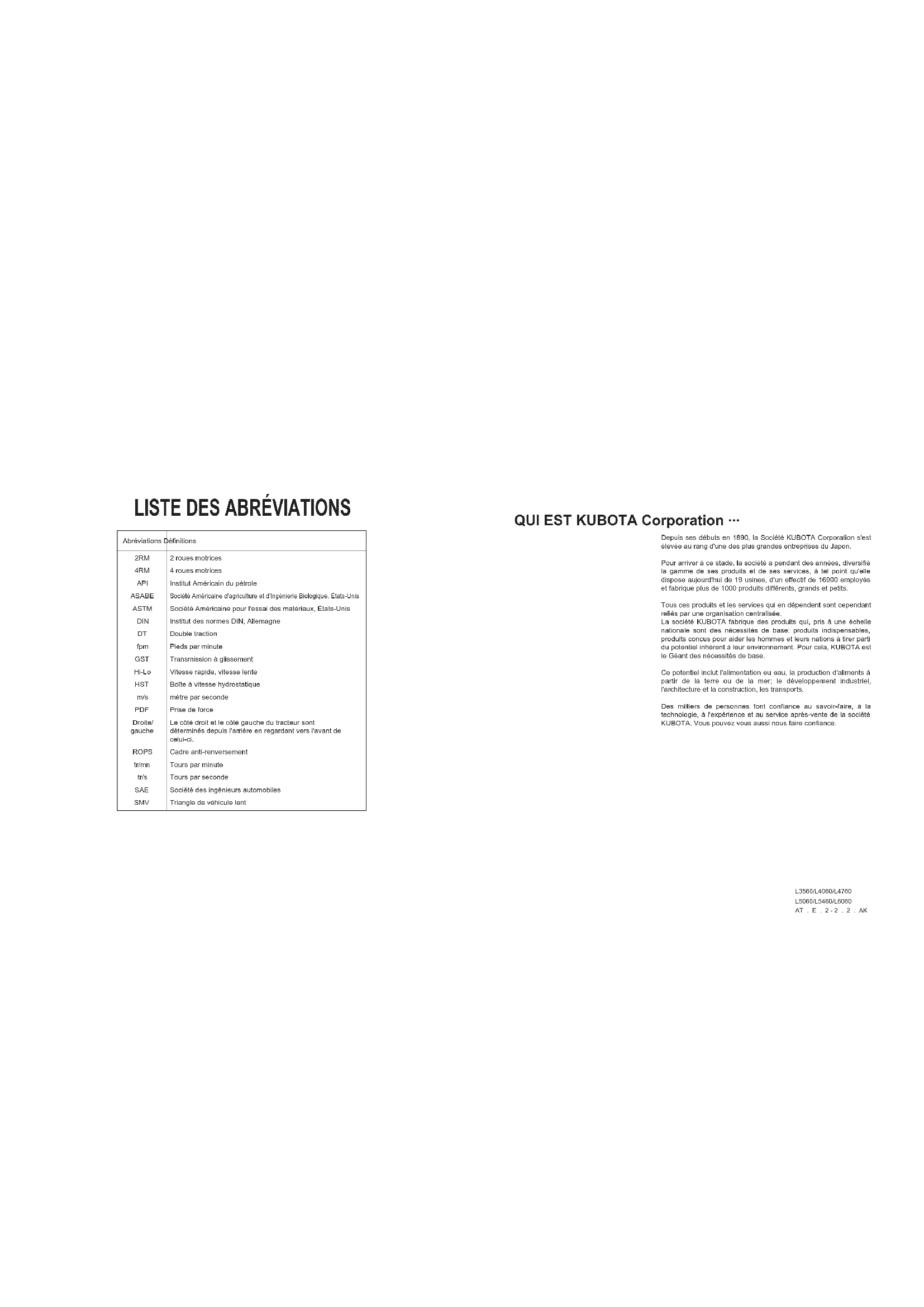 MANUEL A LIRE ET A CONSERVERQUI EST KUBOTA Corporation ··· Depuis ses débuts en 1890, la Société KUBOTA Corporation s'est élevée au rang d'une des plus grandes entreprises du Japon. Pour arriver à ce stade, la société a pendant des années, diversifié la gamme de ses produits et de ses services, à tel point qu'elle dispose aujourd'hui de 19 usines, d'un effectif de 16000 employés et fabrique plus de 1000 produits différents, grands et petits. Tous ces produits et les services qui en dépendent sont cependant reliés par une organisation centralisée. La société KUBOTA fabrique des produits qui, pris à une échelle nationale sont des nécessités de base: produits indispensables, produits concus pour aider les hommes et leurs nations à tirer parti du potentiel inhérent à leur environnement. Pour cela, KUBOTA est le Géant des nécessités de base. Ce potentiel inclut l'alimentation eu eau, la production d'aliments à partir de la terre ou de la mer; le développement industriel, l'architecture et la construction, les transports. Des milliers de personnes font confiance au savoir-faire, à la technologie, à l'expérience et au service après-vente de la société KUBOTA. Vous pouvez vous aussi nous faire confiance. L3560/L4060/L4760 L5060/L5460/L6060 AT . E . 2 - 2 . 2 . AK Abréviations Définitions