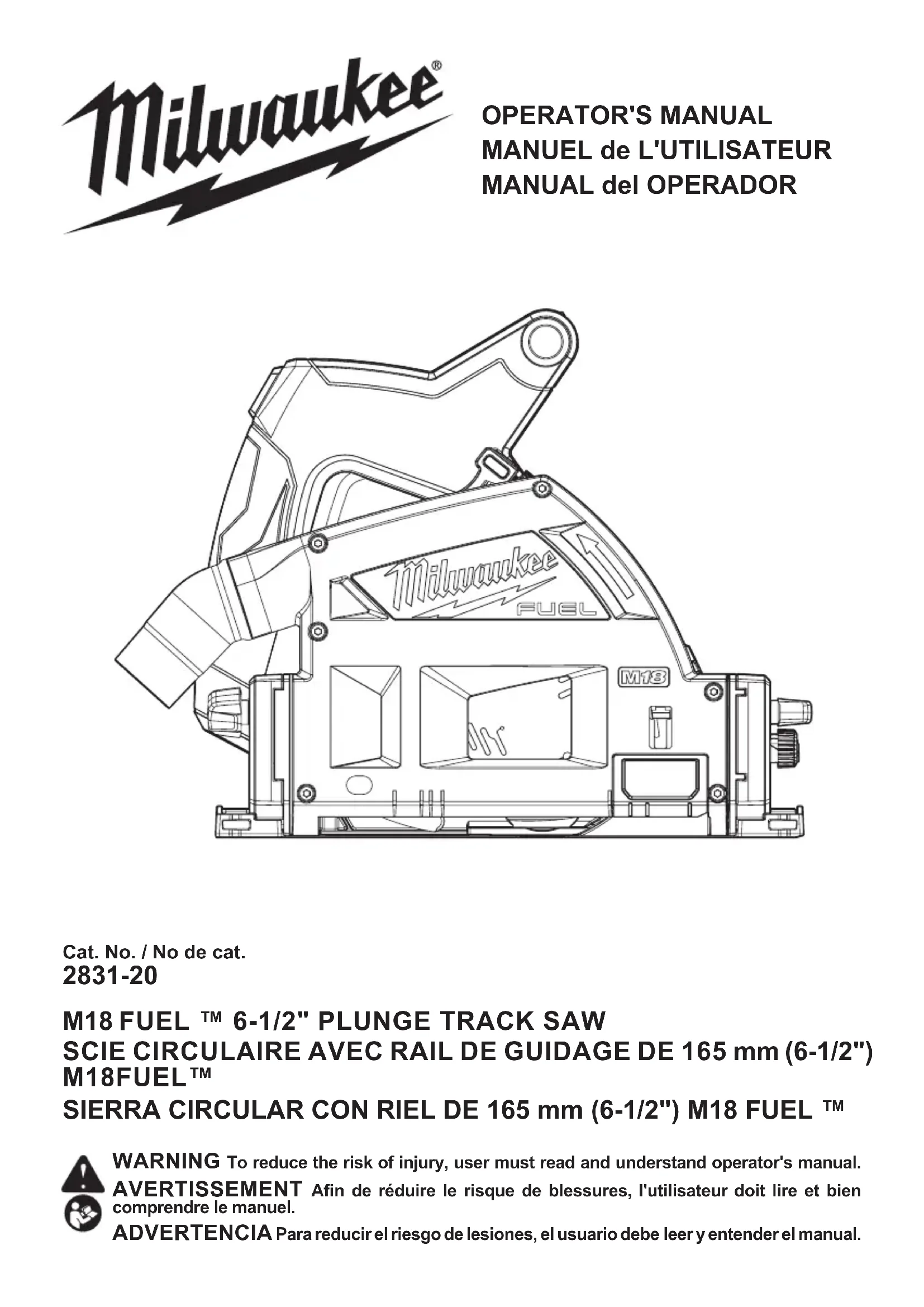 constater que la lame est complètement arrêtée et retourner la poignée avant dans sa position droite avant de déposer la scie. Coupes de perforage Une coupe de perforage sert à éviter l’éclatement de la pièce. Utiliser un rail de guidage pour eectuer des coupes de perforage. Eectuer une première coupe de perforage et ensuite, en eectuer une autre d’une profondeur de coupe normale. Pour dénir la profondeur de coupe de 1,5 mm (1/16") pour une coupe de perforage, pousser la butée de coupe de perforage vers l’avant. Pour déverrouiller, tirer sur la butée de coupe de perforage en arrière. Surcharge La surcharge constante pourra causer des dom- mages permanents dans l’outil ou le bloc-piles. Coupe de la maçonnerie et du métal Les scies circulaires de MILWAUKEE ne sont pas con- çues pour être utilisées de façon continue pour couper du métal ou des matériaux de maçonnerie. Pour couper ces types de matériaux, utiliser la lame appropriée. AVERTISSEMENT La poussière, les copeaux et les grains peuvent blo- quer la protection dans une position ouverte en tout temps. Si la scie doit servir à couper des matériaux de maçonnerie ou du métal, la réserv- er uniquement pour ce type d’opération et la retourner au centre d’entretien de MILWAUKEE an de la faire nettoyer et de la tester avant de l’utiliser pour couper du bois. Utiliser uniquement des accessoires dotés d’une cote de vitesse maximale qui est au moins égale à la vitesse de rotation (en r/min) inscrite sur la plaque signalétique de l’outil. Pour couper des matériaux de maçonnerie, uti- liser une lame de diamant. Faire des cannelures successives d’une profondeur de moins de 6 mm (1/4") an d’obtenir la profondeur désirée. Si la profondeur de coupe dépasse 6 mm (1/4"), la meule sera endommagée. Débrancher l’outil et enlever fréquemment la poussière des évents d’aération et des protège-lame.28 AVERTISSEMENT Ne pas utiliser l’outil pour couper du métal à prox- imité de matériaux inammables. Les étincelles peuvent provoquer un incendie. Pour couper du métal, utiliser une lame pour coupe de métal. Régler la profondeur de coupe au maxi- mum. S’assurer que toutes les personnes se trouvant à proximité sont à l’abri des étincelles. Coupe du plastique Lorsque des coupes sont eectuées dans du plas- tique, éviter la surchaue de la lame, ce qui ferait les dents de la lame fondre la pièce. ENTRETIEN AVERTISSEMENT Pour minimiser les risques de blessures corporelles, débranchez le chargeur et retirez la batterie du chargeur ou de l’outil avant d’y eectuer des travaux d’entretien. Ne démontez jamais l’outil, la batterie ou le chargeur. Pour toute réparation, consultez un centre de service MILWAUKEE ac- crédité. Entretien de l’outil Gardez l’outil en bon état en adoptant un programme d’entretien ponctuel. Inspectez votre outil pour des questions telles que le bruit excessif, de grippage des pièces mobiles, de pièces cassées ou toute autre condition qui peut aecter le fonctionnement de l'outil. Retournez votre outil à un centre de service MILWAUKEE accrédité pour obtenir le service. Après une période pouvant aller de 6 mois à un an, selon l’usage, retournez votre outil à un centre de service MILWAUKEE accrédité pour d'inspection. Si l’outil ne démarre pas ou ne fonctionne pas à pleine puissance alors qu’il est branché sur une batterie complètement chargée, nettoyez les points de contact entre la batterie et l’outil. Si l’outil ne fonctionne toujours pas correctement, renvoyez l’outil, le chargeur et la batterie à un centre de service MILWAUKEE accrédité. AVERTISSEMENT Pour minimiser les risques de blessures ou de dom- mages à l'outil, n'immergez jamais l'outil, la bat- terie ou le chargeur et ne laissez pas de liquide s'y inltrer. Nettoyage Débarrassez les tous évents des débris et de la poussière. Gardez les outil propres, à sec et ex- emptes d’huile ou de graisse. Le nettoyage doit se faire avec un linge humide et un savon doux. Certains nettoyants tels l’essence, la térébenthine, les diluants à laque ou à peinture, les solvants chlorés, l’ammoniaque et les détergents d’usage domestique qui en contiennent pourraient détériorer le plastique et l’isolation des pièces. Ne laissez jamais de solvants inammables ou combustibles auprès des outils. Réparations Pour les réparations, retournez outil, batterie et chargeur en entier au centre-service autorisé le plus près. ACCESOIRES AVERTISSEMENT L’utilisation d’autres ac- cessoires que ceux qui sont spécifiquement recommandés pour cet outil peut comporter des risques. Pour une liste complète des accessoires, visiter le site internet www.milwaukeetool.com ou contactez un distributeur.