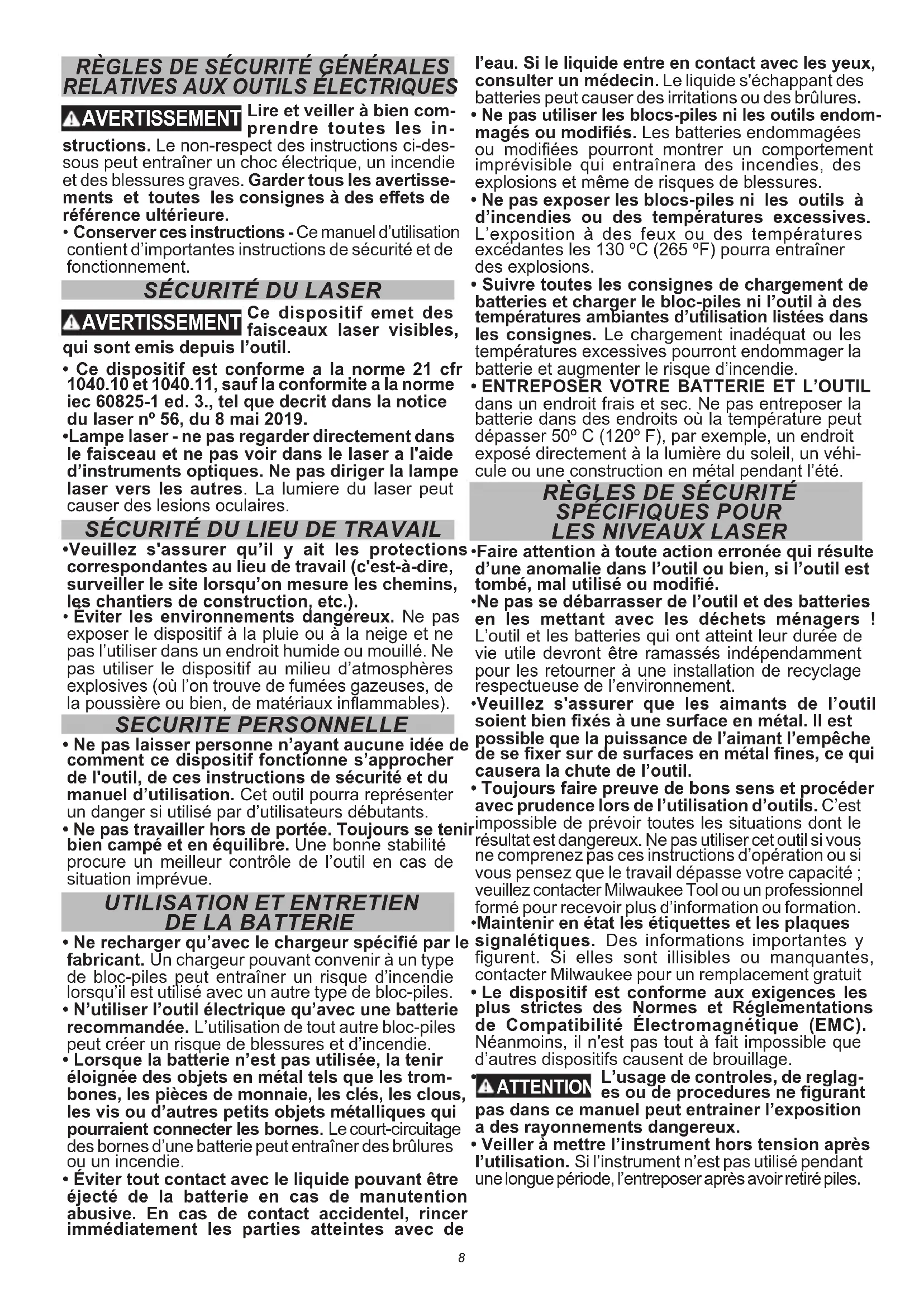 - Toujours faire preuve de bons sens et procéder avec prudence lors de l’utilisation d’outils. C’est impossible de prévoir toutes les situations dont le résultat est dangereux. Ne pas utiliser cet outil si vous ne comprenez pas ces instructions d’opération ou si vous pensez que le travail dépasse votre capacité ; veuillez contacter Milwaukee Tool ou un professionnel formé pour recevoir plus d’information ou formation.