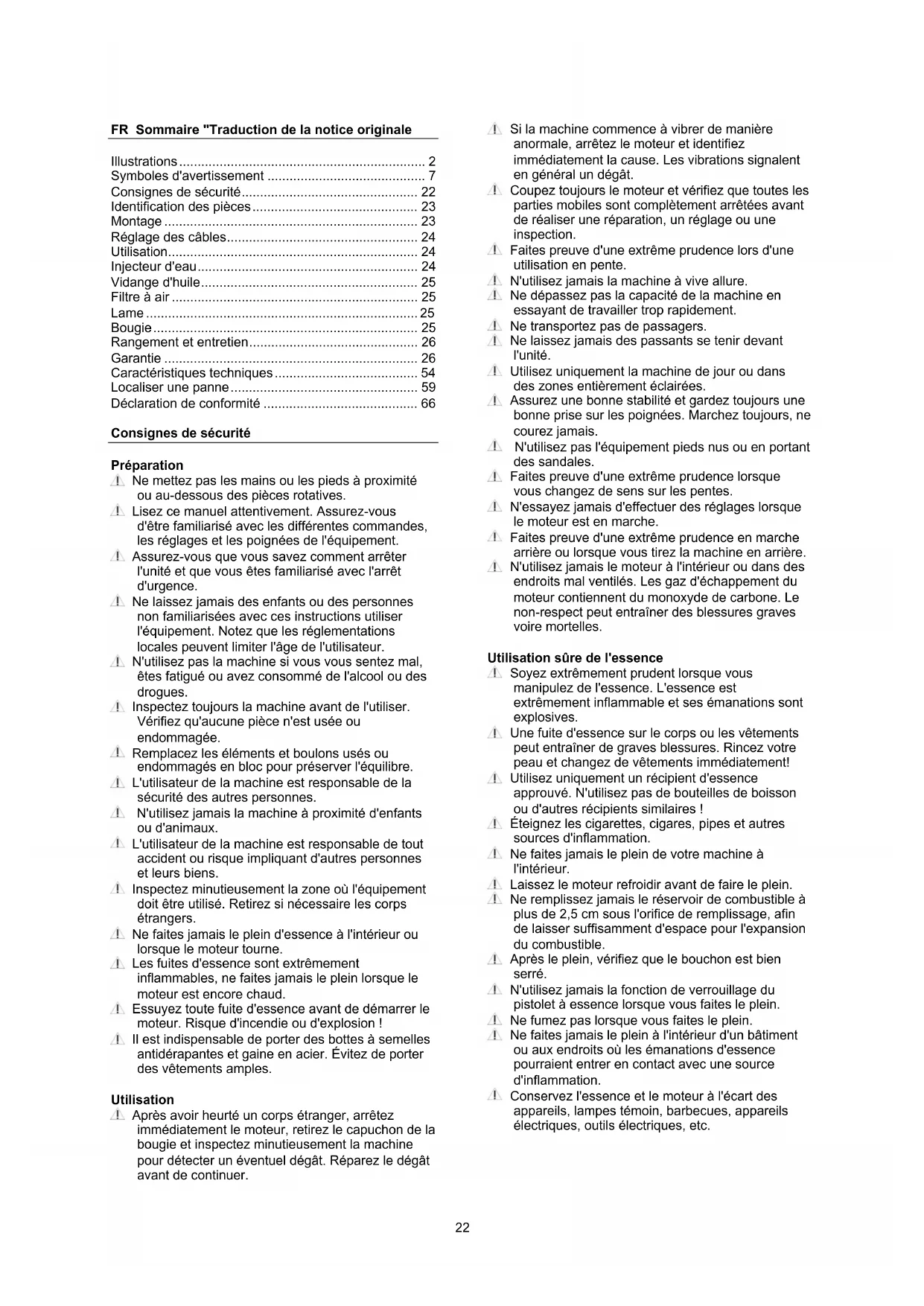 - Déclaration de conformité Consignes de sécurité Préparation Ne mettez pas les mains ou les pieds à proximité ou au-dessous des pièces rotatives. Lisez ce manuel attentivement. Assurez-vous d'être familiarisé avec les différentes commandes, les réglages et les poignées de l'équipement. Assurez-vous que vous savez comment arrêter l'unité et que vous êtes familiarisé avec l'arrêt d'urgence. Ne laissez jamais des enfants ou des personnes non familiarisées avec ces instructions utiliser l'équipement. Notez que les réglementations locales peuvent limiter l'âge de l'utilisateur. N'utilisez pas la machine si vous vous sentez mal, êtes fatigué ou avez consommé de l'alcool ou des drogues. Inspectez toujours la machine avant de l'utiliser. Vérifiez qu'aucune pièce n'est usée ou endommagée. Remplacez les éléments et boulons usés ou endommagés en bloc pour préserver l'équilibre. L'utilisateur de la machine est responsable de la sécurité des autres personnes. N'utilisez jamais la machine à proximité d'enfants ou d'animaux. L'utilisateur de la machine est responsable de tout accident ou risque impliquant d'autres personnes et leurs biens. Inspectez minutieusement la zone où l'équipement doit être utilisé. Retirez si nécessaire les corps étrangers. Ne faites jamais le plein d'essence à l'intérieur ou lorsque le moteur tourne. Les fuites d'essence sont extrêmement inflammables, ne faites jamais le plein lorsque le moteur est encore chaud. Essuyez toute fuite d'essence avant de démarrer le moteur. Risque d'incendie ou d'explosion ! Il est indispensable de porter des bottes à semelles antidérapantes et gaine en acier. Évitez de porter des vêtements amples. Utilisation Après avoir heurté un corps étranger, arrêtez immédiatement le moteur, retirez le capuchon de la bougie et inspectez minutieusement la machine pour détecter un éventuel dégât. Réparez le dégât avant de continuer. Si la machine commence à vibrer de manière anormale, arrêtez le moteur et identifiez immédiatement la cause. Les vibrations signalent en général un dégât. Coupez toujours le moteur et vérifiez que toutes les parties mobiles sont complètement arrêtées avant de réaliser une réparation, un réglage ou une inspection. Faites preuve d'une extrême prudence lors d'une utilisation en pente. N'utilisez jamais la machine à vive allure. Ne dépassez pas la capacité de la machine en essayant de travailler trop rapidement. Ne transportez pas de passagers. Ne laissez jamais des passants se tenir devant l'unité. Utilisez uniquement la machine de jour ou dans des zones entièrement éclairées. Assurez une bonne stabilité et gardez toujours une bonne prise sur les poignées. Marchez toujours, ne courez jamais. N'utilisez pas l'équipement pieds nus ou en portant des sandales. Faites preuve d'une extrême prudence lorsque vous changez de sens sur les pentes. N'essayez jamais d'effectuer des réglages lorsque le moteur est en marche. Faites preuve d'une extrême prudence en marche arrière ou lorsque vous tirez la machine en arrière. N'utilisez jamais le moteur à l'intérieur ou dans des endroits mal ventilés. Les gaz d'échappement du moteur contiennent du monoxyde de carbone. Le non-respect peut entraîner des blessures graves voire mortelles. Utilisation sûre de l'essence Soyez extrêmement prudent lorsque vous manipulez de l'essence. L'essence est extrêmement inflammable et ses émanations sont explosives. Une fuite d'essence sur le corps ou les vêtements peut entraîner de graves blessures. Rincez votre peau et changez de vêtements immédiatement! Utilisez uniquement un récipient d'essence approuvé. N'utilisez pas de bouteilles de boisson ou d'autres récipients similaires ! Éteignez les cigarettes, cigares, pipes et autres sources d'inflammation. Ne faites jamais le plein de votre machine à l'intérieur. Laissez le moteur refroidir avant de faire le plein. Ne remplissez jamais le réservoir de combustible à plus de 2,5 cm sous l'orifice de remplissage, afin de laisser suffisamment d'espace pour l'expansion du combustible. Après le plein, vérifiez que le bouchon est bien serré. N'utilisez jamais la fonction de verrouillage du pistolet à essence lorsque vous faites le plein. Ne fumez pas lorsque vous faites le plein. Ne faites jamais le plein à l'intérieur d'un bâtiment ou aux endroits où les émanations d'essence pourraient entrer en contact avec une source d'inflammation. Conservez l'essence et le moteur à l'écart des appareils, lampes témoin, barbecues, appareils électriques, outils électriques, etc.23 Entretien et rangement Le moteur doit être coupé lors des travaux de maintenance et de nettoyage, du changement d'outils et du transport par d'autres moyens que son propre déplacement. Vérifiez régulièrement que tous les boulons et écrous sont serrés. Resserrez-les si nécessaire. Le moteur doit être complètement refroidi avant d'être rangé à l'intérieur ou couvert. Si la machine n'est pas utilisée pendant un certain temps, veuillez consulter les consignes de ce manuel. Si nécessaire, les étiquettes de sécurité et de consignes doivent être entretenues et remplacées. Utilisez uniquement des pièces de rechange ou accessoires d'origine. En cas d'utilisation d'autres pièces ou accessoires, la responsabilité ne s'applique plus. Divers Le moteur n'est pas livré avec le plein d'huile. Les dispositifs de commande ajustés en usine, comme le câble d'embrayage monté sur la poignée, ne doivent pas être retirés ou mis à jour. Ne purgez le réservoir de combustible qu'à l'extérieur. L'essence est extrêmement inflammable et ses émanations sont explosives. Vérifiez que la machine est bien sécurisée lors de son transport sur une plate-forme, etc. Les déchets de produits électriques ne doivent pas être jetés avec les déchets domestiques. Ils doivent être déposés dans votre centre de recyclage local pour un t