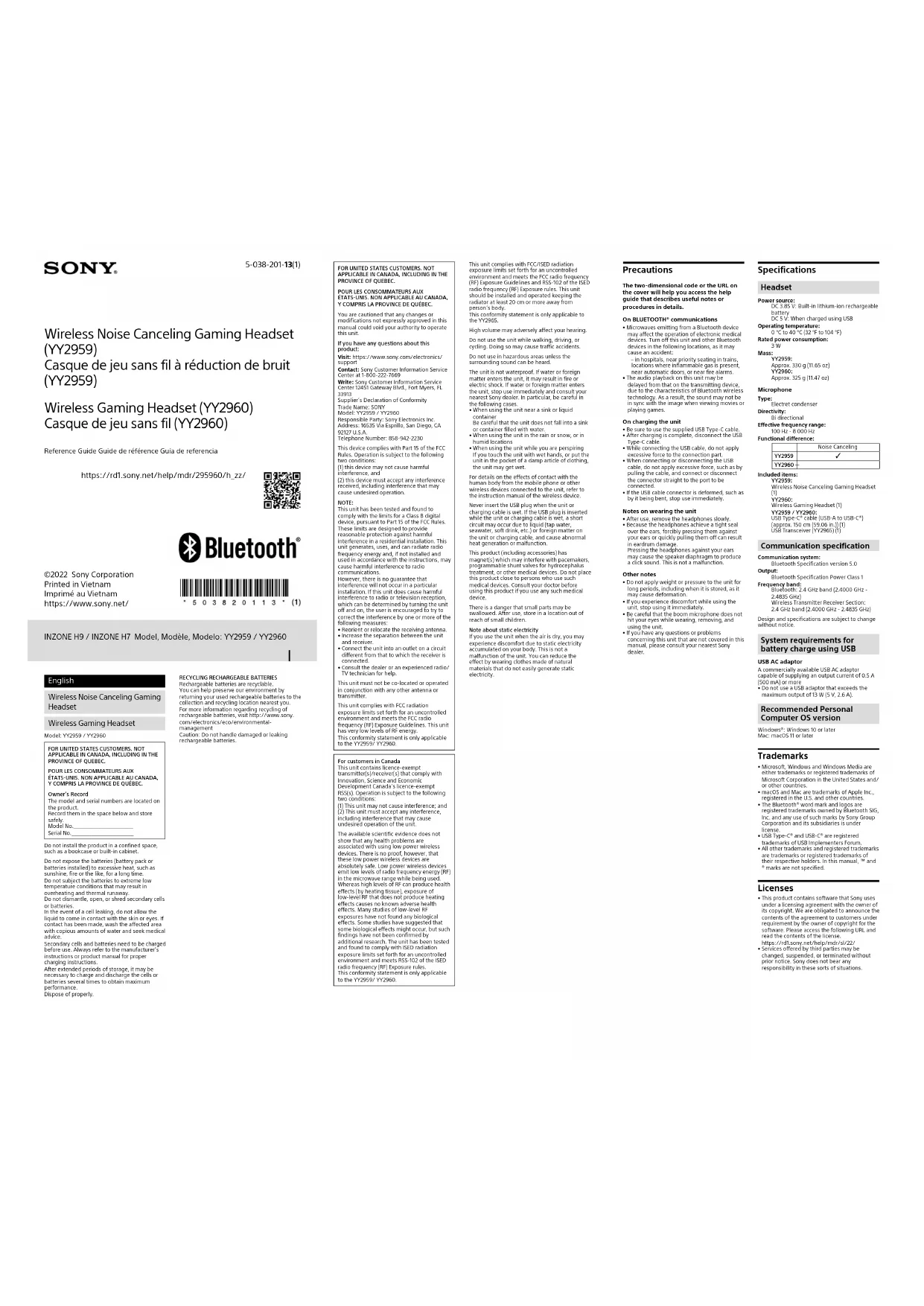 - This product contains software that Sony uses under a licensing agreement with the owner of its copyright. We are obligated to announce the contents of the agreement to customers under requirement by the owner of copyright for the software. Please access the following URL and read the contents of the license.https://rd1.sony.net/help/mdr/sl/22/• Services offered by third parties may be changed, suspended, or terminated without prior notice. Sony does not bear any responsibility in these sorts of situations.Français Casque de jeu sans fil à réduction de bruit Casque de jeu sans fil Modèle: YY2959 / YY2960 N’installez pas le produit dans un espace clos, comme une bibliothèque ou une armoire encastrée. N’exposez pas les piles (bloc-batterie ou piles installées) à une chaleur excessive, telle que le soleil, un feu ou autre, pendant une longue période. Ne soumettez pas les batteries à des conditions de température extrêmement basses qui pourraient entraîner une surchauffe et un emballement thermique. Ne démontez pas, n’ouvrez pas et ne détruisez pas les accumulateurs ou les batteries. En cas de fuite d’un accumulateur, ne laissez pas le liquide entrer en contact avec la peau ou les yeux. Si un contact a été établi, lavez la zone touchée avec de grandes quantités d’eau et consultez un médecin. Les accumulateurs et les batteries doivent être chargés avant d’être utilisés. Reportez-vous toujours aux instructions du fabricant ou au manuel du produit pour obtenir des instructions de chargement pertinentes. Après de longues périodes de stockage, il peut être nécessaire de charger et de décharger les accumulateurs ou les batteries plusieurs fois pour obtenir une performance maximale. Mettez au rebut correctement.