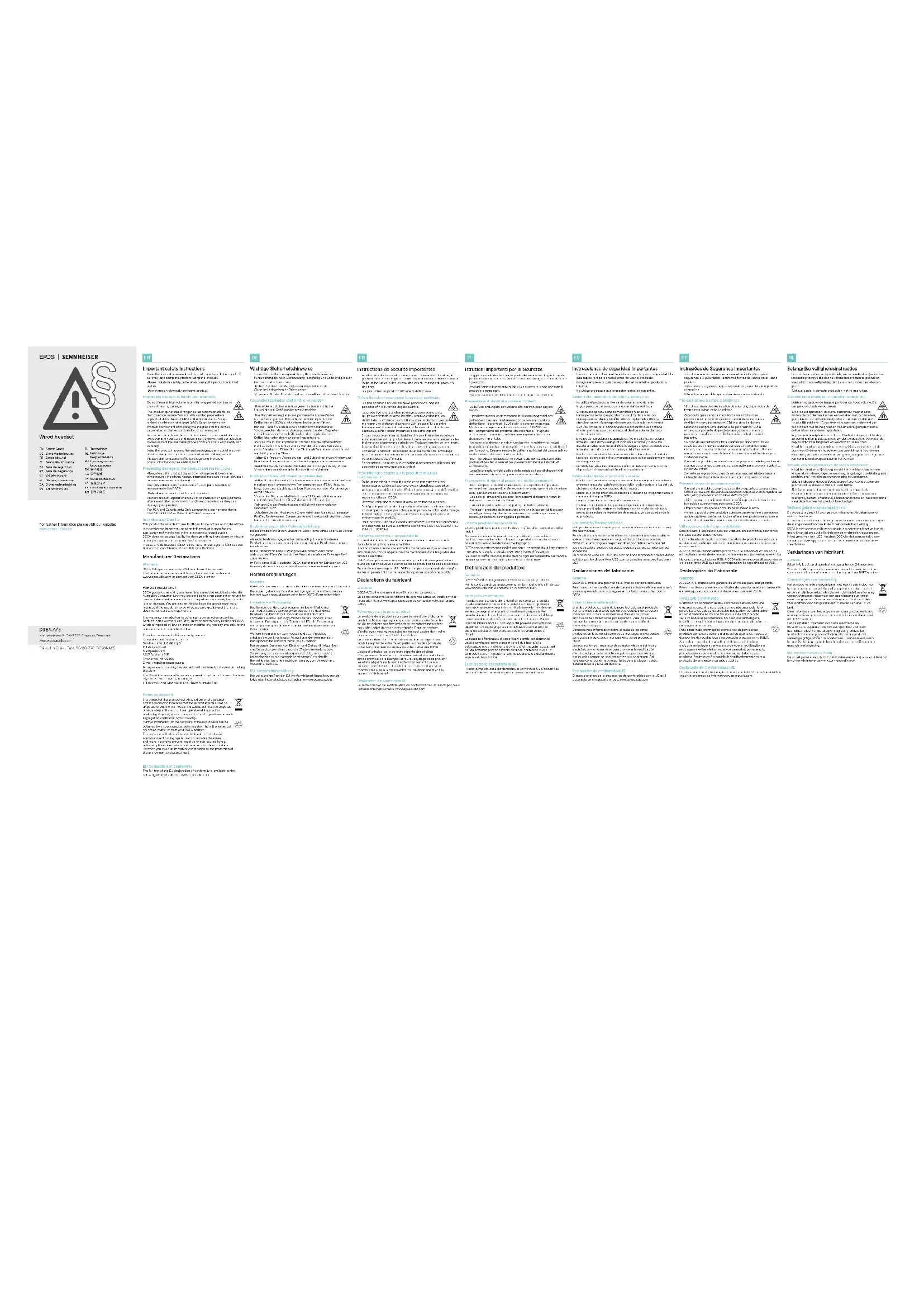 Instructions de sécurité importantes Veuillez lire attentivement et entièrement le manuel d’utilisation, le guide de sécurité et le guide rapide (fourni) avant d’utiliser le produit. Toujours inclure ce guide de sécurité lors du passage du produit à des tiers. Ne pas utiliser un produit visiblement défectueux. Prévention des risques pour la santé et accidents Ne pas écouter à un volume élevé pendant de longues périodes an d‘éviter les dégâts auditifs. Le produit génère des champs magnétiques permanents qui peuvent interférer avec les stimulateurs cardiaques, les débrillateurs implantables (DCI) et autres implants. Toujours maintenir une distance d’au moins 3,94 pouces/10 cm entre le composant du produit qui contient l’aimant et le stimulateur cardiaque, débrillateur implantable ou autre implant. En cas d’écouteurs intra-auriculaires : Ne pas insérer les écouteurs intra-auriculaires trop profondément dans les oreilles et ne jamais les insérer sans adaptateurs auriculaires. Toujours extraire les écouteurs intra-auriculaires de vos oreilles doucement et soigneusement. Conserver le produit, les accessoires et les parties de l’emballage hors de portée des enfants et des animaux an d’éviter les accidents et les risques d’étouement. Se reporter au code de la route national concernant l’utilisation des appareils de communication au volant. Prévention des dégâts sur le produit et mauvais fonctionnement Toujours maintenir le produit au sec et ne pas exposer à des températures extrêmes (sèche-cheveux, chauage, exposition prolongée au soleil, etc.) an d‘éviter toute corrosion ou déformation. Utiliser uniquement les raccordements/accessoires fournis ou recommandés par DSEA. Nettoyer uniquement le produit avec un chion doux et sec. Protéger le produit contre les produits chimiques contenus dans les cosmétiques, la laque pour cheveux, le parfum, la lotion après-rasage, la lotion solaire et les répulsifs anti-insectes puisqu’ils peuvent endommager le produit. Pour les États-Unis et le Canada uniquement: Brancher uniquement à un téléphone de bureau conforme à la norme CSA / UL 60950-1 ou CSA / UL 62368-1. Utilisation conforme / responsabilité Ce produit est adapté aux bureaux professionnels, aux bureaux à domicile ainsi qu’aux bureaux mobiles.Il est considéré comme une utilisation incorrecte lorsque ce produit est utilisé pour toute application non mentionnée dans les guides des produits associés.DSEA n‘accepte aucune responsabilité pour les dommages résultant d‘une utilisation abusive ou erronée de ce produit et de ses accessoires.En cas de micro-casque USB : DSEA n‘est pas responsable des dégâts sur les appareils USB qui ne respectent pas les spécications USB. Déclarations du fabricant Garantie DSEA A/S ore une garantie de 24 mois sur ce produit.En ce qui concerne les conditions de garantie actuelles, veuillez visiter notre site Internet www.eposaudio.com ou contacter votre partenaire DSEA. Remarques sur la mise au rebut Le symbole de la poubelle sur roues barrée d‘une croix sur le produit et l‘emballage signie que ces produits, arrivés en n de vie, ne doivent pas être jetés dans les ordures ménagères, mais faire l‘objet d‘une collecte séparée. Pour les déchets d‘emballages, veuillez respecter les lois applicables dans votre pays en matière de tri sélectif des déchets.Vous obtiendrez plus d‘informations sur le recyclage de ces produits auprès de votre municipalité, auprès des points de collecte communaux ou auprès de votre partenaire DSEAL‘objectif principal de la collecte séparée des déchets d‘équipements électriques et électroniques et des emballages est de promouvoir le réemploi et/ou le recyclage et de prévenir les eets négatifs sur la santé et l‘environnement dus aux polluants potentiellement contenus dans ces produits. Vous contribuerez ainsi à la préservation de l‘environnement et à la protection de la santé.