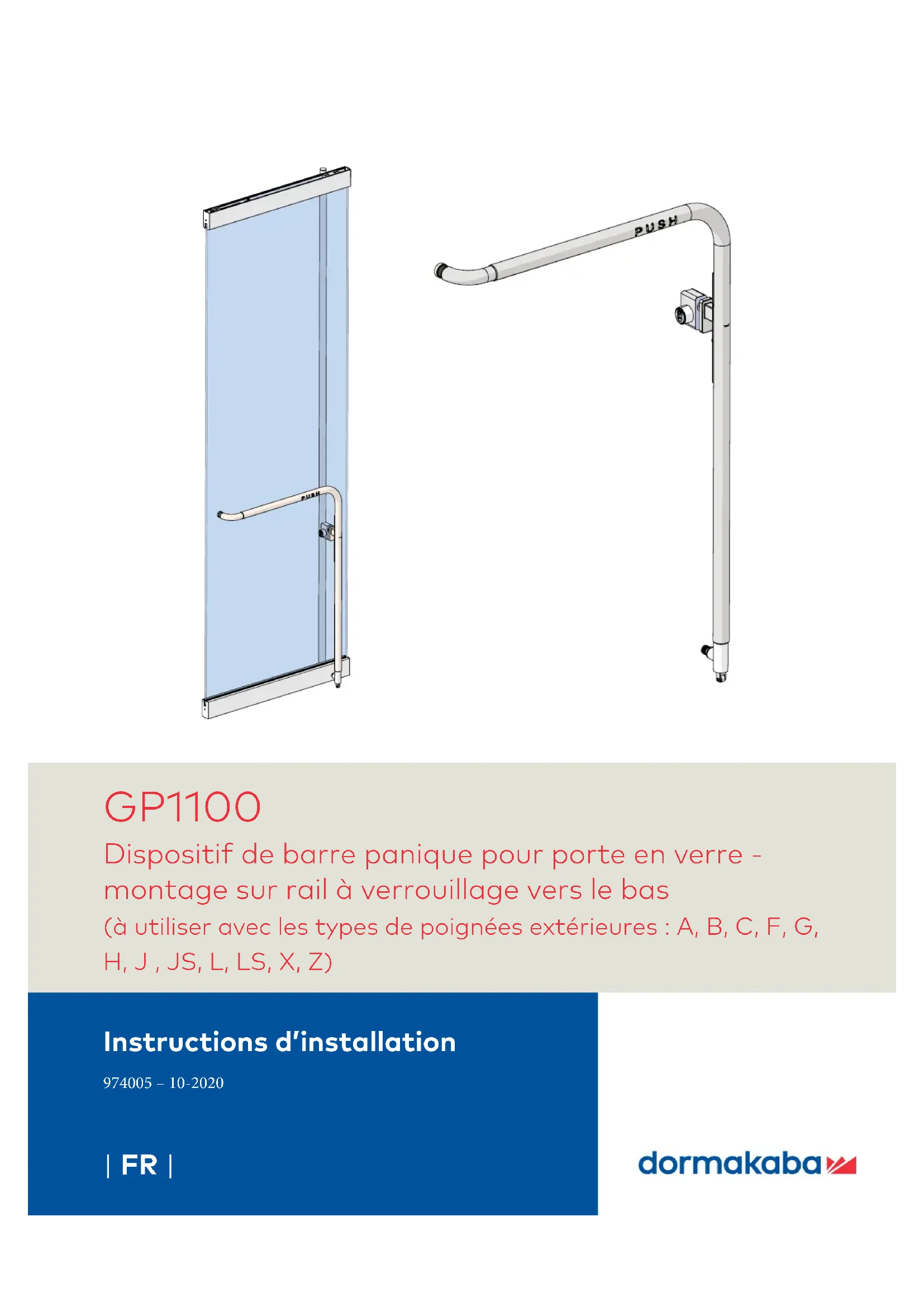 GP1100 Dispositif de barre panique pour porte en verre - montage sur rail à verrouillage vers le bas (à utiliser avec les types de poignées extérieures: A, B, C, F, G, H, J , JS, L, LS, X, Z) Instructions d’installation 974005 – 10-2020 | FR |2 GP1100 Barre panique pour porte en verre 10-2020