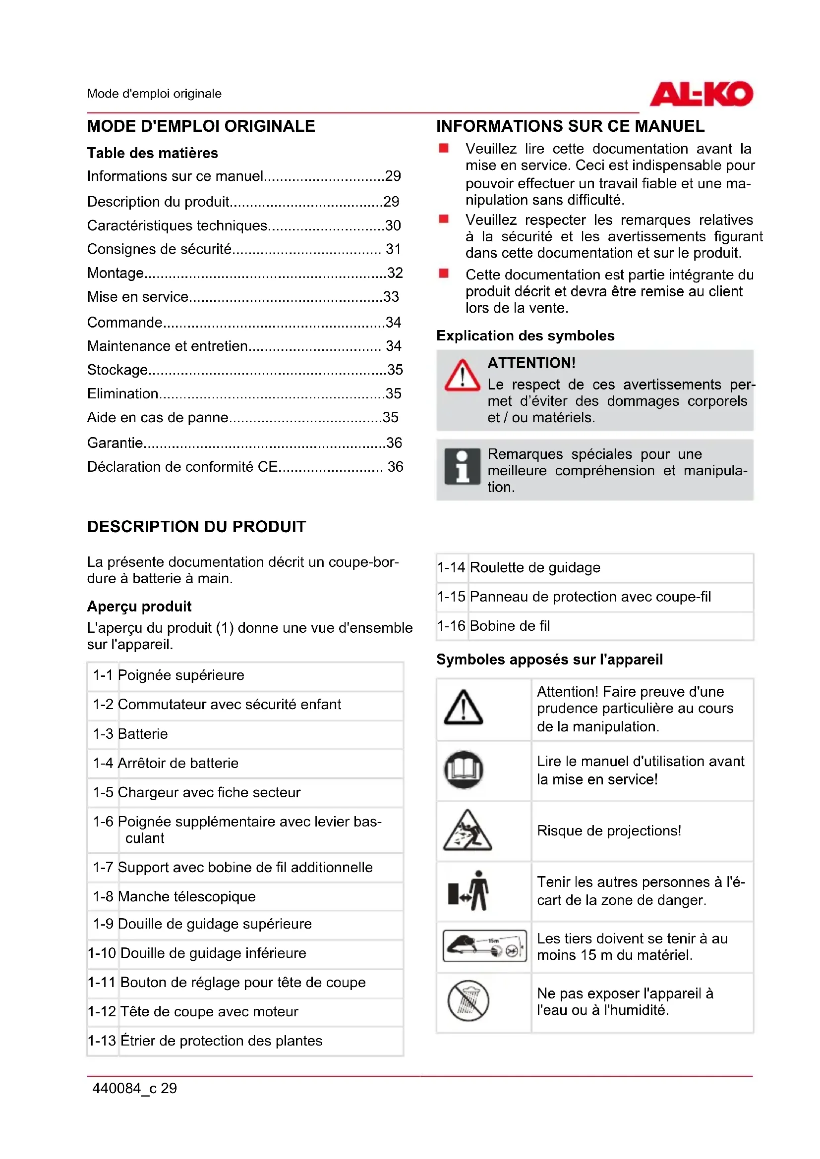 Nous déclarons par la présente que ce produit, dans la version que nous avons mise sur le marché, répond aux exigences des directives UE harmonisées, aux normes standards de sécurité UE et aux standards spécifiques au produit. Produit Fabricant Fondé de pouvoir Coupe-bordure à batterie Type GTLi 18V AL-KO Geräte GmbH Ichenhauser Str. 14 D-89359 Kötz Andreas Hedrich Ichenhauser Str. 14 D-89359 Kötz Numéro de série Directives UE Normes harmonisées G130130 Niveau sonore EN ISO 3744 mesuré / garanti 90 / 92 dB(A) 2006/42/CE 2014/30/UE 2000/14/CE 2014/35/UE 2011/65/UE EN 60745-1 EN 786 EN 55014-1 EN 55014-2 EN 61000-3-2 EN 61000-3-3 EN 60335-1 EN 60335-2-29 EN 62233 Organisme notifié Évaluation de la conformité Kötz, 23.06.2016 Société Nationale de Certification et d'Homologation N° 0499 2000/14/CE appendice VI Wolfgang Hergeth Managing DirectorInstrucciones de uso originales 440084_c 37