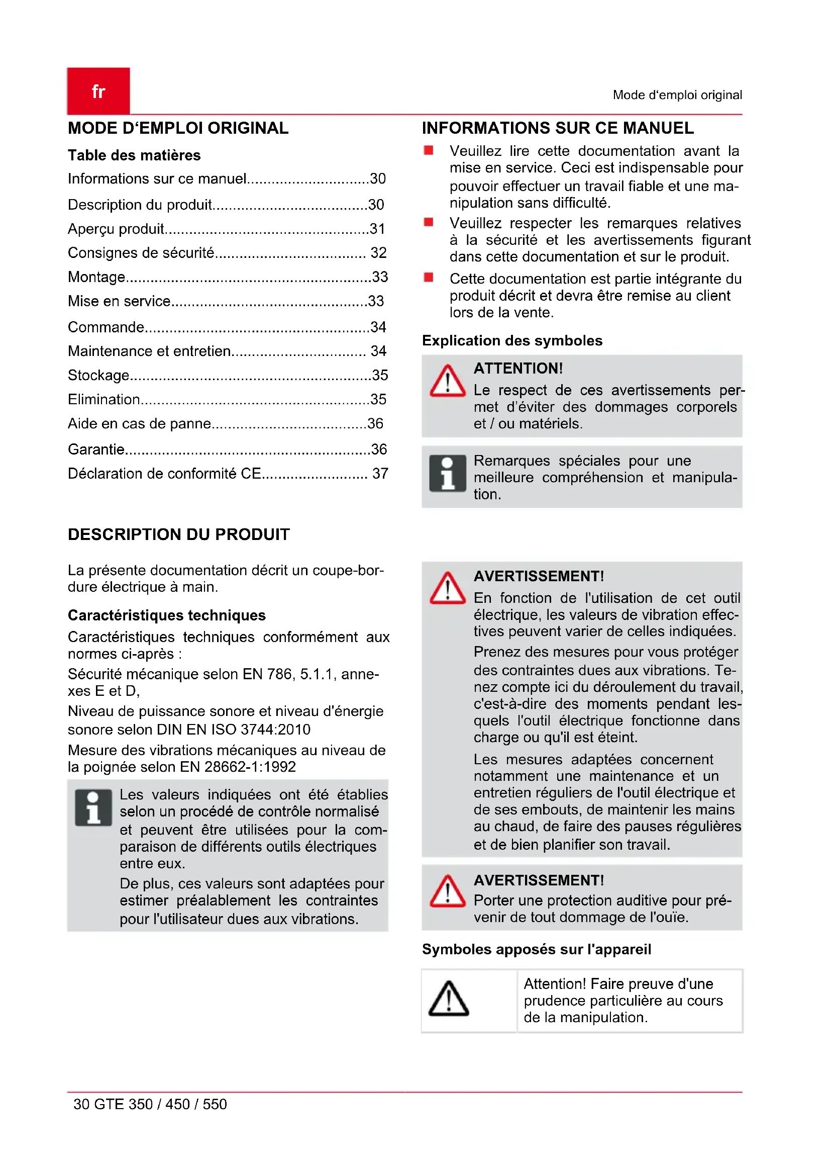La présente documentation décrit un coupe-bor- dure électrique à main. Caractéristiques techniques Caractéristiques techniques conformément aux normes ci-après : Sécurité mécanique selon EN 786, 5.1.1, anne- xes E et D, Niveau de puissance sonore et niveau d'énergie sonore selon DIN EN ISO 3744:2010 Mesure des vibrations mécaniques au niveau de la poignée selon EN 28662-1:1992 ADVICE Les valeurs indiquées ont été établies selon un procédé de contrôle normalisé et peuvent être utilisées pour la com- paraison de différents outils électriques entre eux. De plus, ces valeurs sont adaptées pour estimer préalablement les contraintes pour l'utilisateur dues aux vibrations. AVERTISSEMENT! En fonction de l'utilisation de cet outil électrique, les valeurs de vibration effec- tives peuvent varier de celles indiquées. Prenez des mesures pour vous protéger des contraintes dues aux vibrations. Te- nez compte ici du déroulement du travail, c'est-à-dire des moments pendant les- quels l'outil électrique fonctionne dans charge ou qu'il est éteint. Les mesures adaptées concernent notamment une maintenance et un entretien réguliers de l'outil électrique et de ses embouts, de maintenir les mains au chaud, de faire des pauses régulières et de bien planifier son travail. AVERTISSEMENT! Porter une protection auditive pour pré- venir de tout dommage de l'ouïe. Symboles apposés sur l'appareil Attention! Faire preuve d'une prudence particulière au cours de la manipulation.Description du produit 440083_c 31 Lire le manuel d'utilisation avant la mise en service! Risque de projections! Tenir les autres personnes à l'é- cart de la zone de danger. Les tiers doivent se tenir à au moins 15 m du matériel. Ne pas exposer l'appareil à l'eau ou à l'humidité. Porter des lunettes et un cas- que de protection, ainsi que des protections auditives. Veuillez immédiatement débran- cher la fiche du secteur si le câble de rallonge a été dété- rioré ou sectionné ! Manche télescopique réglable Le coupe-bordure est équipé d'un manche téle- scopique réglable. Celui-ci permet de régler l'ap- pareil à la taille individuel de l'opérateur et la tête motorisée peut être pivotée. Tête de coupe pivotante et réglable Les modèles GTE 450 et 550 sont équipés d'une tête de coupe pivotante et réglable en inclinaison. Réglage automatique de la longueur de fil La tête de coupe comporte un système de réglage automatique (8-4) permettant de rallonger le fil de coupe lorsque le moteur est en marche. Dispositifs de sécurité et de protection Sécurité enfant L'alésage (5 mm) au niveau du disjoncteur de pro- tection moteur est prévu pour un cadenas. Le ca- denas permet d'éviter un déclenchement inopiné de l'appareil.