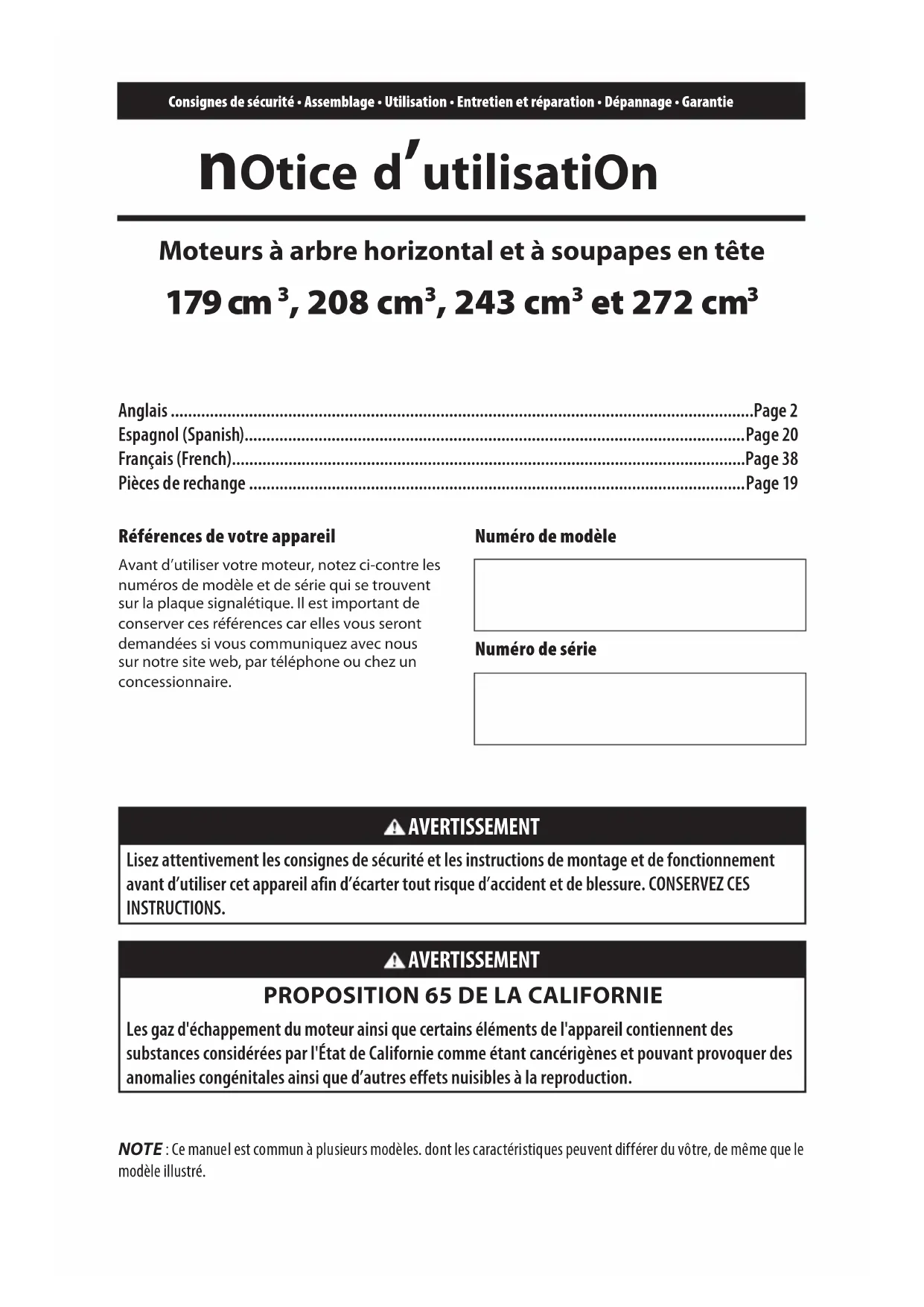 Les gaz d'échappement du moteur ainsi que certains éléments de l'appareil contiennent des substances considérées par l'État de Californie comme étant cancérigènes et pouvant provoquer des anomalies congénitales ainsi que d’autres effets nuisibles à la reproduction.Références de votre appareilAvant d’utiliser votre moteur, notez ci-contre les numéros de modèle et de série qui se trouvent sur la plaque signalétique. Il est important de conserver ces références car elles vous seront demandées si vous communiquez avec nous sur notre site web, par téléphone ou chez un concessionnaire.Numéro de modèleNuméro de série Anglais ......................................................................................................................................Page 2 Espagnol (Spanish)...................................................................................................................Page 20 Français (French) ......................................................................................................................Page 38 Pièces de rechange ..................................................................................................................Page 1939 Consignes de sécurité importantes FORMATION