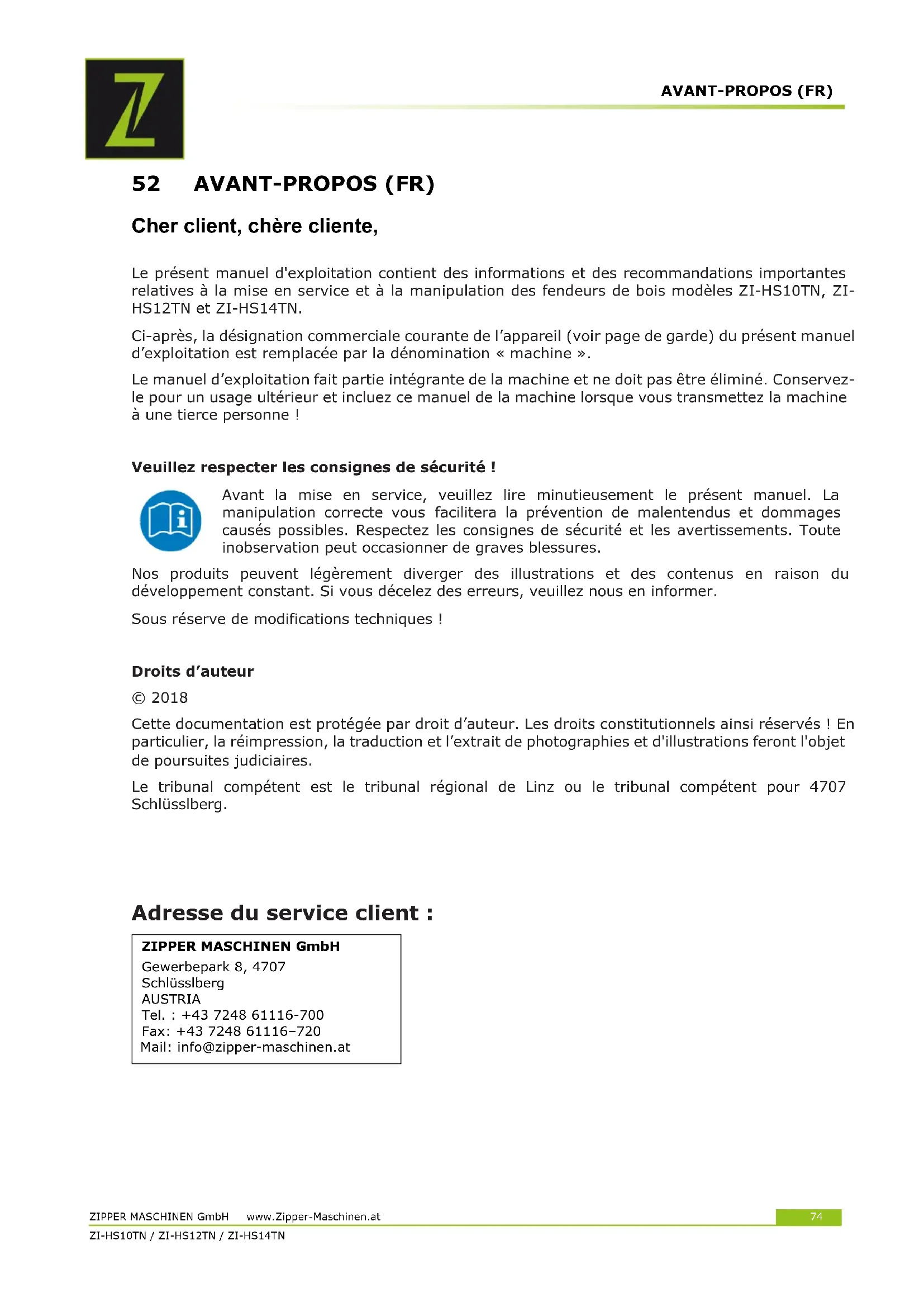 ¡Todas las reparaciones de esta máquina deben ser realizadas por un especialista para ese producto!AVANT-PROPOS (FR) ZIPPER MASCHINEN GmbH www.Zipper-Maschinen.at 74 ZI-HS10TN / ZI-HS12TN / ZI-HS14TN 52 AVANT-PROPOS (FR) Cher client, chère cliente, Le présent manuel d'exploitation contient des informations et des recommandations importantes relatives à la mise en service et à la manipulation des fendeurs de bois modèles ZI-HS10TN, ZI- HS12TN et ZI-HS14TN. Ci-après, la désignation commerciale courante de l’appareil (voir page de garde) du présent manuel d’exploitation est remplacée par la dénomination « machine ». Le manuel d’exploitation fait partie intégrante de la machine et ne doit pas être éliminé. Conservez- le pour un usage ultérieur et incluez ce manuel de la machine lorsque vous transmettez la machine à une tierce personne ! Veuillez respecter les consignes de sécurité ! Avant la mise en service, veuillez lire minutieusement le présent manuel. La manipulation correcte vous facilitera la prévention de malentendus et dommages causés possibles. Respectez les consignes de sécurité et les avertissements. Toute inobservation peut occasionner de graves blessures. Nos produits peuvent légèrement diverger des illustrations et des contenus en raison du développement constant. Si vous décelez des erreurs, veuillez nous en informer. Sous réserve de modifications techniques ! Droits d’auteur © 2018 Cette documentation est protégée par droit d’auteur. Les droits constitutionnels ainsi réservés ! En particulier, la réimpression, la traduction et l’extrait de photographies et d'illustrations feront l'objet de poursuites judiciaires. Le tribunal compétent est le tribunal régional de Linz ou le tribunal compétent pour 4707 Schlüsslberg.