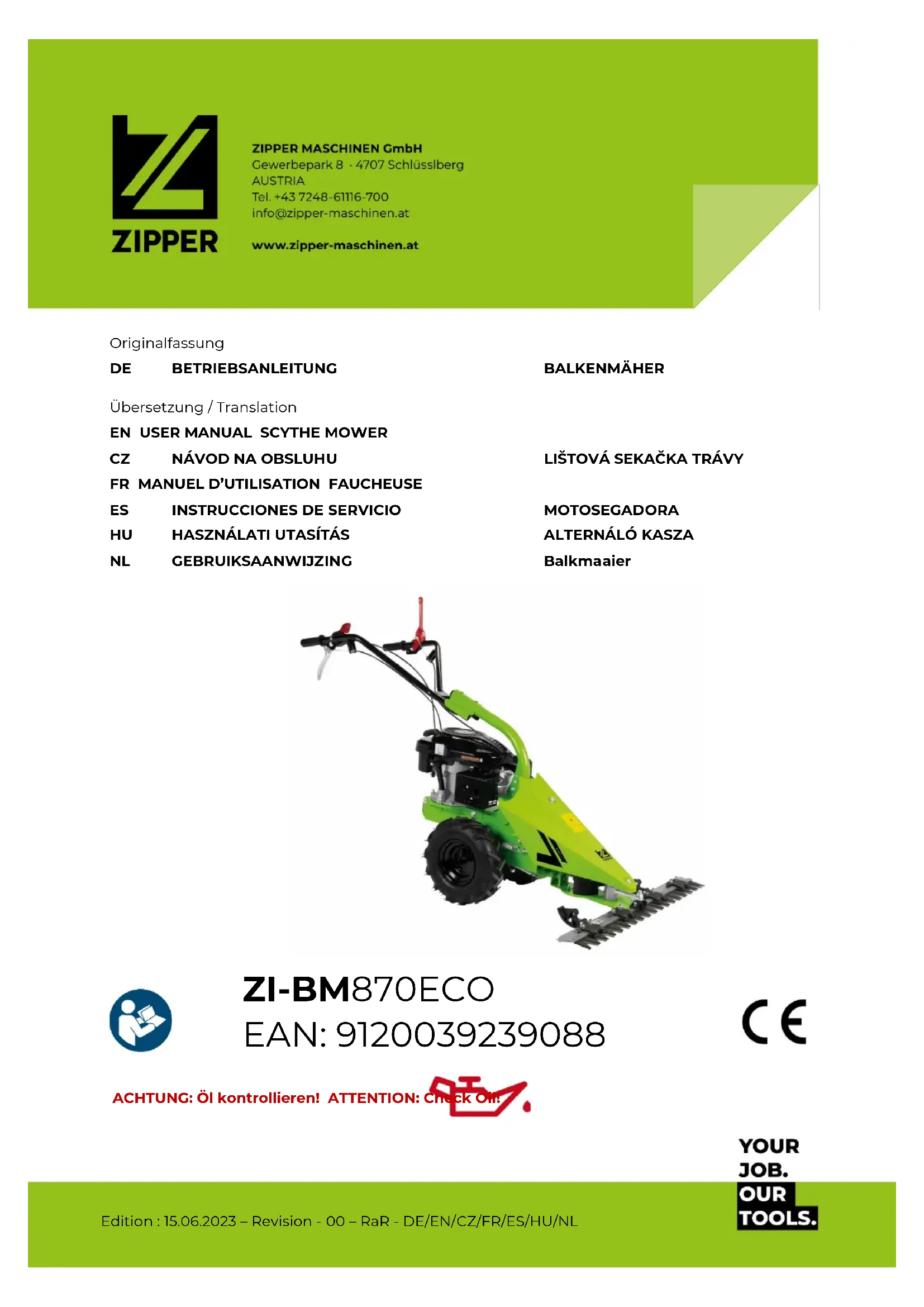 Téléchargez la notice de votre Tondeuse à gazon au format PDF gratuitement ! Retrouvez votre notice ZIBM870ECO - Zipper et reprennez votre appareil électronique en main. Sur cette page sont publiés tous les documents nécessaires à l'utilisation de votre appareil ZIBM870ECO de la marque Zipper.