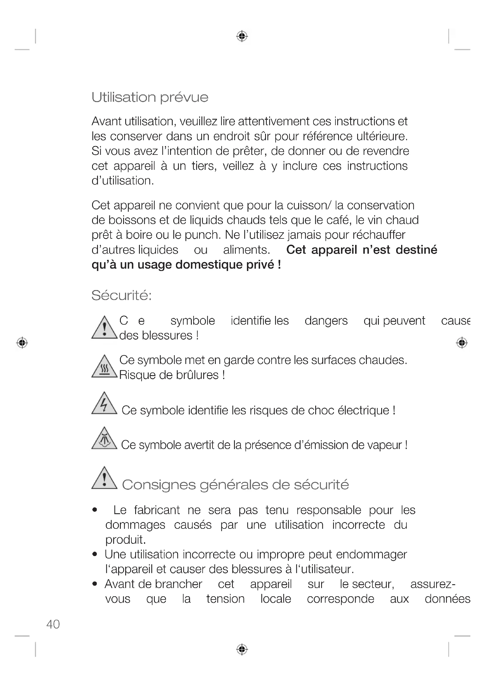 Remarque : si vous souhaitez régler la température de l‘eau pendant le processus de chauffage : - Éteignez l‘appareil en appuyant sur le bouton marche / arrêt. - Choisissez la température désirée et appuyez sur le bouton marche / arrêt pour rallumer l‘appareil. Vous pouvez arrêter le processus d‘ébullition à tout moment en appuyant sur le bouton marche / arrêt. Éteigneztoujoursl’appareiletdébranchez-leaprèschaque utilisation. Fonction maintien au chaud Remarque :l‘appareilestéquipéd‘unthermostat quimaintiendraunetempératureconstantependantlaphase de maintien au chaud. Une fois le processus de chauffage terminé, le voyant rouge s‘éteindra et le voyant orange s‘allumera. Choisissez la température de maintien au chaud désirée à l’aide du cadran du sélecteur de température pour maintenir l‘eau à une température constante. La fonction de maintien au chaud peut être arrêtée à tout moment en appuyant sur le bouton marche / arrêt Remarque : la température de maintien au chaud peut varier de5à10°C.48 Attention : ne réglez pas la température de maintien au chaud sur 110 °C car l‘appareil continuera de faire bouillir l‘eau. Recommandation : si vous n‘utilisez pas l‘appareil, éteignez-le, videz le réservoir d‘eau et débranchez-le de la prise secteur ! Fonction d’arrêt automatique protection contre l’ébullition à vide Votreappareilestéquipéd‘unefonctiond’arrêtautomatique protection contre l’ébullition à vide qui l‘éteindra automatiquementsivousl‘utilisezaccidentellementsanseau ou si vous n’avez pas respectez le niveau minimum d‘eau. En cas de coupure de sécurité, éteignez immédiatement l‘appareil, débranchez-le et laissez-le refroidir pendant environ10minutes. Ensuite,votreappareilest ànouveau opérationnel. Nettoyage et entretien Pour des raisons d‘hygiène, nettoyez votre appareil régulièrement et de manière optimale après chaque utilisation. Ne pas le faire pourrait éventuellement entraîner une situation dangereuse ou entraîner des problèmes de santé (formation de germes). Avant de nettoyer, éteignez toujours l‘appareil et débranchez-ledusecteur.Laissez-lerefroidircomplètement. N’immergezjamaisl‘appareildansl‘eau.Danger ! Risque de choc électrique ! Rincez l‘appareil avec de l‘eau chaude. Si nécessaire, utilisez un détergent doux pour vaisselle.FRANçAIS Manuel d‘instructions