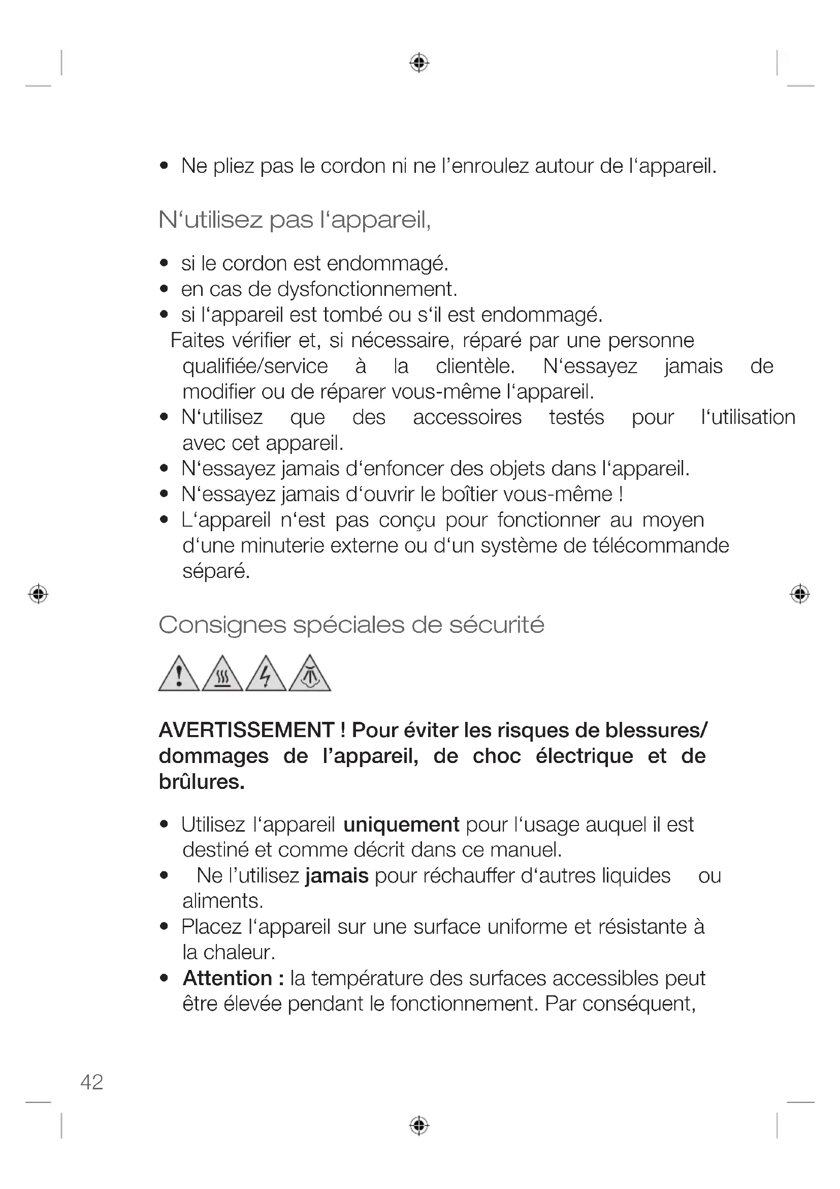 - L‘appareil n‘est pas conçu pour fonctionner au moyen d‘uneminuterieexterneoud‘unsystèmedetélécommande séparé. Consignes spéciales de sécurité AVERTISSEMENT ! Pour éviter les risques de blessures/ dommages de l’appareil, de choc électrique et de brûlures.
