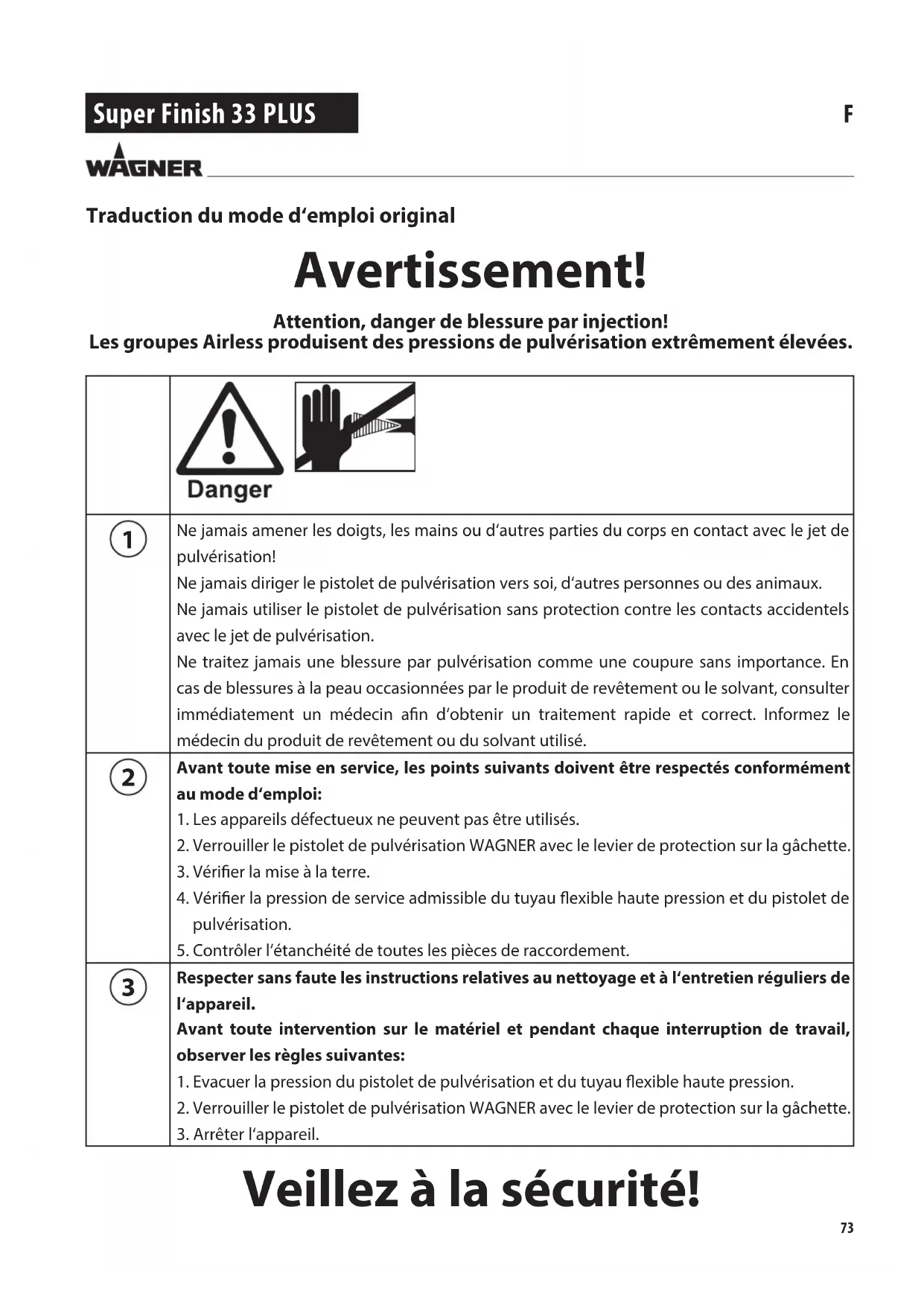 Ne jamais amener les doigts, les mains ou d‘autres parties du corps en contact avec le jet de pulvérisation!Ne jamais diriger le pistolet de pulvérisation vers soi, d‘autres personnes ou des animaux.Ne jamais utiliser le pistolet de pulvérisation sans protection contre les contacts accidentels avec le jet de pulvérisation.Ne traitez jamais une blessure par pulvérisation comme une coupure sans importance. En cas de blessures à la peau occasionnées par le produit de revêtement ou le solvant, consulter immédiatement un médecin an d‘obtenir un traitement rapide et correct. Informez le médecin du produit de revêtement ou du solvant utilisé. Avant toute mise en service, les points suivants doivent être respectés conformément au mode d‘emploi:1. Les appareils défectueux ne peuvent pas être utilisés.2. Verrouiller le pistolet de pulvérisation WAGNER avec le levier de protection sur la gâchette.3. Vérier la mise à la terre.4. Vérier la pression de service admissible du tuyau exible haute pression et du pistolet de pulvérisation.5. Contrôler l‘étanchéité de toutes les pièces de raccordement. Respecter sans faute les instructions relatives au nettoyage et à l‘entretien réguliers de l‘appareil.Avant toute intervention sur le matériel et pendant chaque interruption de travail, observer les règles suivantes:1. Evacuer la pression du pistolet de pulvérisation et du tuyau exible haute pression.2. Verrouiller le pistolet de pulvérisation WAGNER avec le levier de protection sur la gâchette.3. Arrêter l‘appareil. Veillez à la sécurité! Traduction du mode d‘emploi original74 Super Finish 33 PLUS