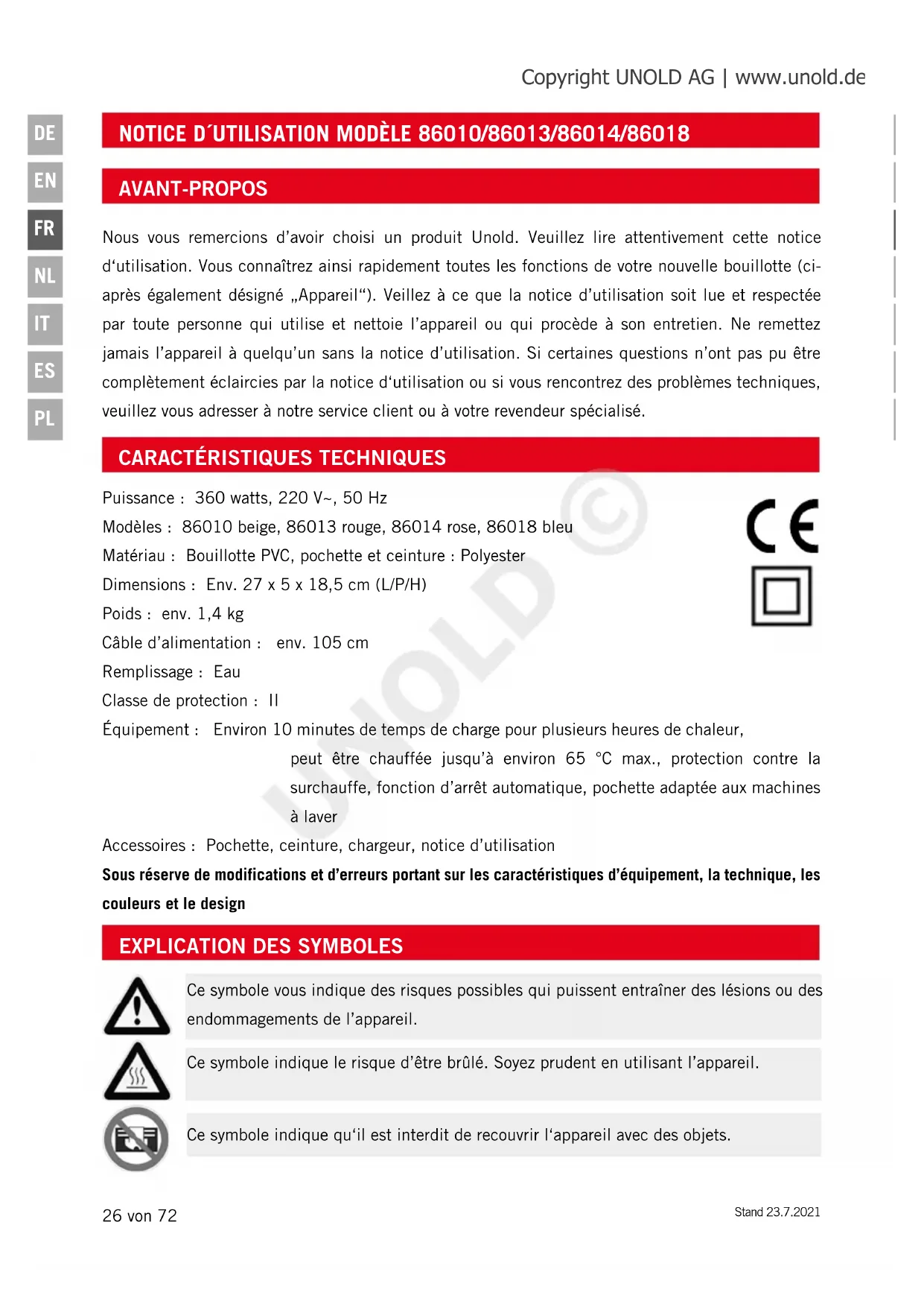 Puissance : 360 watts, 220 V~, 50 Hz Modèles : 86010 beige, 86013 rouge, 86014 rose, 86018 bleu Matériau : Bouillotte PVC, pochette et ceinture : Polyester Dimensions : Env. 27 x 5 x 18,5 cm (L/P/H) Poids : env. 1,4 kg Câble d’alimentation : env. 105 cm Remplissage : Eau Classe de protection : II Équipement : Environ 10 minutes de temps de charge pour plusieurs heures de chaleur, peut être chauffée jusqu’à environ 65 °C max., protection contre la surchauffe, fonction d’arrêt automatique, pochette adaptée aux machines à laver Accessoires : Pochette, ceinture, chargeur, notice d’utilisation Sous réserve de modifications et d’erreurs portant sur les caractéristiques d’équipement, la technique, les couleurs et le design AVANT-PROPOS Nous vous remercions d’avoir choisi un produit Unold. Veuillez lire attentivement cette notice d‘utilisation. Vous connaîtrez ainsi rapidement toutes les fonctions de votre nouvelle bouillotte (ci- après également désigné „Appareil“). Veillez à ce que la notice d’utilisation soit lue et respectée par toute personne qui utilise et nettoie l’appareil ou qui procède à son entretien. Ne remettez jamais l’appareil à quelqu’un sans la notice d’utilisation. Si certaines questions n’ont pas pu être complètement éclaircies par la notice d‘utilisation ou si vous rencontrez des problèmes techniques, veuillez vous adresser à notre service client ou à votre revendeur spécialisé.