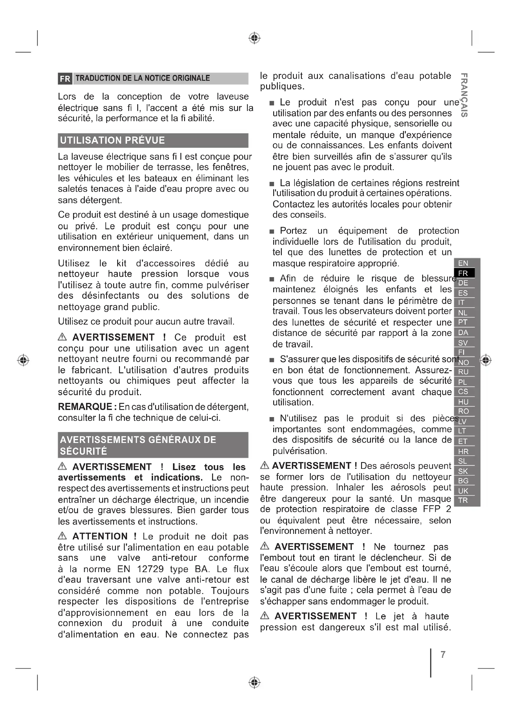 SÉCURITÉ AVERTISSEMENT ! Lisez tous les avertissements et indications. Le non- respect des avertissements et instructions peut entraîner un décharge électrique, un incendie et/ou de graves blessures. Bien garder tous les avertissements et instructions. ATTENTION ! Le produit ne doit pas être utilisé sur l'alimentation en eau potable sans une valve anti-retour conforme à la norme EN 12729 type BA. Le flux d'eau traversant une valve anti-retour est considéré comme non potable. Toujours respecter les dispositions de l'entreprise d'approvisionnement en eau lors de la connexion du produit à une conduite d'alimentation en eau. Ne connectez pas le produit aux canalisations d'eau potable publiques. ■ Le produit n'est pas conçu pour une utilisation par des enfants ou des personnes avec une capacité physique, sensorielle ou mentale réduite, un manque d'expérience ou de connaissances. Les enfants doivent être bien surveillés afin de s’assurer qu'ils ne jouent pas avec le produit. ■ La législation de certaines régions restreint l'utilisation du produit à certaines opérations. Contactez les autorités locales pour obtenir des conseils. ■ Portez un équipement de protection individuelle lors de l'utilisation du produit, tel que des lunettes de protection et un masque respiratoire approprié. ■ Afin de réduire le risque de blessure, maintenez éloignés les enfants et les personnes se tenant dans le périmètre de travail. Tous les observateurs doivent porter des lunettes de sécurité et respecter une distance de sécurité par rapport à la zone de travail. ■ S'assurer que les dispositifs de sécurité sont en bon état de fonctionnement. Assurez- vous que tous les appareils de sécurité fonctionnent correctement avant chaque utilisation. ■ N'utilisez pas le produit si des pièces importantes sont endommagées, comme des dispositifs de sécurité ou la lance de pulvérisation. AVERTISSEMENT ! Des aérosols peuvent se former lors de l'utilisation du nettoyeur haute pression. Inhaler les aérosols peut être dangereux pour la santé. Un masque de protection respiratoire de classe FFP 2 ou équivalent peut être nécessaire, selon l'environnement à nettoyer. AVERTISSEMENT ! Ne tournez pas l'embout tout en tirant le déclencheur. Si de l'eau s'écoule alors que l'embout est tourné, le canal de décharge libère le jet d'eau. Il ne s'agit pas d'une fuite ; cela permet à l'eau de s'échapper sans endommager le produit. AVERTISSEMENT ! Le jet à haute pression est dangereux s'il est mal utilisé. FRANÇAIS