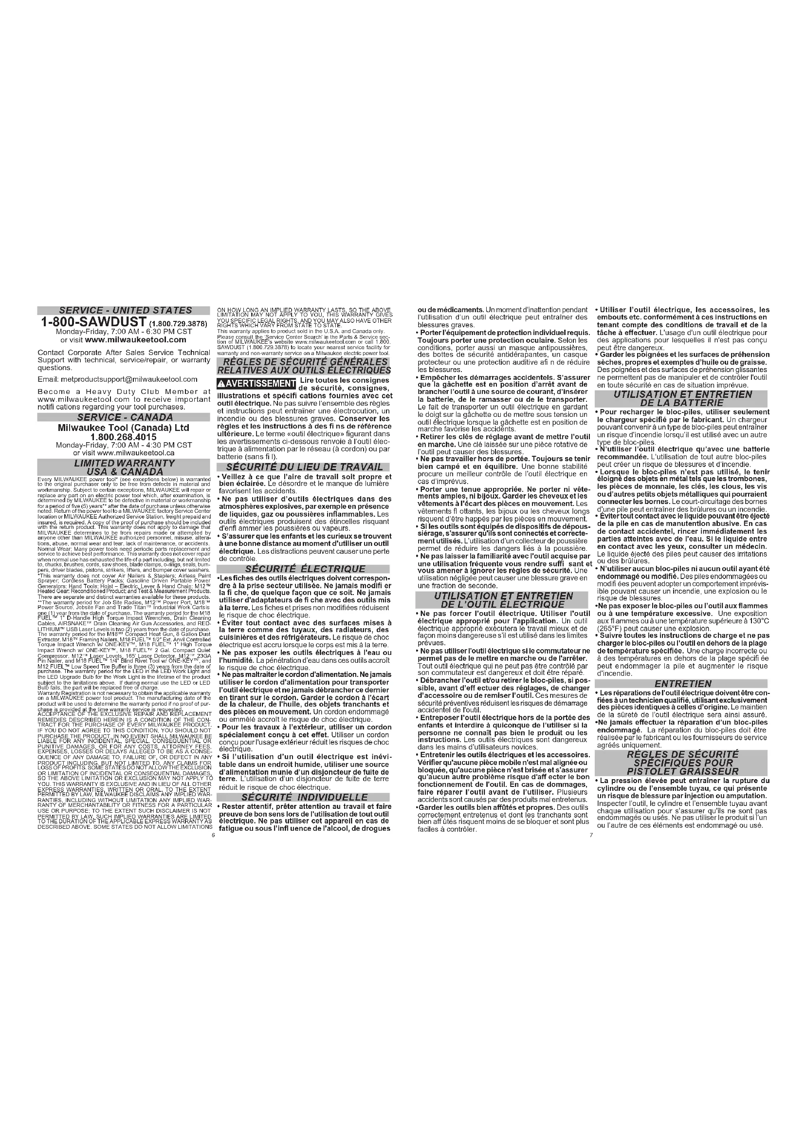 est de deux (2) ans à compter de la date d’achat. La période de garantie pour le pistolet thermique com- pact M18™, dépoussiéreur de 8 gallons, M18™ cloueuses à ossature, M18 FUEL™ 1/2" clé à chocs de enclume prolongé, couple contrôlé avec ONE-KEY™, M18 FUEL™ 1" clé à chocs de couple élevé avec ONE-KEY™, M18 FUEL™ compresseur silencieux compact de 7,6 L, les niveaux laser M12™, détecteur laser de 19,8 m, cloueuse a chevilles 23GA M12™, M18 FUEL™ 6,4 mm riveteuse aveugle avec ONE-KEY™, et tampon de pneus basse vitesse M12 FUEL™ est de trois (3) ans à compter de la date d’achat. La période de garantie couvrant la DEL de la lampe de travail à DEL et l’ampoule améliorée à DEL de la lampe de travail est une garantie à vie du produit soumise aux limitations ci-dessus. En cas de défaillance de la DEL ou de l’ampoule à DEL pendant son utilisation normale, la pièce défaillante sera remplacée gratuitement. L’enregistrement de la garantie n’est pas nécessaire pour bénéfi cier de la garantie en vigueur sur un outil électrique MILWAUKEE. La date de fabrication du produit servira à établir la période de garantie, si aucune preuve d’achat n’est fournie lorsqu’une demande de service sous garantie est déposée. L’ACCEPTATION DES RECOURS EXCLUSIFS DE RÉPARATION ET DE REMPLACEMENT DÉCRITS DANS LES PRÉSENTES EST UNE CON- DITION DU CONTRAT D’ACHAT DE TOUT PRODUIT MILWAUKEE. SI VOUS N’ACCEPTEZ PAS CETTE CONDITION, VOUS NE DEVEZ PAS ACHETER LE PRODUIT. EN AUCUN CAS, MILWAUKEE NE SAURAIT ÊTRE RESPONSABLE DE TOUT DOMMAGE ACCESSOIRE, SPÉCIAL OU INDIRECT, DE DOMMAGES-INTÉRÊTS PUNITIFS OU DE TOUTE DÉPENSE, D’HONORAIRES D’AVOCAT, DE FRAIS, DE PERTE OU DE DÉLAIS ACCESSOIRES À TOUT DOMMAGE, DÉFAILLANCE OU DÉFAUT DE TOUT PRODUIT, Y COMPRIS NOTAMMENT LES PERTES DE PROFIT. CERTAINS ÉTATS ET PROVINCES NE PERMETTANT L'EXCLUSION OU LA LIMITATION DES DOMMAGES DIRECTS OU INDIRECTS, LES RESTRICTIONS CI-DESSUS PEUVENT NE PAS VOUS ÊTRE APPLICABLES. CETTE GARANTIE EST EXCLUSIVE ET REMPLACE TOUTE AUTRE GARANTIE EXPRESSE, QU’ELLE SOIT VERBALE OU ÉCRITE. DANS LA MESURE PERMISE PAR LA LOI, MILWAUKEE RENONCE À TOUTE GARANTIE IMPLICITE, Y COMPRIS, MAIS SANS S’Y LIMITER, TOUTE GARANTIE IMPLICITE DE QUALITÉ MARCHANDE OU D’ADAPTATION À UNE UTILISATION OU À UNE FIN PARTICULIÈRE. DANS LA MESURE OÙ UNE TELLE STIPULATION D’EXONÉRATION N’EST PAS PERMISE PAR LA LOI, LA DURÉE DE CES GARANTIES IMPLICITES EST LIMITÉE À LA PÉRIODE APPLICABLE DE LA GARANTIE EXPRESSE, TEL QUE CELA EST DÉCRIT PRÉCÉDEMMENT. CERTAINS ÉTATS ET PROVINCES NE PERMETTANT PAS DE LIMITATION DE DURÉE DES GARANTIES IMPLICITES, LES RESTRICTIONS CI¬DESSUS PEUVENT DONC NE PAS VOUS ÊTRE APPLICABLES. LA PRÉSENTE VOUS CONFÈRE DES DROITS LÉGAUX PARTICULIERS; VOUS BÉNÉFICIEZ ÉGALE- MENT D’AUTRES DROITS QUI VARIENT D’UN ÉTAT À UN AUTRE. Cette garantie s’applique aux produits vendus aux États-Unis et au Canada uniquement. Veuillez consulter la rubrique Centre SAV Milwaukee, dans la sec- tion Pièces et Services du site Web de MILWAUKEE, à l’adresse www.milwaukeetool.com, ou composer le 1-800-SAWDUST (1-800-729-3878) afi n de trouver le centre de service de votre région le plus proche pour l’entretien, sous garantie ou non, de votre outil électrique Milwaukee.