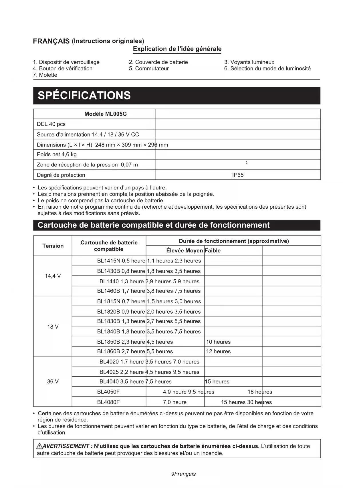 - En raison de notre programme continu de recherche et développement, les spécifications des présentes sont sujettes à des modifications sans préavis. Cartouche de batterie compatible et durée de fonctionnement Tension Cartouche de batterie compatible Durée de fonctionnement (approximative) Élevée Moyen Faible 14,4 V BL1415N 0,5 heure 1,1 heures 2,3 heures BL1430B 0,8 heure 1,8 heures 3,5 heures BL1440 1,3 heure 2,9 heures 5,9 heures BL1460B 1,7 heure 3,8 heures 7,5 heures 18 V BL1815N 0,7 heure 1,5 heures 3,0 heures BL1820B 0,9 heure 2,0 heures 3,5 heures BL1830B 1,3 heure 2,7 heures 5,5 heures BL1840B 1,8 heure 3,5 heures 7,5 heures BL1850B 2,3 heure 4,5 heures 10 heures BL1860B 2,7 heure 5,5 heures 12 heures 36 V BL4020 1,7 heure 3,5 heures 7,0 heures BL4025 2,2 heure 4,5 heures 9,5 heures BL4040 3,5 heure 7,5 heures 15 heures BL4050F 4,0 heure 9,5 heures 18 heures BL4080F 7,0 heure 15 heures 30 heures
