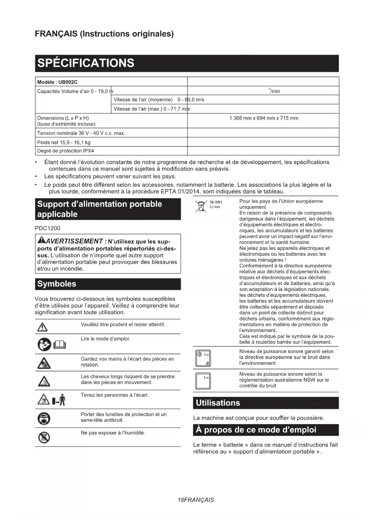 ports d’alimentation portables répertoriés ci-des- sus. L’utilisation de n’importe quel autre support d’alimentationportablepeutprovoquerdesblessures et/ou un incendie. Symboles Voustrouverezci-dessouslessymbolessusceptibles d’êtreutiliséspourl’appareil.Veillezàcomprendreleur signicationavanttouteutilisation. Veuillez être prudent et rester attentif. Lire le mode d’emploi. Gardezvosmainsàl’écartdespiècesen rotation. Les cheveux longs risquent de se prendre danslespiècesenmouvement. Tenezlespersonnesàl’écart. Porter des lunettes de protection et un serre-têteantibruit. Nepasexposeràl’humidité. Ni-MH Li-ion Pourlespaysdel’Unioneuropéenne uniquement Enraisondelaprésencedecomposants dangereux dans l’équipement, les déchets d’équipements électriques et électro- niques,lesaccumulateursetlesbatteries peuvent avoir un impact négatif sur l’envi- ronnement et la santé humaine. Nejetezpaslesappareilsélectriqueset électroniquesoulesbatteriesavecles orduresménagères! Conformémentàladirectiveeuropéenne relative aux déchets d’équipements élec- triques et électroniques et aux déchets d’accumulateursetdebatteries,ainsiqu’à sonadaptationàlalégislationnationale, les déchets d’équipements électriques, lesbatteriesetlesaccumulateursdoivent être collectés séparément et déposés dans un point de collecte distinct pour déchetsurbains,conformémentauxrégle- mentationsenmatièredeprotectionde l’environnement. Celaestindiquéparlesymboledelapou- belleàroulettesbarréesurl’équipement. Niveau de puissance sonore garanti selon ladirectiveeuropéennesurlebruitdans l’environnement. Niveau de puissance sonore selon la réglementation australienne NSW sur le contrôledubruit Utilisations Lamachineestconçuepoursouerlapoussière. À propos de ce mode d’emploi Leterme«batterie»danscemanueld’instructionsfait référenceau«supportd’alimentationportable».17 FRANÇAIS Bruit NiveaudebruitpondéréAtypique,déterminéselon EN50636-2-100: Niveau de pression sonore (L