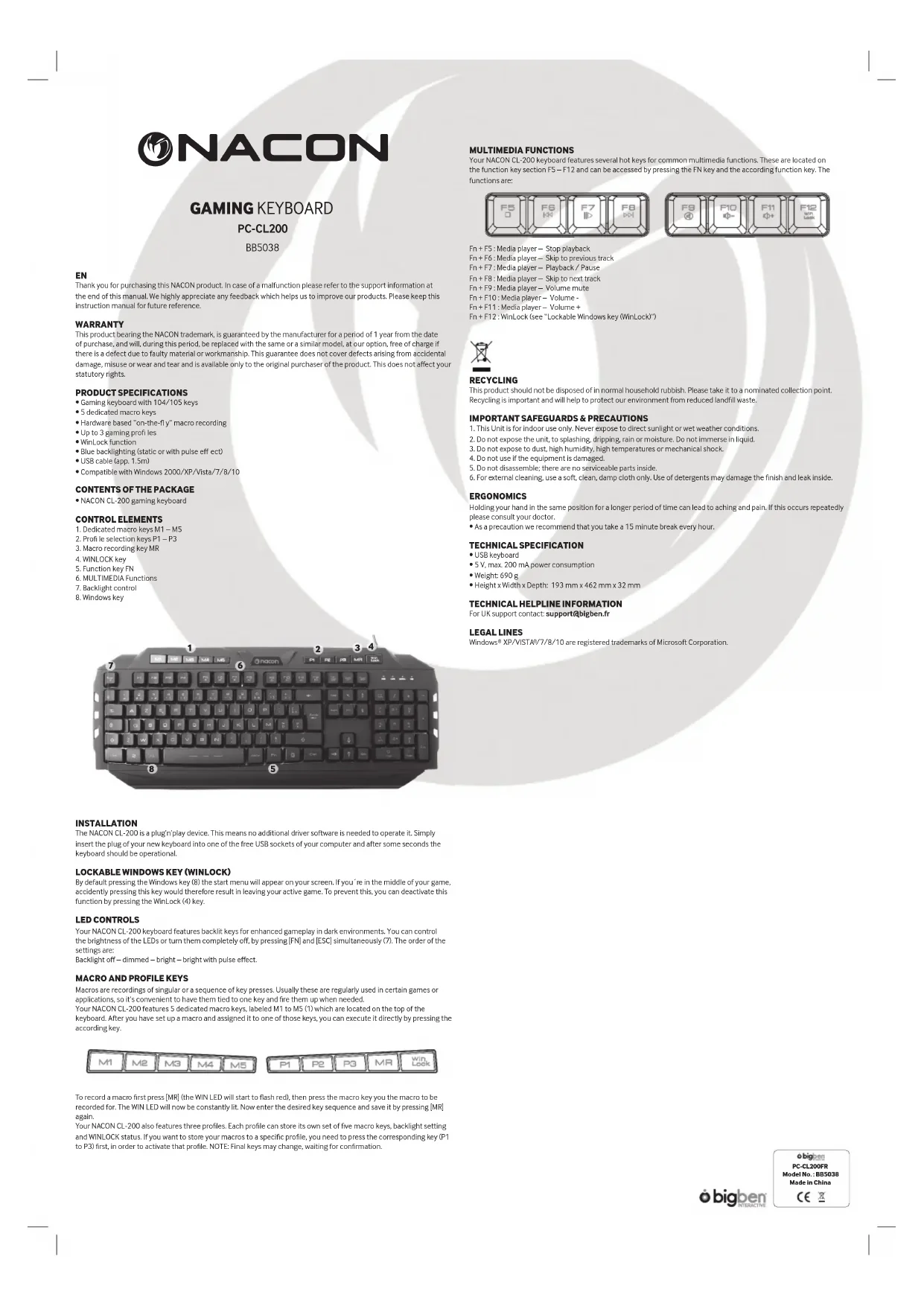 pénétrer à l’intérieur de l’appareil et endommager ses fi nitions.ERGONOMIE Garder ses mains dans la même position pendant une longue période peut provoquer des douleurs. Si ces douleurs surviennent fréquemment, veuillez en parler à votre médecin.• Par précaution, nous vous conseillons de faire une pause de 15 minutes toutes les heures. CARACTÉRISTIQUES TECHNIQUES :• Clavier USB• 5 V, max. 200 mA de consommation d’énergie• Poids : 690 g• Hauteur x largeur x profondeur : 193 mm x 462 mm x 32 mmHOTLINEPour tout renseignement vous pouvez prendre contact avec un service de Hotline.Avant tout appel, assurez-vous avoir pris le maximum d’informations sur le problème rencontré et sur le produit.Email : support@bigben.frSite Internet : www.bigben.frDu lundi au vendredi (sauf jours fériés) :- De 9h à 19hEn France : En Belgique :Bigben Interactive Sa Email : bigben-infobe@bigben-interactive.be396, Rue de la Voyette Adresse :CRT2 - FRETIN Bigben Int.BelgiumCS 90414 Avenue Ernest Solvay59814 LESQUIN Cedex 1480 Tubize, Belgium www.bigben.euINFORMATIONS JURIDIQUESWindows XP/VISTA /7/8/10 sont des marques déposées de Microsoft Corporation. Merci d’avoir acheté ce produit NACON. En cas de dysfonctionnement, veuillez vous reporter aux instructions d’aide à la fi n de ce manuel. Nous serions ravis de connaître vos réactions, car elles nous aideront à améliorer nos produits. Veuillez conserver le présent manuel d’instructions pour consultation ultérieure.GARANTIE Ce produit portant la marque NACON, est garanti par le constructeur pour une période de 1 an à partir de la date d’achat, et pourra, au cours de cette période, être gratuitement remplacé par le même modèle ou un modèle similaire, à notre gré, en cas de vice dû à un défaut de matériau ou de fabrication. Cette garantie ne couvre pas les défauts résultant de dommages accidentels, d’une mauvaise utilisation ou de l’usure et est fournie uniquement à l’acheteur original du produit. Ceci n’aff ecte pas vos droits statutaires.CARACTÉRISTIQUES DU PRODUIT • Clavier de jeu de 104 ou 105 touches• 5 touches de confi guration de macros• Enregistrement matériel de macros en cours de jeu • Jusqu’à 3 profi ls de jeu• Fonction WinLock• Rétroéclairage bleu (statique ou clignotant)• Câble USB (environ 1,5 m)• Compatible avec Windows 2000/XP/Vista/7/8/10CONTENU DE L’EMBALLAGE• Clavier de jeu NACON CL-200TOUCHES DE COMMANDE1. Touches de choix de macros (M1 - M5)2. Touches de sélection de profi ls (P1 - P3)3. Touche d’enregistrement de macro (MR)4. Touche WinLock5. Touche de fonction (Fn)6. Fonctions multimédias7. Commande du rétroéclairage8. Touche WindowsINSTALLATION Le NACON CL-200 est un dispositif Plug-and-Play. Cela signifi e qu’il ne requiert aucun logiciel supplémentaire. Il vous suffi t d’insérer la fi che de votre nouveau clavier dans l’un des ports USB libres de votre ordinateur. Après quelques secondes, le clavier devrait être opérationnel.TOUCHE WINDOWS VERROUILLABLE (WINLOCK) Par défaut, en appuyant sur la touche Windows (8), le menu Démarrer s’affi che à l’écran. Si vous êtes en train de jouer et que vous appuyez sur cette touche par accident, vous quitterez votre jeu sans le vouloir. Pour empêcher ce désagrément, vous pouvez désactiver cette fonction en appuyant sur la touche WinLock (4).COMMANDE DES DELLes touches de votre clavier NACON CL-200 peuvent être rétroéclairées, pour une meilleure expérience de jeu dans l’obscurité. Vous pouvez commander la luminosité des DEL ou les éteindre complètement en appuyant simultanément sur [Fn] et [ESC] (7). L’ordre de confi guration est le suivant : Rétroéclairage éteint, faible, puissant, puissant avec clignotement.TOUCHES DE MACRO ET DE PROFILSLes macros sont des enregistrements d’une frappe ou d’une séquence de frappes. En général, ces séquences de frappes sont utilisées dans certains jeux ou certaines applications. Il est donc pratique de les regrouper dans une touche pour les utiliser dès que besoin. Votre NACON CL-200 est doté de 5 touches de confi guration de macros allant de M1 à M5 (1) qui sont situées en haut du clavier. Après avoir défi ni une macro et l’avoir attribuée à l’une de ces touches, vous pourrez l’utiliser directement en appuyant sur la touche correspondante.Pour enregistrer une macro, appuyez d’abord sur [MR] (la DEL WIN se met à clignoter de couleur rouge), puis appuyez sur la touche macro que vous souhaitez associer à votre macro. La DEL WIN ne clignote plus et reste allumée. Ensuite, tapez la séquence de touches souhaitée et enregistrez-la en appuyant à nouveau sur [MR]. Votre NACON CL-200 permet également de confi gurer trois profi ls. Pour chaque profi l, vous pouvez paramétrer cinq touches de macros, les fonctions de rétroéclairage et le choix de l’utilisation de WinLock. Si vous souhaitez enregistrer vos macros dans un profi l spécifi que, vous devez d’abord appuyer sur la touche correspondante (P1 à P3) pour activer ce profi l. REMARQUE : les touches fi nales peuvent changer (en attente de confi rmation). oNACON