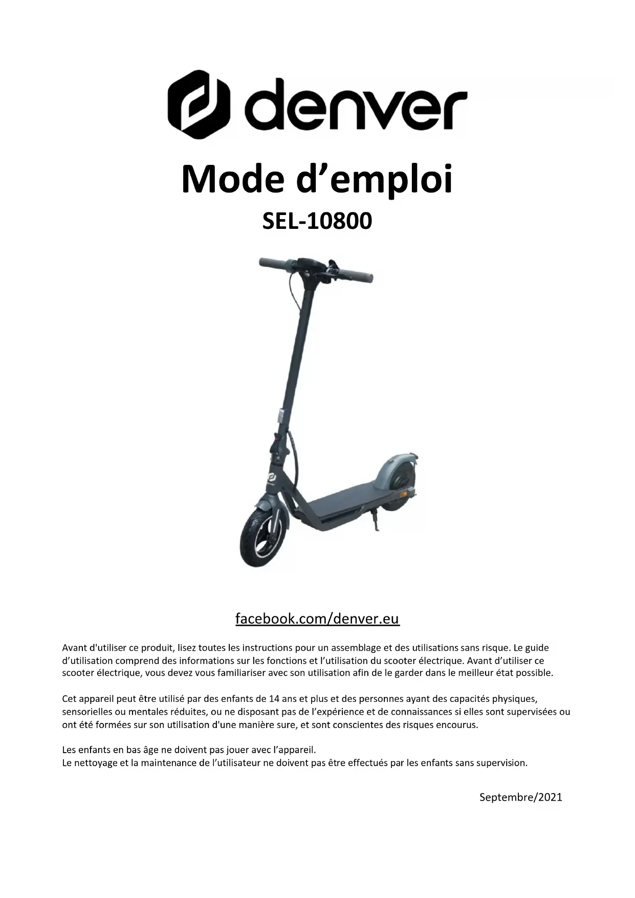 Omega 5A, Soeften DK‐8382 Hinnerup Danemark facebook.com/denver.eu18 Concernant la charge de la batterie SEL-10800 Important - À lire ! Cher client, Nous espérons que votre nouveau scooter électrique vous donne beaucoup de plaisir. La batterie intégrée du scooter électrique n’est pas complètement chargée à sa sortie d’usine, et, si elle n’est pas utilisée, elle peut se décharger lentement. Si la batterie est complètement déchargée, il faut utiliser une charge lente pour éviter de l’endommager. Si vous constatez que vous ne pouvez pas allumer votre scooter électrique et qu’il ne semble pas se charger (le chargeur s’allume immédiatement en vert), n’essayez pas de résoudre le problème en démontant la machine par vous-même et contactez directement notre service après-vente. Veuillez accéder au site : www.denver.eu pour obtenir la version électronique du manuel.19 AVERTISSEMENTS Lisez entièrement le manuel et les instructions ci-dessous avant d’utiliser le produit. Nom du produit : SEL-10800 Type de produit : Scooter électrique Année de fabrication : 2021