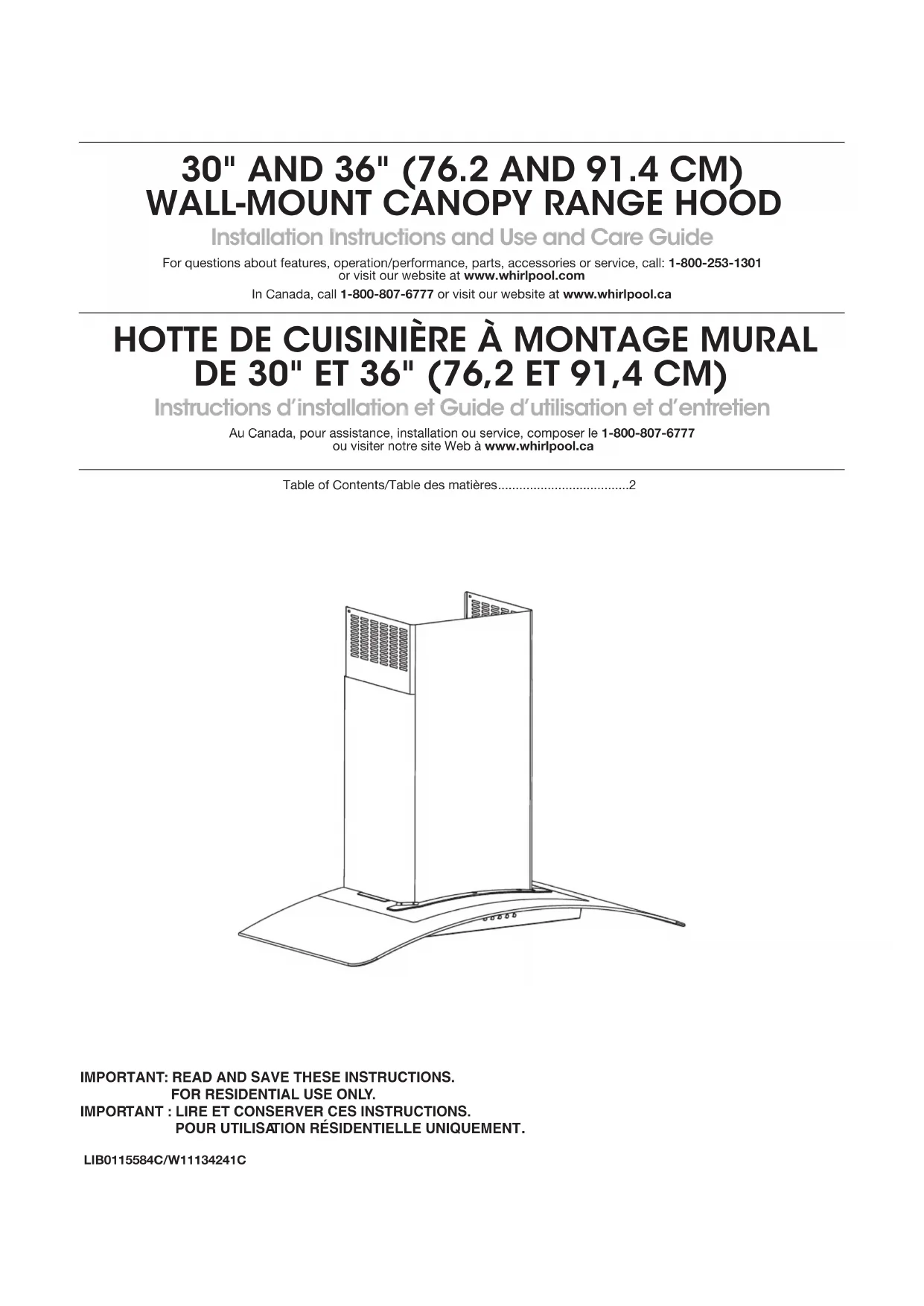 DE30" ET 36" (76,2 ET 91,4 CM) Instructions d’installation et Guide d’utilisation et d’entretien Au Canada, pour assistance, installation ou service, composer le 1-800-807-6777 ou visiter notre site Web à www.whirlpool.ca Table of Contents/Table des matières