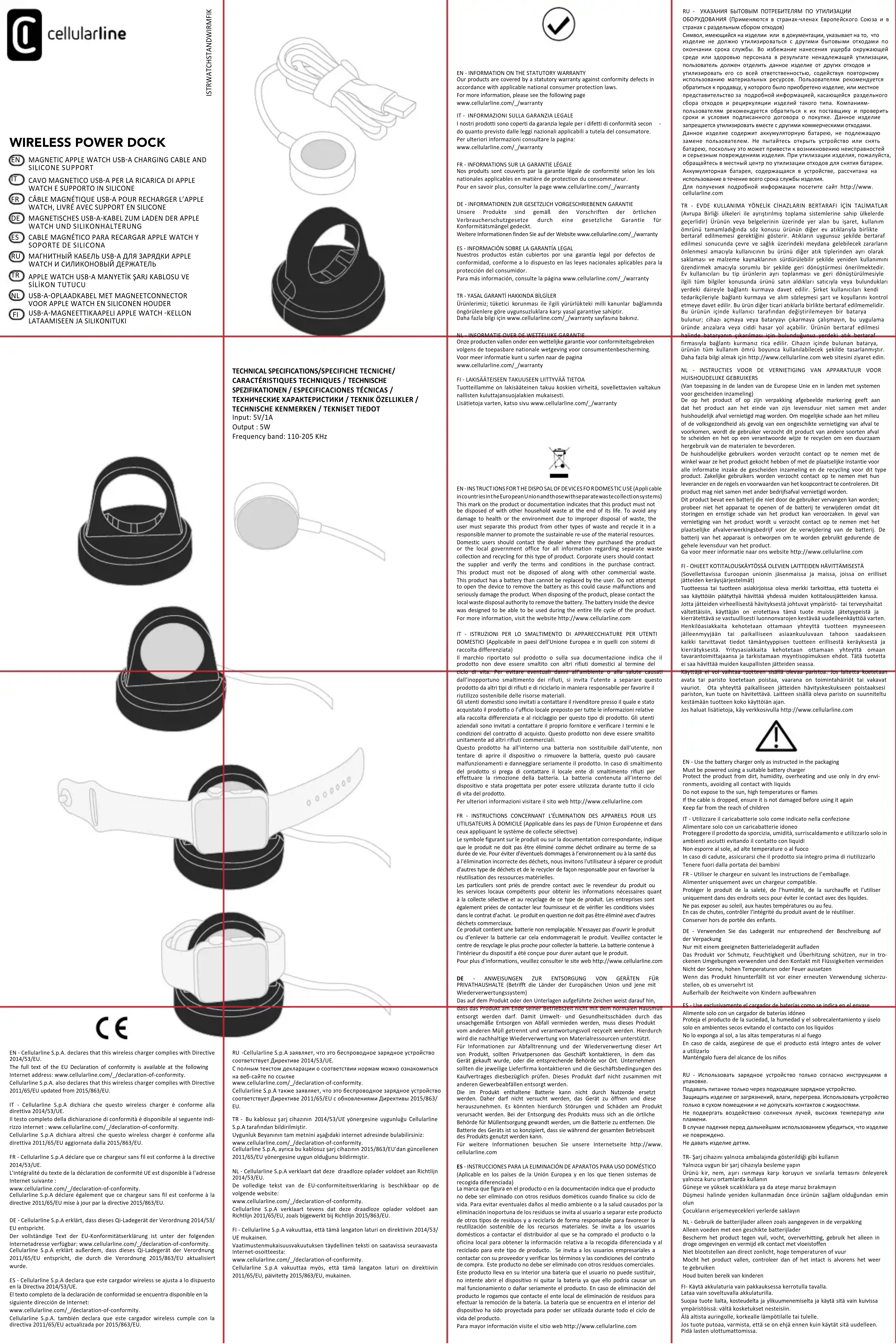 FR - Cellularline S.p.A déclare que ce chargeur sans fil est conforme à la directive 2014/53/UE. L'intégralité du texte de la déclaration de conformité UE est disponible à l'adresse Internet suivante : www.cellularline.com/_/declaration-of-conformity. Cellularline S.p.A déclare également que ce chargeur sans fil est conforme à la directive 2011/65/EU mise à jour par la directive 2015/863/EU. FR - INFORMATIONS SUR LA GARANTIE LÉGALE Nos produits sont couverts par la garantie légale de conformité selon les lois nationales applicables en matière de protection du consommateur. Pour en savoir plus, consulter la page www.cellularline.com/_/warranty FR - INSTRUCTIONS CONCERNANT L'ÉLIMINATION DES APPAREILS POUR LES UTILISATEURS À DOMICILE (Applicable dans les pays de l'Union Européenne et dans ceux appliquant le système de collecte sélective) Le symbole figurant sur le produit ou sur la documentation correspondante, indique que le produit ne doit pas être éliminé comme déchet ordinaire au terme de sa durée de vie. Pour éviter d'éventuels dommages à l’environnement ou à la santé dus à l'élimination incorrecte des déchets, nous invitons l'utilisateur à séparer ce produit d'autres type de déchets et de le recycler de façon responsable pour en favoriser la réutilisation des ressources matérielles. Les particuliers sont priés de prendre contact avec le revendeur du produit ou les services locaux compétents pour obtenir les informations nécessaires quant à la collecte sélective et au recyclage de ce type de produit. Les entreprises sont également priées de contacter leur fournisseur et de vérifier les conditions visées dans le contrat d’achat. Le produit en question ne doit pas être éliminé avec d'autres déchets commerciaux. Ce produit contient une batterie non remplaçable. N’essayez pas d’ouvrir le produit ou d’enlever la batterie car cela endommagerait le produit. Veuillez contacter le centre de recyclage le plus proche pour collecter la batterie. La batterie contenue à l'intérieur du dispositif a été conçue pour durer autant que le produit. Pour plus d’informations, veuillez consulter le site web http://www.cellularline.com FR - Utiliser le chargeur en suivant les instructions de l’emballage. Alimenter uniquement avec un chargeur compatible. Protéger le produit de la saleté, de l’humidité, de la surchauffe et l’utiliser uniquement dans des endroits secs pour éviter le contact avec des liquides. Ne pas exposer au soleil, aux hautes températures ou au feu. En cas de chutes, contrôler l’intégrité du produit avant de le réutiliser. Conserver hors de portée des enfants.