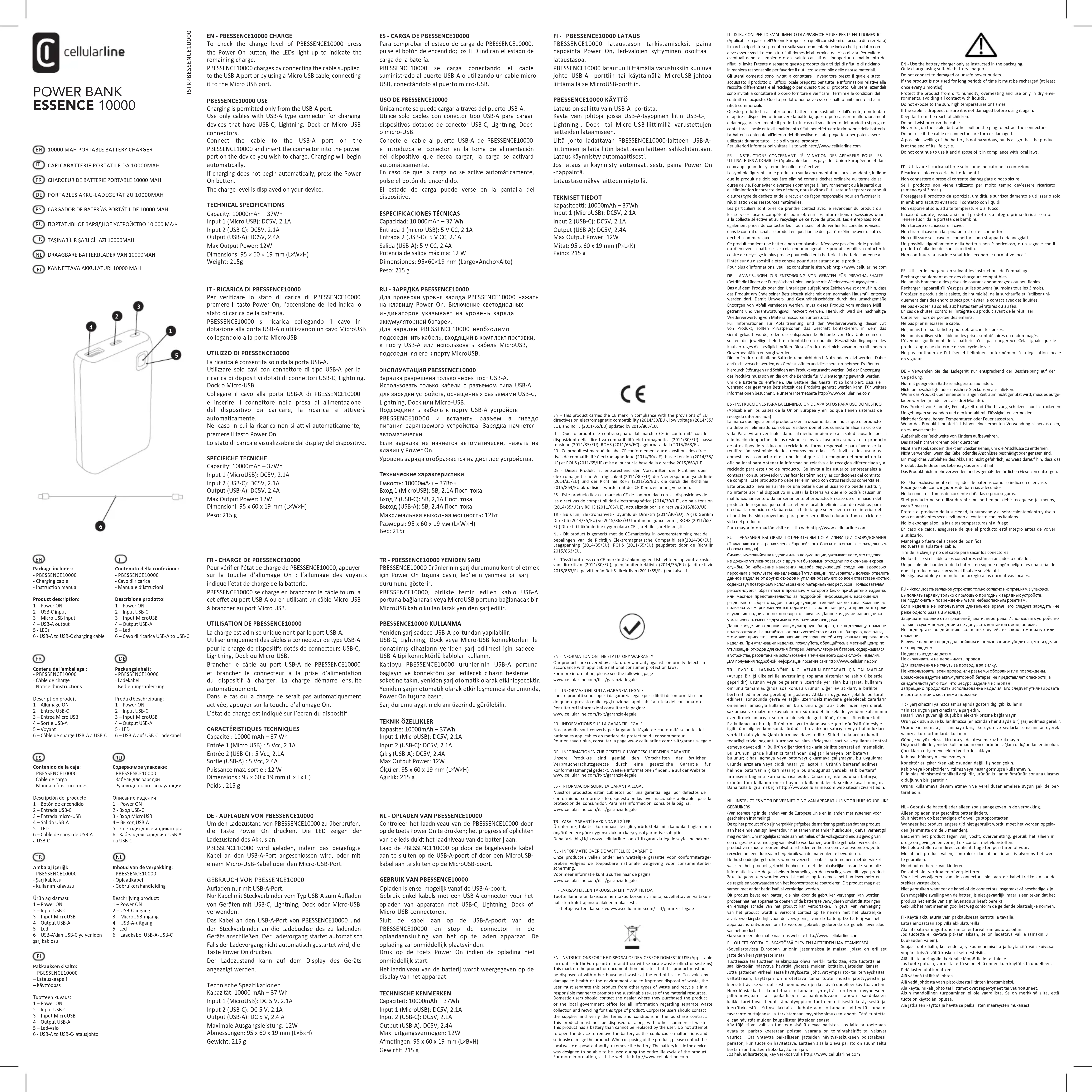 FR - INSTRUCTIONS CONCERNANT L'ÉLIMINATION DES APPAREILS POUR LES UTILISATEURS À DOMICILE (Applicable dans les pays de l'Union Européenne et dans ceux appliquant le système de collecte sélective) Le symbole figurant sur le produit ou sur la documentation correspondante, indique que le produit ne doit pas être éliminé comme déchet ordinaire au terme de sa durée de vie. Pour éviter d'éventuels dommages à l’environnement ou à la santé dus à l'élimination incorrecte des déchets, nous invitons l'utilisateur à séparer ce produit d'autres type de déchets et de le recycler de façon responsable pour en favoriser la réutilisation des ressources matérielles. Les particuliers sont priés de prendre contact avec le revendeur du produit ou les services locaux compétents pour obtenir les informations nécessaires quant à la collecte sélective et au recyclage de ce type de produit. Les entreprises sont également priées de contacter leur fournisseur et de vérifier les conditions visées dans le contrat d’achat. Le produit en question ne doit pas être éliminé avec d'autres déchets commerciaux. Ce produit contient une batterie non remplaçable. N’essayez pas d’ouvrir le produit ou d’enlever la batterie car cela endommagerait le produit. Veuillez contacter le centre de recyclage le plus proche pour collecter la batterie. La batterie contenue à l'intérieur du dispositif a été conçue pour durer autant que le produit. Pour plus d’informations, veuillez consulter le site web http://www.cellularline.com FR- Utiliser le chargeur en suivant les instructions de l’emballage. Recharger seulement avec des chargeurs compatibles. Ne jamais brancher à des prises de courant endommagées ou peu fiables. Recharger l’appareil s’il n’est pas utilisé souvent (au moins tous les 3 mois). Protéger le produit de la saleté, de l’humidité, de la surchauffe et l’utiliser uni- quement dans des endroits secs pour éviter le contact avec des liquides. Ne pas exposer au soleil, aux hautes températures ou au feu. En cas de chutes, contrôler l’intégrité du produit avant de le réutiliser. Conserver hors de portée des enfants. Ne pas plier ni écraser le câble. Ne jamais tirer sur la fiche pour débrancher les prises. Ne jamais utiliser si le câble ou les prises sont déchirés ou endommagés. L’éventuel gonflement de la batterie n’est pas dangereux. Cela signale que le produit approche du terme de son cycle de vie. Ne pas continuer de l’utiliser et l’éliminer conformément à la législation locale en vigueur. Contenu de l'emballage : - PBESSENCE10000 - Câble de charge - Notice d’instructions Description produit : 1 – Allumage ON 2 – Entrée USB-C 3 – Entrée Micro USB 4 – Sortie USB-A 5 – Voyant 6 – Câble de charge USB-A à USB-C