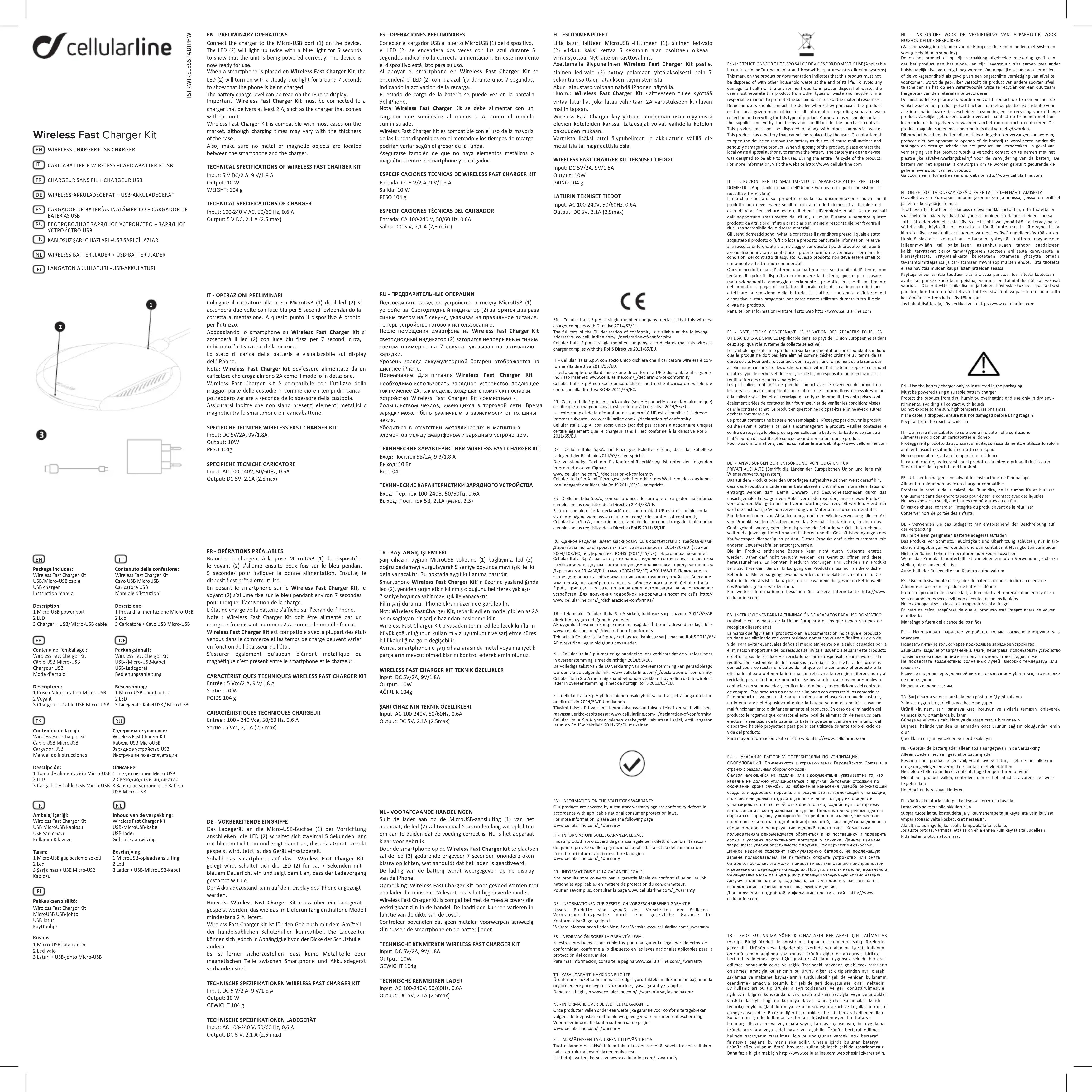 IT - Utilizzare il caricabatterie solo come indicato nella confezione Alimentare solo con un caricabatterie idoneo Proteggere il prodotto da sporcizia, umidità, surriscaldamento e utilizzarlo solo in ambienti asciutti evitando il contatto con liquidi Non esporre al sole, ad alte temperature o al fuoco In caso di cadute, assicurarsi che il prodotto sia integro prima di riutilizzarlo Tenere fuori dalla portata dei bambini FR - Cellular Italia S.p.A. con socio unico (société par actions à actionnaire unique) certifie que le chargeur sans fil est conforme à la directive 2014/53/EU. Le texte complet de la déclaration de conformité UE est disponible à l’adresse Internet suivante : www.cellularline.com/_/declaration-of-conformity Cellular Italia S.p.A. con socio unico (société par actions à actionnaire unique) certifie également que le chargeur sans fil est conforme à la directive RoHS 2011/65/EU. FR - INFORMATIONS SUR LA GARANTIE LÉGALE Nos produits sont couverts par la garantie légale de conformité selon les lois nationales applicables en matière de protection du consommateur. Pour en savoir plus, consulter la page www.cellularline.com/_/warranty FR - INSTRUCTIONS CONCERNANT L'ÉLIMINATION DES APPAREILS POUR LES UTILISATEURS À DOMICILE (Applicable dans les pays de l'Union Européenne et dans ceux appliquant le système de collecte sélective) Le symbole figurant sur le produit ou sur la documentation correspondante, indique que le produit ne doit pas être éliminé comme déchet ordinaire au terme de sa durée de vie. Pour éviter d'éventuels dommages à l’environnement ou à la santé dus à l'élimination incorrecte des déchets, nous invitons l'utilisateur à séparer ce produit d'autres type de déchets et de le recycler de façon responsable pour en favoriser la réutilisation des ressources matérielles. Les particuliers sont priés de prendre contact avec le revendeur du produit ou les services locaux compétents pour obtenir les informations nécessaires quant à la collecte sélective et au recyclage de ce type de produit. Les entreprises sont également priées de contacter leur fournisseur et de vérifier les conditions visées dans le contrat d’achat. Le produit en question ne doit pas être éliminé avec d'autres déchets commerciaux. Ce produit contient une batterie non remplaçable. N’essayez pas d’ouvrir le produit ou d’enlever la batterie car cela endommagerait le produit. Veuillez contacter le centre de recyclage le plus proche pour collecter la batterie. La batterie contenue à l'intérieur du dispositif a été conçue pour durer autant que le produit. Pour plus d’informations, veuillez consulter le site web http://www.cellularline.com
