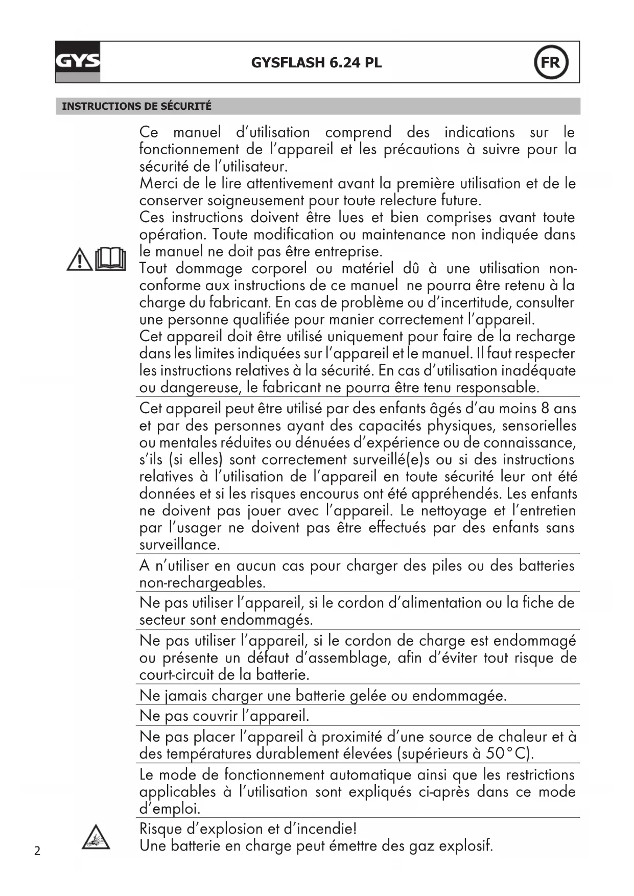 Ce manuel d’utilisation comprend des indications sur le fonctionnement de l’appareil et les précautions à suivre pour la sécurité de l’utilisateur. Merci de le lire attentivement avant la première utilisation et de le conserver soigneusement pour toute relecture future. Ces instructions doivent être lues et bien comprises avant toute opération. Toute modification ou maintenance non indiquée dans le manuel ne doit pas être entreprise. Tout dommage corporel ou matériel dû à une utilisation non- conforme aux instructions de ce manuel ne pourra être retenu à la charge du fabricant. En cas de problème ou d’incertitude, consulter une personne qualifiée pour manier correctement l’appareil. Cet appareil doit être utilisé uniquement pour faire de la recharge dans les limites indiquées sur l’appareil et le manuel. Il faut respecter les instructions relatives à la sécurité. En cas d’utilisation inadéquate ou dangereuse, le fabricant ne pourra être tenu responsable. Cet appareil peut être utilisé par des enfants âgés d’au moins 8 ans et par des personnes ayant des capacités physiques, sensorielles ou mentales réduites ou dénuées d’expérience ou de connaissance, s’ils (si elles) sont correctement surveillé(e)s ou si des instructions relatives à l’utilisation de l’appareil en toute sécurité leur ont été données et si les risques encourus ont été appréhendés. Les enfants ne doivent pas jouer avec l’appareil. Le nettoyage et l’entretien par l’usager ne doivent pas être effectués par des enfants sans surveillance. À n’utiliser en aucun cas pour charger des piles ou des batteries non-rechargeables. Ne pas utiliser l’appareil, si le cordon d’alimentation ou la fiche de secteur sont endommagés. Ne pas utiliser l’appareil, si le cordon de charge est endommagé ou présente un défaut d’assemblage, afin d’éviter tout risque de court-circuit de la batterie. Ne jamais charger une batterie gelée ou endommagée. Ne pas couvrir l’appareil. Ne pas placer l’appareil à proximité d’une source de chaleur et à des températures durablement élevées (supérieurs à 50°C). Le mode de fonctionnement automatique ainsi que les restrictions applicables à l’utilisation sont expliqués ci-après dans ce mode d’emploi. Risque d’explosion et d’incendie! Une batterie en charge peut émettre des gaz explosif.3 GYSFLASH 6.24 PL
