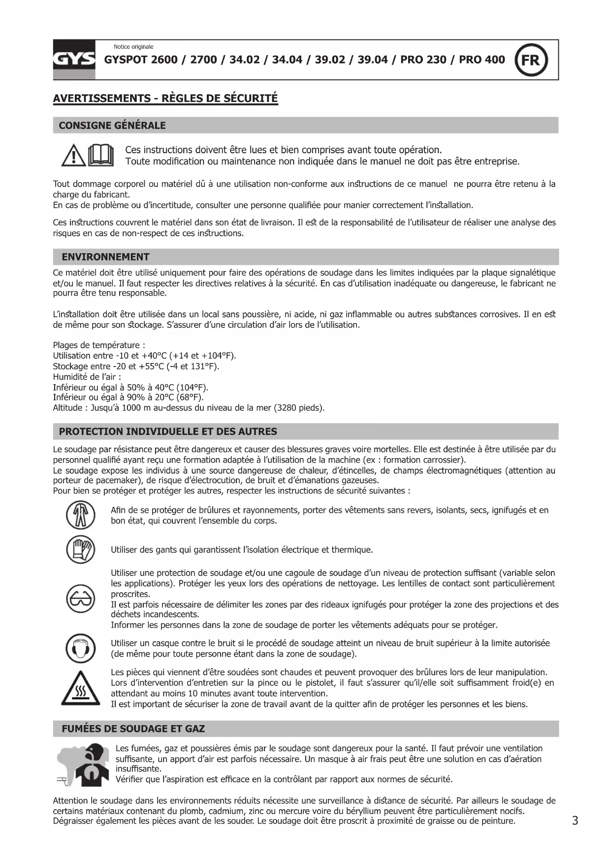 Ce matériel de Classe A n’est pas prévu pour être utilisé dans un site résidentiel où le courant électrique est fourni par le réseau public d’alimentation basse tension. Il peut y avoir des dicultés potentielles pour assurer la compatibilité électromagnétique dans ces sites, à cause des perturbations conduites, aussi bien que rayonnées à fréquence radioélectrique. GYSPOT2600 / 2700 / 34.04 / 39.04 / PRO 400 Ce matériel est conforme à la CEI 61000-3-11 si l’impédance du réseau au point de raccordement avec l’installation électrique est inférieure à l’impédance maximale admissible du réseau Zmax = 0,77 Ohms. GYSPOT34.02 / 39.02 /PRO 230 Ce matériel est conforme à la CEI 61000-3-11 si l’impédance du réseau au point de raccordement avec l’installation électrique est inférieure à l’impédance maximale admissible du réseau Zmax = 0,84 Ohms. Ce matériel n’est pas conforme à la CEI 61000-3-12 et est destiné à être raccordé à des réseaux basse tension privés connectés au réseau public d’alimentation seulement au niveau moyenne et haute tension. S’il est connecté à un réseau public d’alimentation basse tension, il est de la responsabilité de l’installateur ou de l’utilisateur du matériel de s’assurer, en consultant l’opérateur du réseau de distribution, que le matériel peut être connecté. EMISSIONS ELECTRO-MAGNETIQUES Le courant électrique passant à travers n’importe quel conducteur produit des champs électriques et magnétiques (EMF) localisés. Le courant de soudage produit un champ électromagnétique autour du circuit de soudage et du matériel de soudage. Les champs électromagnétiques EMF peuvent perturber certains implants médicaux, par exemple les imulateurs cardiaques. Des mesures de protection doivent être prises pour les personnes portant des implants médicaux. Par exemple, rerictions d’accès pour les passants ou une évaluation de risque individuelle pour les soudeurs. Tous les soudeurs doivent utiliser les procédures suivantes an de minimiser l’exposition aux champs électromagnétiques provenant du circuit de soudage: