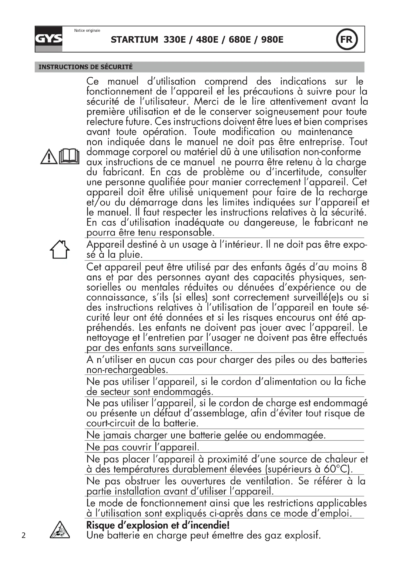 Ce manuel d’utilisation comprend des indications sur le fonctionnement de l’appareil et les précautions à suivre pour la sécurité de l’utilisateur. Merci de le lire attentivement avant la première utilisation et de le conserver soigneusement pour toute relecture future. Ces instructions doivent être lues et bien comprises avant toute opération. Toute modication ou maintenance non indiquée dans le manuel ne doit pas être entreprise. Tout dommage corporel ou matériel dû à une utilisation non-conforme aux instructions de ce manuel ne pourra être retenu à la charge du fabricant. En cas de problème ou d’incertitude, consulter une personne qualiée pour manier correctement l’appareil. Cet appareil doit être utilisé uniquement pour faire de la recharge et/ou du démarrage dans les limites indiquées sur l’appareil et le manuel. Il faut respecter les instructions relatives à la sécurité. En cas d’utilisation inadéquate ou dangereuse, le fabricant ne pourra être tenu responsable. Appareil destiné à un usage à l’intérieur. Il ne doit pas être expo- sé à la pluie. Cet appareil peut être utilisé par des enfants âgés d’au moins 8 ans et par des personnes ayant des capacités physiques, sen- sorielles ou mentales réduites ou dénuées d’expérience ou de connaissance, s’ils (si elles) sont correctement surveillé(e)s ou si des instructions relatives à l’utilisation de l’appareil en toute sé- curité leur ont été données et si les risques encourus ont été ap- préhendés. Les enfants ne doivent pas jouer avec l’appareil. Le nettoyage et l’entretien par l’usager ne doivent pas être effectués par des enfants sans surveillance. A n’utiliser en aucun cas pour charger des piles ou des batteries non-rechargeables. Ne pas utiliser l’appareil, si le cordon d’alimentation ou la che de secteur sont endommagés. Ne pas utiliser l’appareil, si le cordon de charge est endommagé ou présente un défaut d’assemblage, an d’éviter tout risque de court-circuit de la batterie. Ne jamais charger une batterie gelée ou endommagée. Ne pas couvrir l’appareil. Ne pas placer l’appareil à proximité d’une source de chaleur et à des températures durablement élevées (supérieurs à 60°C). Ne pas obstruer les ouvertures de ventilation. Se référer à la partie installation avant d’utiliser l’appareil. Le mode de fonctionnement ainsi que les restrictions applicables à l’utilisation sont expliqués ci-après dans ce mode d’emploi. Risque d’explosion et d’incendie! Une batterie en charge peut émettre des gaz explosif.3