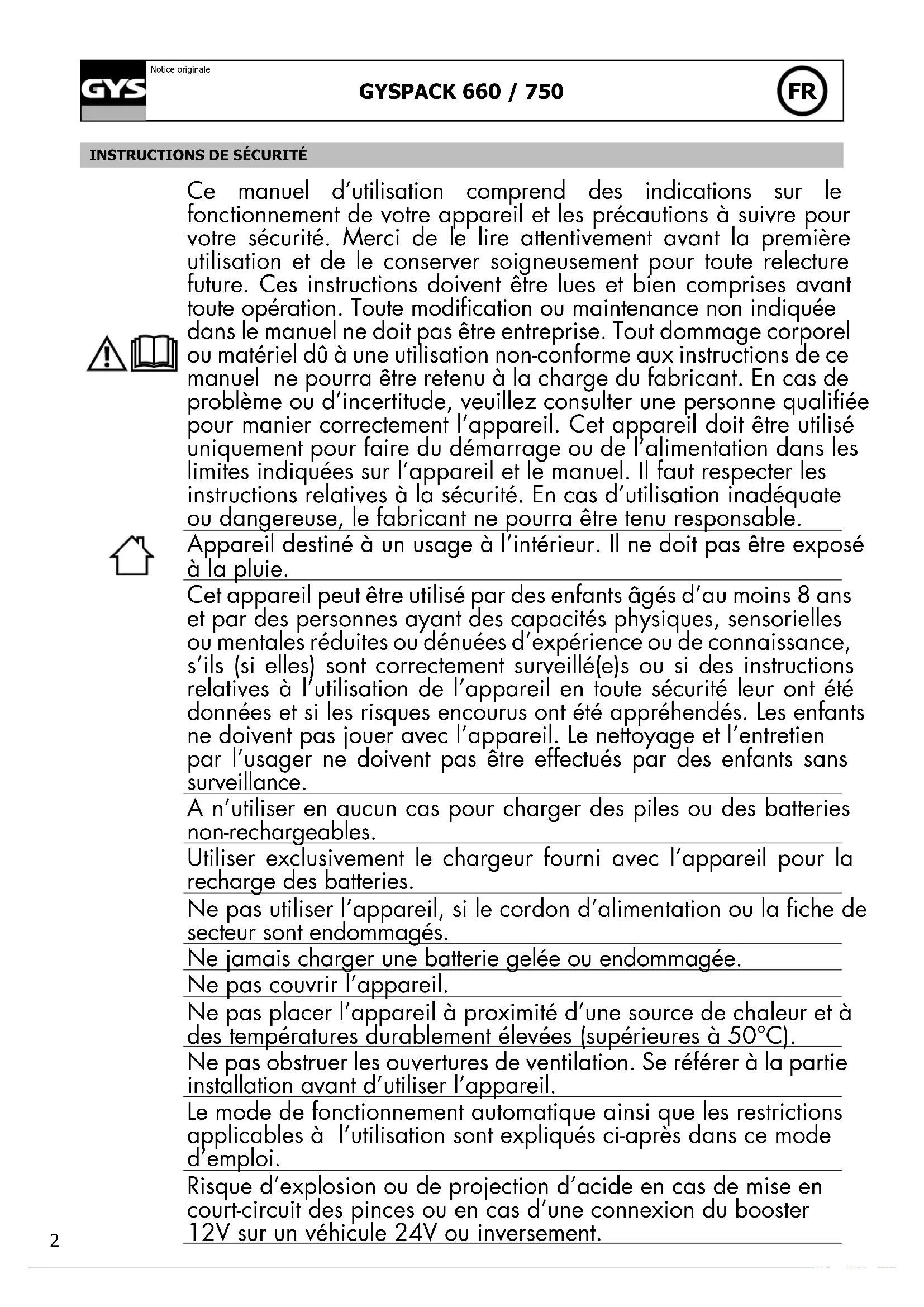 Ce manuel d’utilisation comprend des indications sur le fonctionnement de votre appareil et les précautions à suivre pour votre sécurité. Merci de le lire attentivement avant la première utilisation et de le conserver soigneusement pour toute relecture future. Ces instructions doivent être lues et bien comprises avant toute opération. Toute modication ou maintenance non indiquée dans le manuel ne doit pas être entreprise. Tout dommage corporel ou matériel dû à une utilisation non-conforme aux instructions de ce manuel ne pourra être retenu à la charge du fabricant. En cas de problème ou d’incertitude, veuillez consulter une personne qualiée pour manier correctement l’appareil. Cet appareil doit être utilisé uniquement pour faire du démarrage ou de l’alimentation dans les limites indiquées sur l’appareil et le manuel. Il faut respecter les instructions relatives à la sécurité. En cas d’utilisation inadéquate ou dangereuse, le fabricant ne pourra être tenu responsable. Appareil destiné à un usage à l’intérieur. Il ne doit pas être exposé à la pluie. Cet appareil peut être utilisé par des enfants âgés d’au moins 8 ans et par des personnes ayant des capacités physiques, sensorielles ou mentales réduites ou dénuées d’expérience ou de connaissance, s’ils (si elles) sont correctement surveillé(e)s ou si des instructions relatives à l’utilisation de l’appareil en toute sécurité leur ont été données et si les risques encourus ont été appréhendés. Les enfants ne doivent pas jouer avec l’appareil. Le nettoyage et l’entretien par l’usager ne doivent pas être effectués par des enfants sans surveillance. A n’utiliser en aucun cas pour charger des piles ou des batteries non-rechargeables. Utiliser exclusivement le chargeur fourni avec l’appareil pour la recharge des batteries. Ne pas utiliser l’appareil, si le cordon d’alimentation ou la che de secteur sont endommagés. Ne jamais charger une batterie gelée ou endommagée. Ne pas couvrir l’appareil. Ne pas placer l’appareil à proximité d’une source de chaleur et à des températures durablement élevées (supérieures à 50°C). Ne pas obstruer les ouvertures de ventilation. Se référer à la partie installation avant d’utiliser l’appareil. Le mode de fonctionnement automatique ainsi que les restrictions applicables à l’utilisation sont expliqués ci-après dans ce mode d’emploi. Risque d’explosion ou de projection d’acide en cas de mise en court-circuit des pinces ou en cas d’une connexion du booster 12V sur un véhicule 24V ou inversement.3 GYSPACK 660 / 750