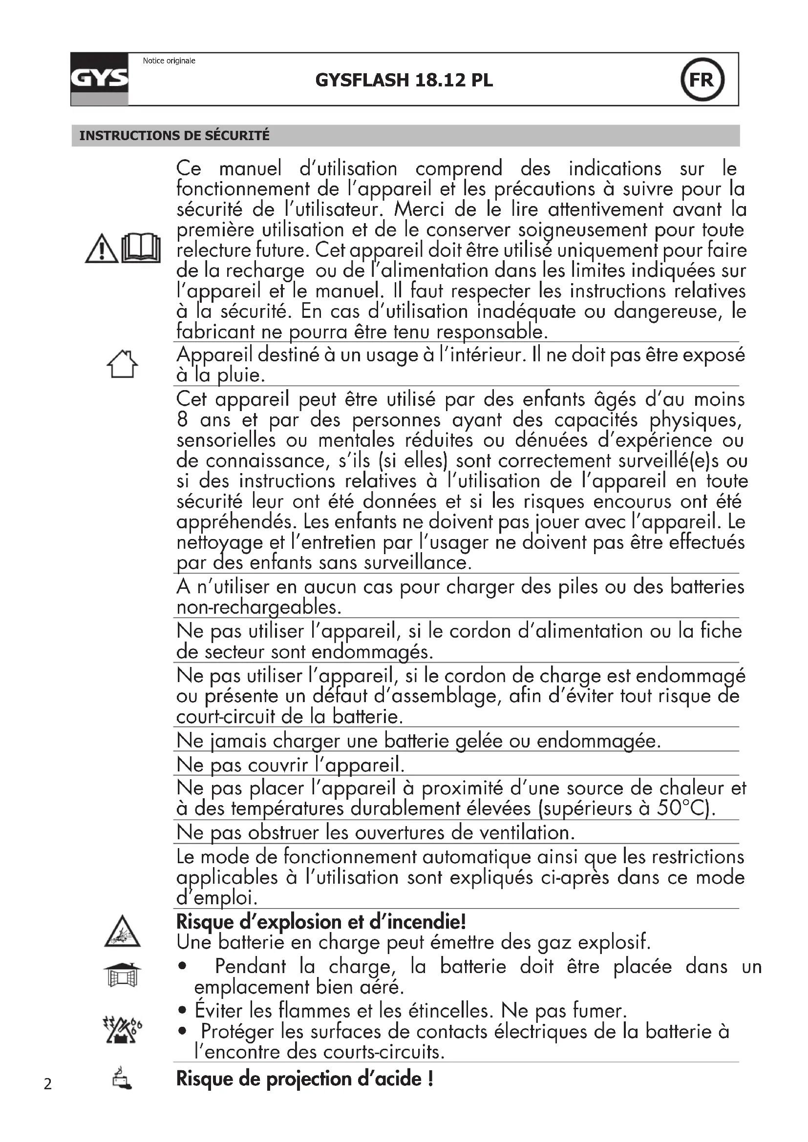 - Protéger les surfaces de contacts électriques de la batterie à l’encontre des courts-circuits. Risque de projection d’acide !3 GYSFLASH 18.12 PL