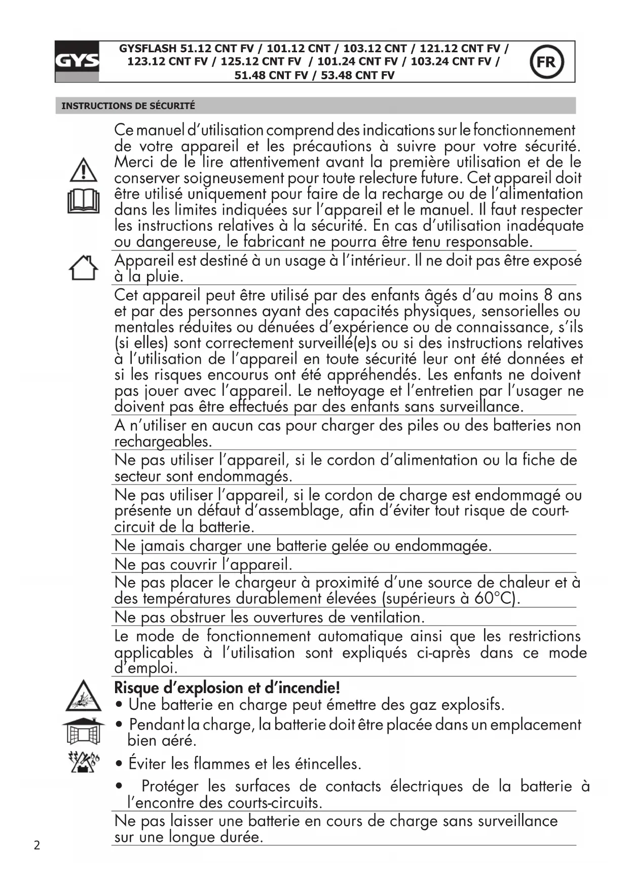 - Protéger les surfaces de contacts électriques de la batterie à l’encontre des courts-circuits. Ne pas laisser une batterie en cours de charge sans surveillance sur une longue durée.3 GYSFLASH 51.12 CNT FV / 101.12 CNT / 103.12 CNT / 121.12 CNT FV /