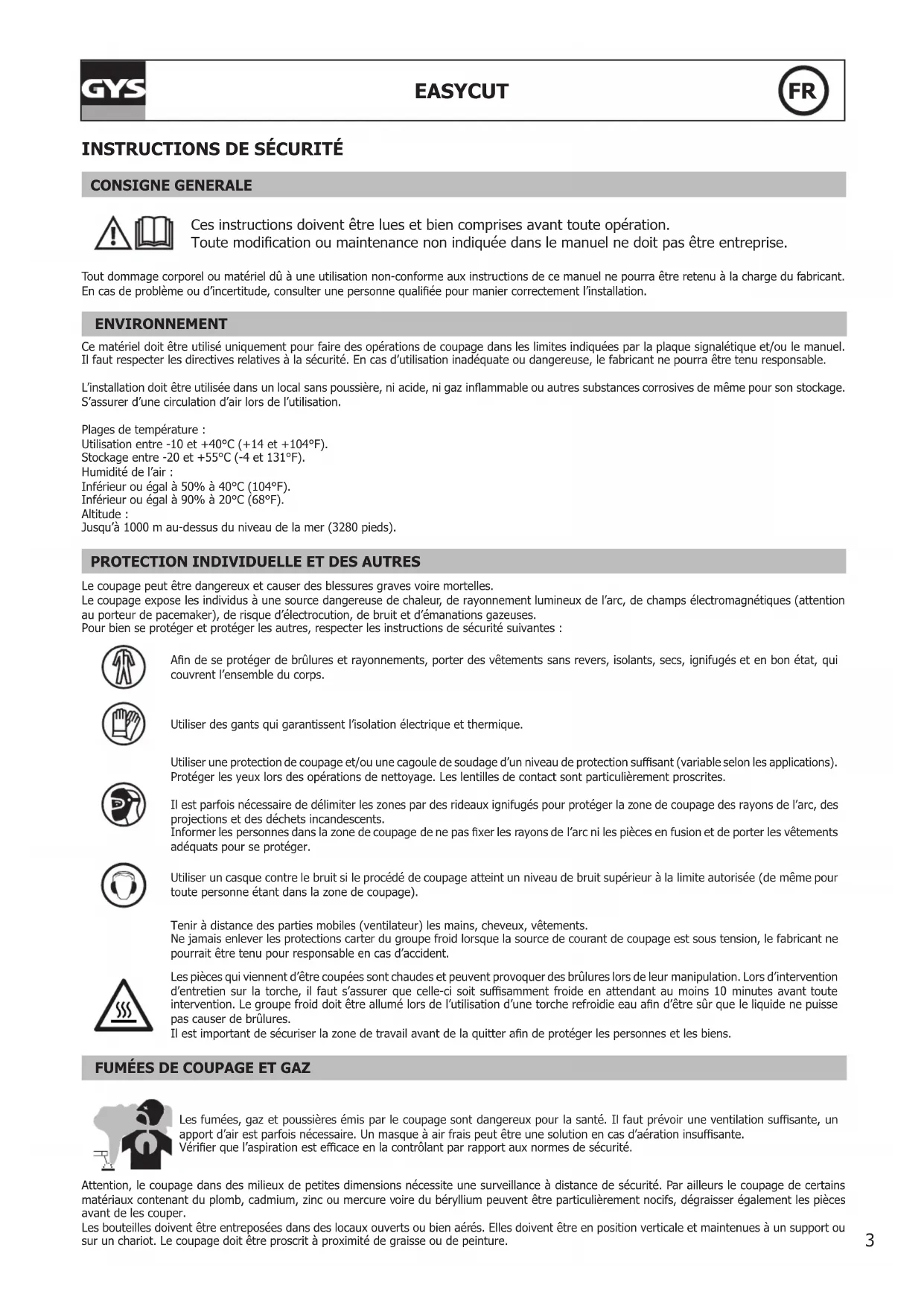 CONSIGNE GENERALE Ces instructions doivent être lues et bien comprises avant toute opération. Toute modication ou maintenance non indiquée dans le manuel ne doit pas être entreprise. Tout dommage corporel ou matériel dû à une utilisation non-conforme aux instructions de ce manuel ne pourra être retenu à la charge du fabricant. En cas de problème ou d’incertitude, consulter une personne qualiée pour manier correctement l’installation. ENVIRONNEMENT Ce matériel doit être utilisé uniquement pour faire des opérations de coupage dans les limites indiquées par la plaque signalétique et/ou le manuel. Il faut respecter les directives relatives à la sécurité. En cas d’utilisation inadéquate ou dangereuse, le fabricant ne pourra être tenu responsable. L’installation doit être utilisée dans un local sans poussière, ni acide, ni gaz inammable ou autres substances corrosives de même pour son stockage. S’assurer d’une circulation d’air lors de l’utilisation. Plages de température : Utilisation entre -10 et +40°C (+14 et +104°F). Stockage entre -20 et +55°C (-4 et 131°F). Humidité de l’air : Inférieur ou égal à 50% à 40°C (104°F). Inférieur ou égal à 90% à 20°C (68°F). Altitude : Jusqu’à 1000 m au-dessus du niveau de la mer (3280 pieds).