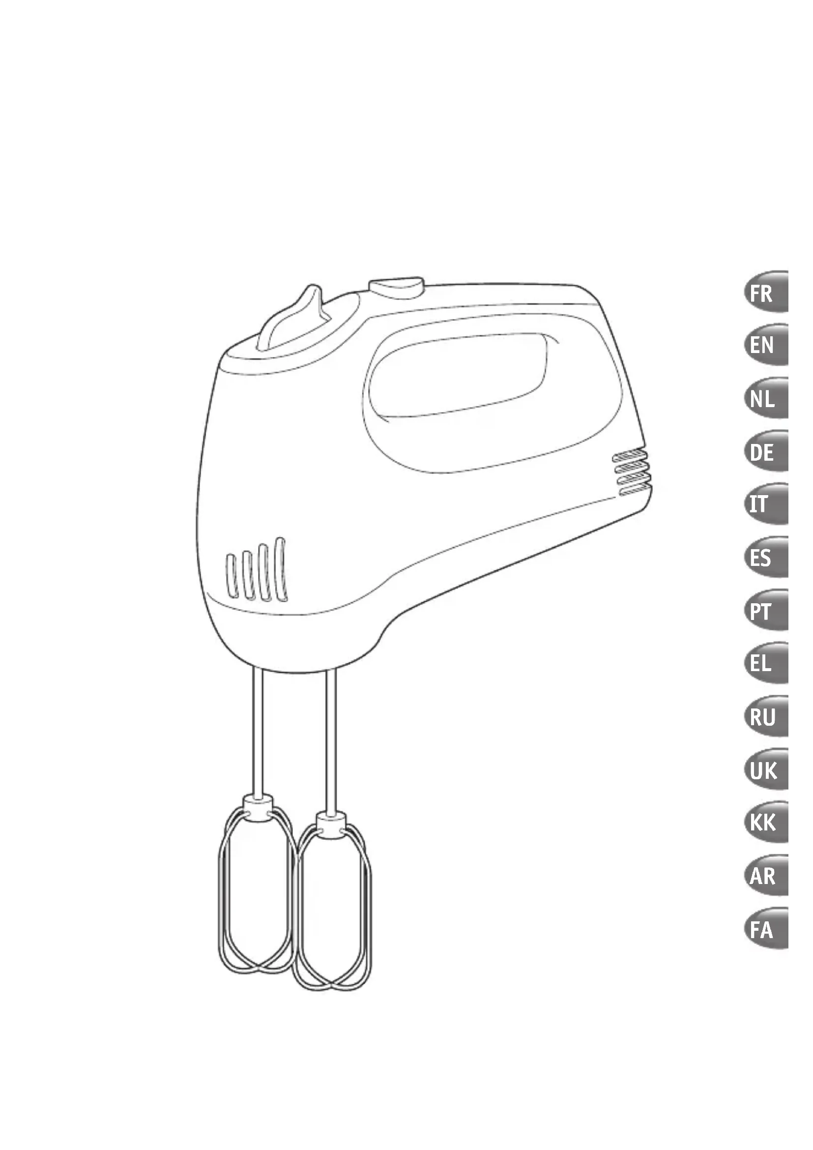 - Insérez la tige de chaque fouet (B) ou malaxeur (D) dans les trous correspondants et verrouillez-les. Les fouets et malaxeurs ont une forme spécifique. Le fouet ou malaxeur avec détrompeur (G) doit être placé à gauche dans le trou le plus grand (Fig.1). • Branchez l’appareil : - Votre appareil est doté de 5 vitesses et d’une touche turbo. Commencez toujours à mélanger ou pétrir en position 1 avant de passer en position 5. - Pour pétrir des pâtes lourdes et consistantes nous vous recommandons de travailler uniquement sur la position 5. - Vous pouvez également accroître la vitesse en appuyant sur la touche turbo (A2) ; cette fonction peut s’ajouter à toutes les vitesses. Nous vous conseillons toutefois de ne l’utiliser que brièvement (au maximum 30 s pour les pâtes consistantes).Attention : un livret de consignes de sécurité est fourni avec cet appareil. Avant d’utiliser votre appareil pour la première fois, lisez attentivement ce livret et conservez-le soigneu- sement. FR6