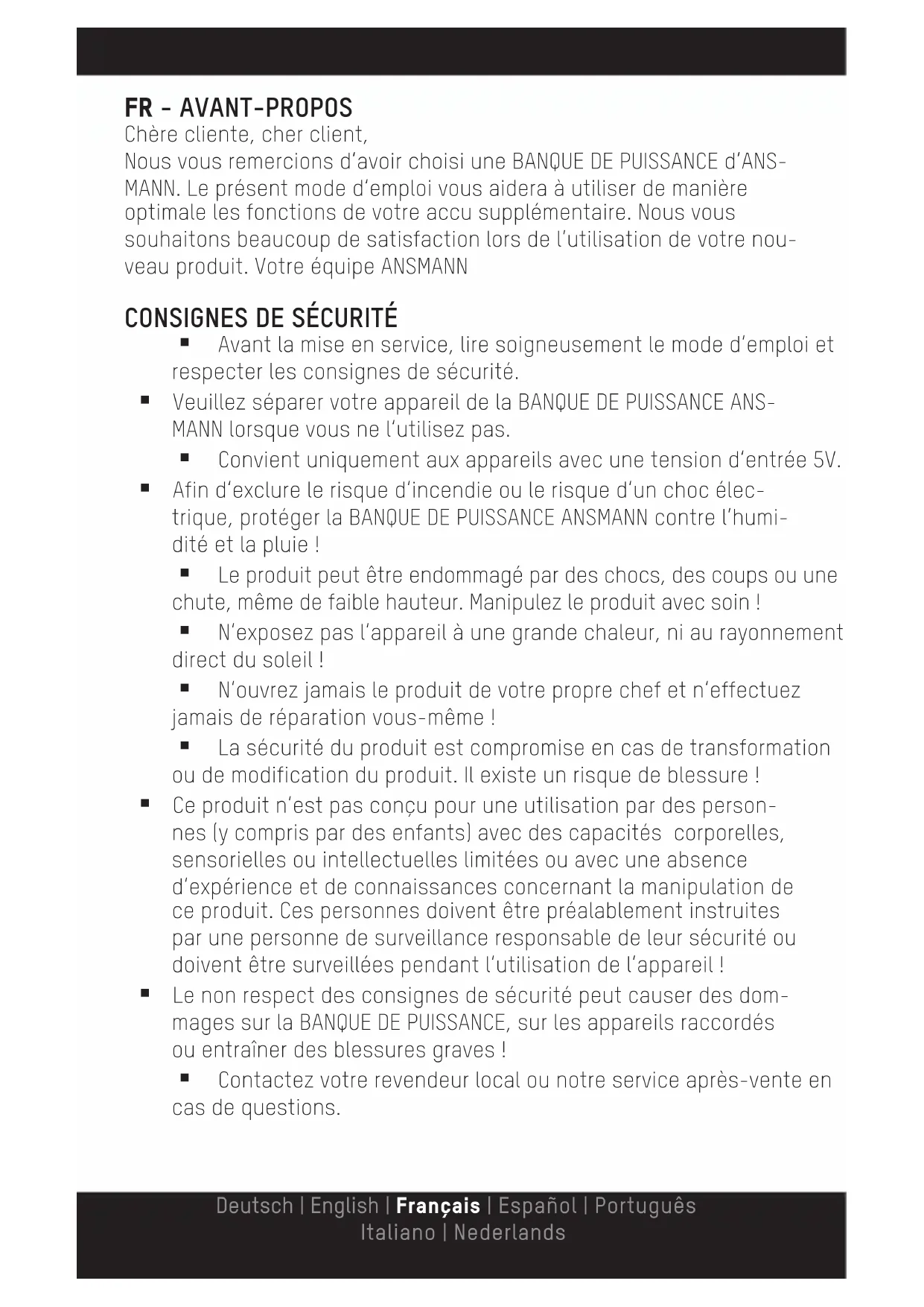 Avant la mise en service, lire soigneusement le mode d‘emploi et respecter les consignes de sécurité. Veuillez séparer votre appareil de la BANQUE DE PUISSANCE ANS- MANN lorsque vous ne l‘utilisez pas. Convient uniquement aux appareils avec une tension d‘entrée 5V. Afin d‘exclure le risque d‘incendie ou le risque d‘un choc élec- trique, protéger la BANQUE DE PUISSANCE ANSMANN contre l‘humi- dité et la pluie ! Le produit peut être endommagé par des chocs, des coups ou une chute, même de faible hauteur. Manipulez le produit avec soin ! N‘exposez pas l‘appareil à une grande chaleur, ni au rayonnement direct du soleil ! N‘ouvrez jamais le produit de votre propre chef et n‘effectuez jamais de réparation vous-même ! La sécurité du produit est compromise en cas de transformation ou de modification du produit. Il existe un risque de blessure ! Ce produit n‘est pas conçu pour une utilisation par des person- nes (y compris par des enfants) avec des capacités corporelles, sensorielles ou intellectuelles limitées ou avec une absence d‘expérience et de connaissances concernant la manipulation de ce produit. Ces personnes doivent être préalablement instruites par une personne de surveillance responsable de leur sécurité ou doivent être surveillées pendant l‘utilisation de l‘appareil ! Le non respect des consignes de sécurité peut causer des dom- mages sur la BANQUE DE PUISSANCE, sur les appareils raccordés ou entraîner des blessures graves ! Contactez votre revendeur local ou notre service après-vente en cas de questions. Deutsch | English | Français | Español | Português Italiano | NederlandsMISE EN SERVICE