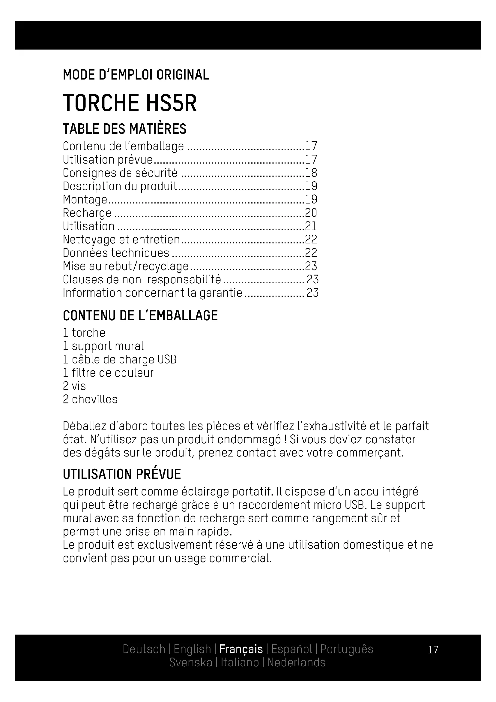 Le produit sert comme éclairage portatif. Il dispose d‘un accu intégré qui peut être rechargé grâce à un raccordement micro USB. Le support mural avec sa fonction de recharge sert comme rangement sûr et permet une prise en main rapide. Le produit est exclusivement réservé à une utilisation domestique et ne convient pas pour un usage commercial. Deutsch | English | Français | Español | Português Svenska | Italiano | Nederlands Deutsch | English | Français | Español | Português Svenska | Italiano | Nederlands18