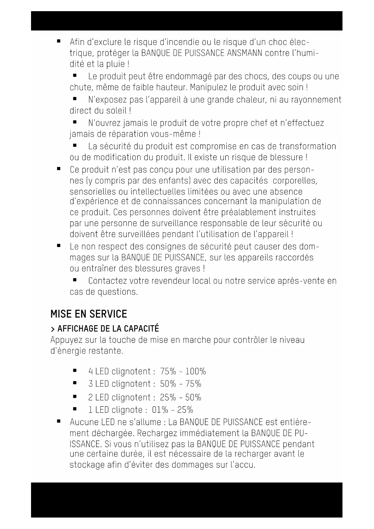 Avant la mise en service, lire soigneusement le mode d‘emploi et respecter les consignes de sécurité. Veuillez séparer votre appareil de la BANQUE DE PUISSANCE ANS- MANN lorsque vous ne l‘utilisez pas. Deutsch | English | Français | Español | Português Italiano | Nederlands Afin d‘exclure le risque d‘incendie ou le risque d‘un choc élec- trique, protéger la BANQUE DE PUISSANCE ANSMANN contre l‘humi- dité et la pluie ! Le produit peut être endommagé par des chocs, des coups ou une chute, même de faible hauteur. Manipulez le produit avec soin ! N‘exposez pas l‘appareil à une grande chaleur, ni au rayonnement direct du soleil ! N‘ouvrez jamais le produit de votre propre chef et n‘effectuez jamais de réparation vous-même ! La sécurité du produit est compromise en cas de transformation ou de modification du produit. Il existe un risque de blessure ! Ce produit n‘est pas conçu pour une utilisation par des person- nes (y compris par des enfants) avec des capacités corporelles, sensorielles ou intellectuelles limitées ou avec une absence d‘expérience et de connaissances concernant la manipulation de ce produit. Ces personnes doivent être préalablement instruites par une personne de surveillance responsable de leur sécurité ou doivent être surveillées pendant l‘utilisation de l‘appareil ! Le non respect des consignes de sécurité peut causer des dom- mages sur la BANQUE DE PUISSANCE, sur les appareils raccordés ou entraîner des blessures graves ! Contactez votre revendeur local ou notre service après-vente en cas de questions.