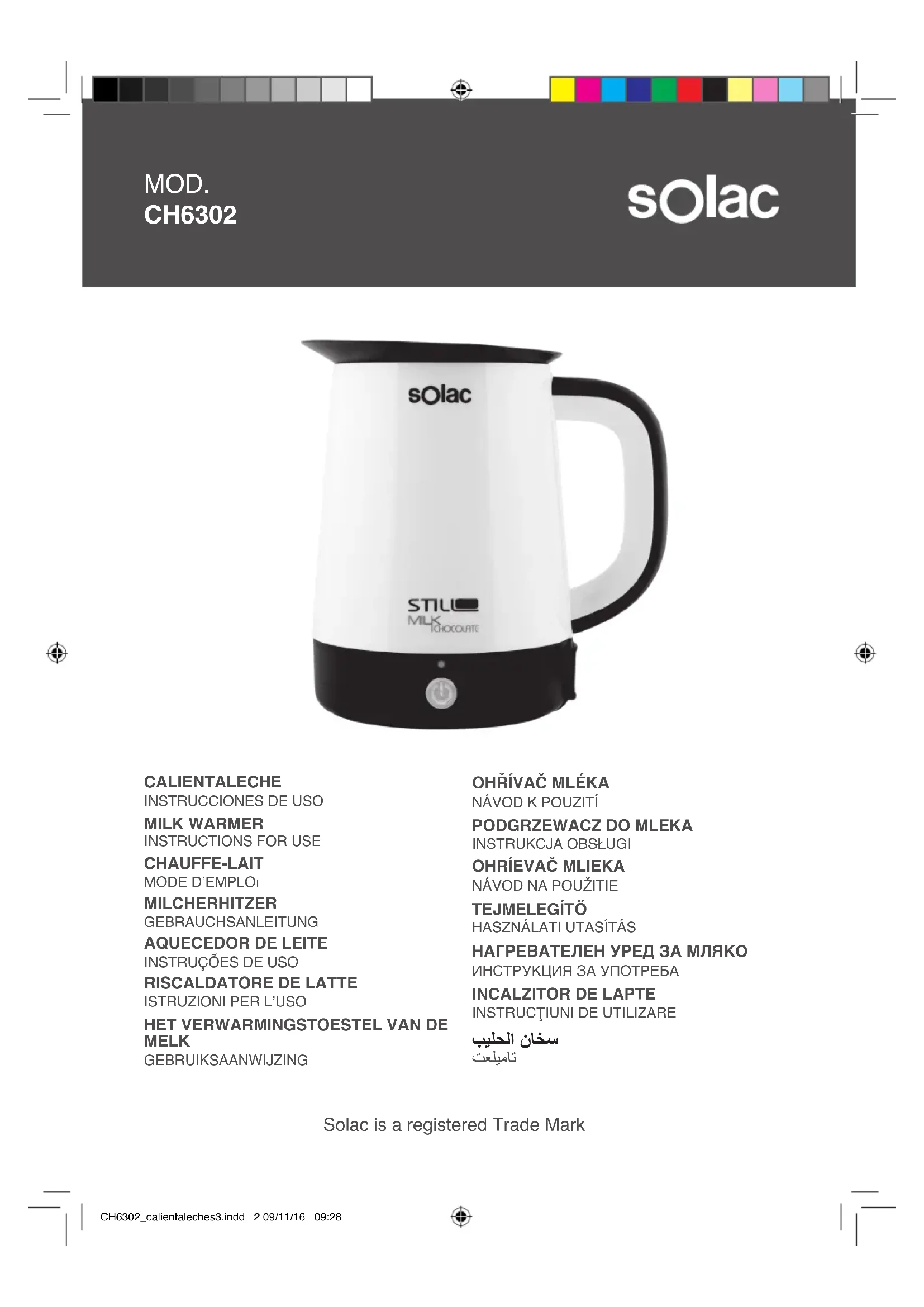 - When the appliance is not in use, unplug it and store it in a cool, dry place. This appliance complies with Directive 2014/35/ EU on Low Voltage, Directive 2014/30/EU on Electromagnetic Compatibility, Directive 2011/65/EU on the restrictions of the use of certain hazardous substances in electrical and electronic equipment and Directive 2009/125/ EC on the ecodesign requirements for ener- gy-related products CH6302_calientaleches3.indd 9 09/11/16 09:28FRANÇAIS FR CHER CLIENT : Nous vous félicitons d’avoir choisi un produit de la marque SOLAC. Nous concevons et fabri- quons nos produits an de satisfaire les clients les plus exigeants, et pour longtemps. Vous pou- vez avoir l’esprit tranquille : les appareils élec- troménagers SOLAC ont passé avec succès les tests de qualité et de sécurité les plus stricts. Electrodomésticos SOLAC, an de pouvoir sans cesse s’améliorer, se réserve le droit d’apporter des modications sans préavis.