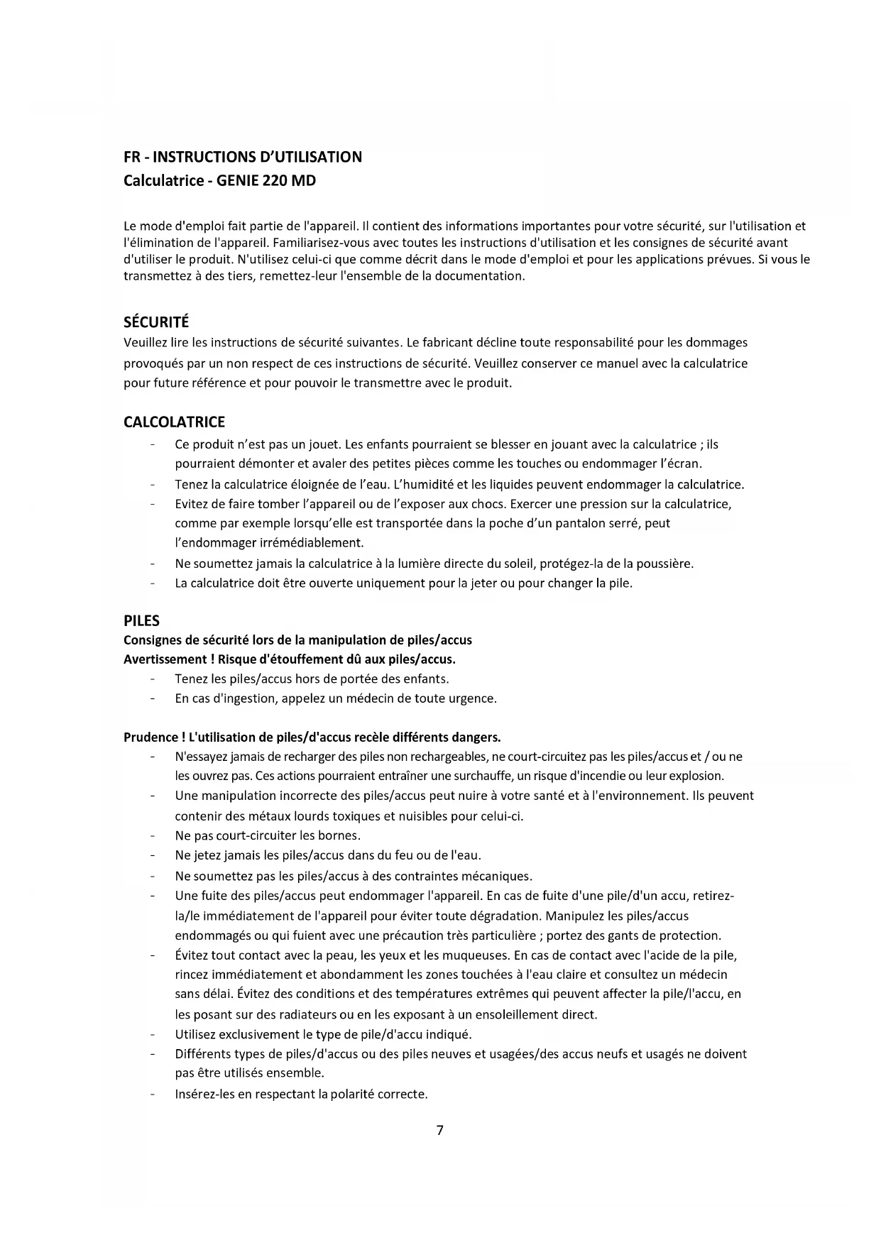 Calculatrice - GENIE 220 MD Le mode d'emploi fait partie de l'appareil. Il contient des informations importantes pour votre sécurité, sur l'utilisation et l'élimination de l'appareil. Familiarisez-vous avec toutes les instructions d'utilisation et les consignes de sécurité avant d'utiliser le produit. N'utilisez celui-ci que comme décrit dans le mode d'emploi et pour les applications prévues. Si vous le transmettez à des tiers, remettez-leur l'ensemble de la documentation. SÉCURITÉ Veuillez lire les instructions de sécurité suivantes. Le fabricant décline toute responsabilité pour les dommages provoqués par un non respect de ces instructions de sécurité. Veuillez conserver ce manuel avec la calculatrice pour future référence et pour pouvoir le transmettre avec le produit. CALCOLATRICE - Ce produit n’est pas un jouet. Les enfants pourraient se blesser en jouant avec la calculatrice ; ils pourraient démonter et avaler des petites pièces comme les touches ou endommager l’écran. - Tenez la calculatrice éloignée de l’eau. L’humidité et les liquides peuvent endommager la calculatrice. - Evitez de faire tomber l’appareil ou de l’exposer aux chocs. Exercer une pression sur la calculatrice, comme par exemple lorsqu’elle est transportée dans la poche d’un pantalon serré, peut l’endommager irrémédiablement. - Ne soumettez jamais la calculatrice à la lumière directe du soleil, protégez-la de la poussière. - La calculatrice doit être ouverte uniquement pour la jeter ou pour changer la pile. PILES Consignes de sécurité lors de la manipulation de piles/accus Avertissement ! Risque d'étouffement dû aux piles/accus. - Tenez les piles/accus hors de portée des enfants. - En cas d'ingestion, appelez un médecin de toute urgence. Prudence ! L'utilisation de piles/d'accus recèle différents dangers. - N'essayez jamais de recharger des piles non rechargeables, ne court-circuitez pas les piles/accus et / ou ne les ouvrez pas. Ces actions pourraient entraîner une surchauffe, un risque d'incendie ou leur explosion. - Une manipulation incorrecte des piles/accus peut nuire à votre santé et à l'environnement. Ils peuvent contenir des métaux lourds toxiques et nuisibles pour celui-ci. - Ne pas co urt-circuiter les bornes. - Ne jetez jamais les piles/accus dans du feu ou de l'eau. - Ne soumettez pas les piles/accus à des contraintes mécaniques. - Une fuite des piles/accus peut endommager l'appareil. En cas de fuite d'une pile/d'un accu, retirez- la/le immédiatement de l'appareil pour éviter toute dégradation. Manipulez les piles/accus endommagés ou qui fuient avec une précaution très particulière ; portez des gants de protection. - Évitez tout contact avec la peau, les yeux et les muqueuses. En cas de contact avec l'acide de la pile, rincez immédiatement et abondamment les zones touchées à l'eau claire et consultez un médecin sans délai. Évitez des conditions et des températures extrêmes qui peuvent affecter la pile/l'accu, en les posant sur des radiateurs ou en les exposant à un ensoleillement direct. - Utilisez exclusivement le type de pile/d'accu indiqué. - Différents types de piles/d'accus ou des piles neuves et usagées/des accus neufs et usagés ne doivent pas être utilisés ensemble. - Insérez-les en respectant la polarité correcte.8