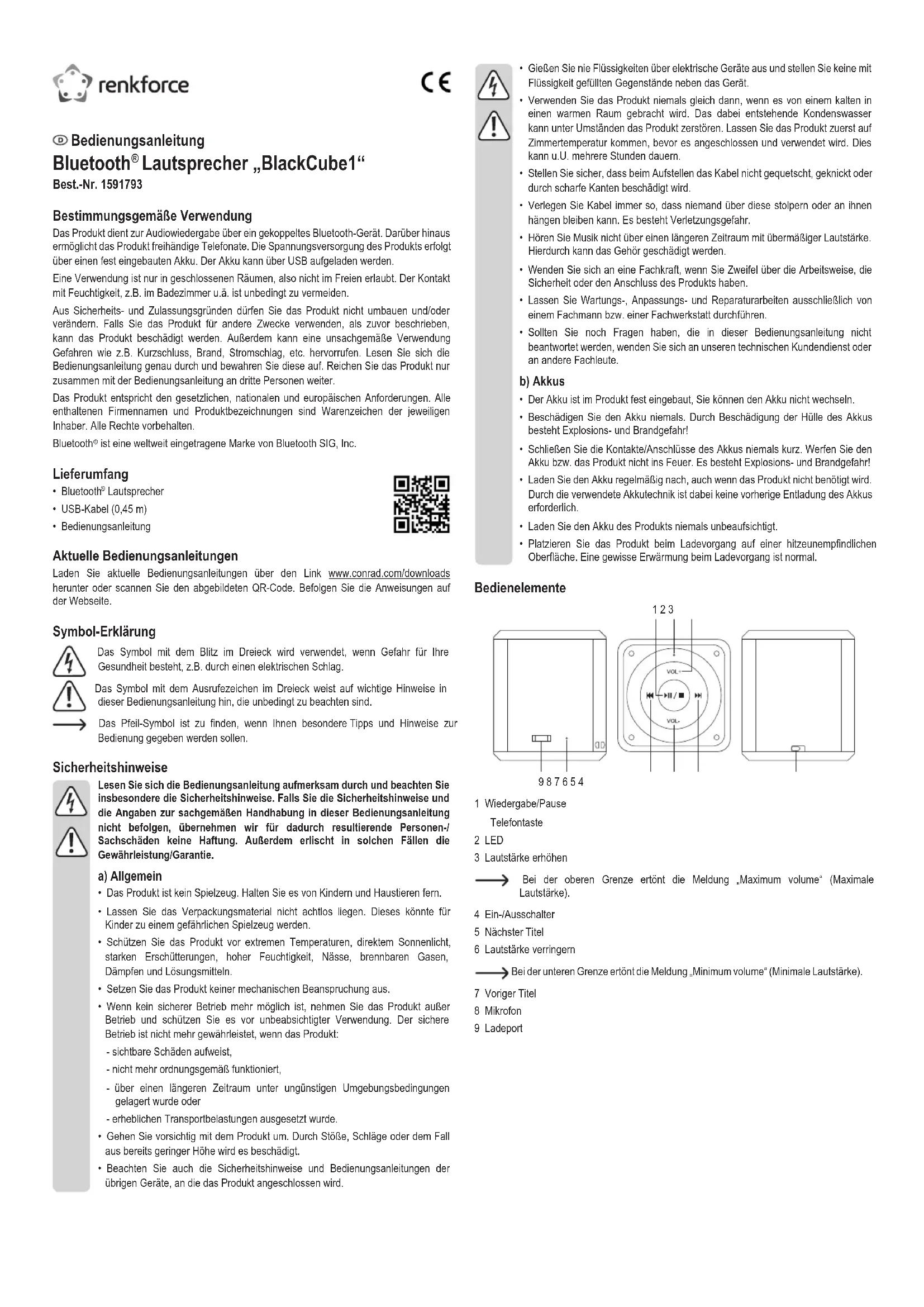 « BlackCube1 » N° de commande 1591793 Utilisation prévue Le produit sert à écouter les lectures audio réalisé à partir d'un appareil Bluetooth couplé. En plus, le produit permet d'effectuer des appels téléphoniques en mains libres. L'alimentation électrique du produit est réalisée via un accu intégré non amovible. L'accu peut être rechargé via USB.L'utilisation est uniquement autorisée en intérieur, dans les locaux fermés ; l'utilisation en plein air est interdite. Éviter impérativement tout contact avec l'humidité, par ex. dans une salle de bains, etc.Pour des raisons de sécurité et d'homologation, toute transformation et/ou modication du produit est interdite. Si vous utilisez le produit à d’autres ns que celles décrites précédemment, vous risquez de l’endommager. Par ailleurs, une utilisation incorrecte peut être source de dangers tels que court-circuit, incendie, électrocution. Lisez attentivement le mode d'emploi et conservez-le. Ne donnez le produit à un tiers qu'accompagné de son mode d'emploi.Le produit est conforme aux exigences des directives européennes et nationales en vigueur. Tous les noms d'entreprises et appellations de produits contenus dans ce mode d'emploi sont des marques déposées des propriétaires correspondants. Tous droits réservés.Bluetooth est une marque déposée de Bluetooth SIG, Inc. dans le monde entier. Contenu d'emballage
