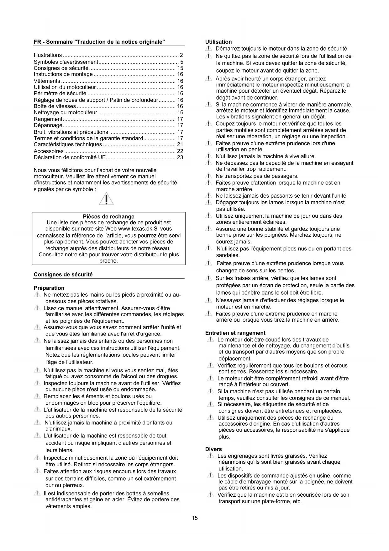 Pièces de rechange Une liste des pièces de rechange de ce produit est disponible sur notre site Web www.texas.dk Si vous connaissez la référence de l’article, vous pourrez être servi plus rapidement. Vous pouvez acheter vos pièces de rechange auprès des distributeurs de notre réseau. Consultez notre site pour trouver votre distributeur le plus proche. Consignes de sécurité Préparation Ne mettez pas les mains ou les pieds à proximité ou au- dessous des pièces rotatives. Lisez ce manuel attentivement. Assurez-vous d'être familiarisé avec les différentes commandes, les réglages et les poignées de l'équipement. Assurez-vous que vous savez comment arrêter l'unité et que vous êtes familiarisé avec l'arrêt d'urgence. Ne laissez jamais des enfants ou des personnes non familiarisées avec ces instructions utiliser l'équipement. Notez que les réglementations locales peuvent limiter l'âge de l'utilisateur. N'utilisez pas la machine si vous vous sentez mal, êtes fatigué ou avez consommé de l'alcool ou des drogues. Inspectez toujours la machine avant de l'utiliser. Vérifiez qu'aucune pièce n'est usée ou endommagée. Remplacez les éléments et boulons usés ou endommagés en bloc pour préserver l'équilibre. L'utilisateur de la machine est responsable de la sécurité des autres personnes. N'utilisez jamais la machine à proximité d'enfants ou d'animaux. L'utilisateur de la machine est responsable de tout accident ou risque impliquant d'autres personnes et leurs biens. Inspectez minutieusement la zone où l'équipement doit être utilisé. Retirez si nécessaire les corps étrangers. Faites attention aux risques encourus lors des travaux sur des terrains difficiles, comme un sol extrêmement dur ou pierreux. Il est indispensable de porter des bottes à semelles antidérapantes et gaine en acier. Évitez de portere des vêtements amples. Utilisation Démarrez toujours le moteur dans la zone de sécurité. Ne quittez pas la zone de sécurité lors de l'utilisation de la machine. Si vous devez quitter la zone de sécurité, coupez le moteur avant de quitter la zone. Après avoir heurté un corps étranger, arrêtez immédiatement le moteur inspectez minutieusement la machine pour détecter un éventuel dégât. Réparez le dégât avant de continuer. Si la machine commence à vibrer de manière anormale, arrêtez le moteur et identifiez immédiatement la cause. Les vibrations signalent en général un dégât. Coupez toujours le moteur et vérifiez que toutes les parties mobiles sont complètement arrêtées avant de réaliser une réparation, un réglage ou une inspection. Faites preuve d'une extrême prudence lors d'une utilisation en pente. N'utilisez jamais la machine à vive allure. Ne dépassez pas la capacité de la machine en essayant de travailler trop rapidement. Ne transportez pas de passagers. Faites preuve d'attention lorsque la machine est en marche arrière. Ne laissez jamais des passants se tenir devant l'unité. Dégagez toujours les lames lorsque la machine n'est pas utilisée. Utilisez uniquement la machine de jour ou dans des zones entièrement éclairées. Assurez une bonne stabilité et gardez toujours une bonne prise sur les poignées. Marchez toujours, ne courez jamais. N'utilisez pas l'équipement pieds nus ou en portant des sandales. Faites preuve d'une extrême prudence lorsque vous changez de sens sur les pentes. Sur les fraises arrière, vérifiez que les lames sont protégées par un écran de protection, seule la partie des lames qui pénètre dans le sol doit être libre. N'essayez jamais d'effectuer des réglages lorsque le moteur est en marche. Faites preuve d'une extrême prudence en marche arrière ou lorsque vous tirez la machine en arrière. Entretien et rangement Le moteur doit être coupé lors des travaux de maintenance et de nettoyage, du changement d'outils et du transport par d'autres moyens que son propre déplacement. Vérifiez régulièrement que tous les boulons et écrous sont serrés. Resserrez-les si nécessaire. Le moteur doit être complètement refroidi avant d'être rangé à l'intérieur ou couvert. Si la machine n'est pas utilisée pendant un certain temps, veuillez consulter les consignes de ce manuel. Si nécessaire, les étiquettes de sécurité et de consignes doivent être entretenues et remplacées. Utilisez uniquement des pièces de rechange ou accessoires d'origine. En cas d'utilisation d'autres pièces ou accessoires, la responsabilité ne s'applique plus. Divers Les engrenages sont livrés graissés. Vérifiez néanmoins qu'ils sont bien graissés avant chaque utilisation. Les dispositifs de commande ajustés en usine, comme le câble d'embrayage monté sur la poignée, ne doivent pas être retirés ou mis à jour. Vérifiez que la machine est bien sécurisée lors de son transport sur une plate-forme, etc.16