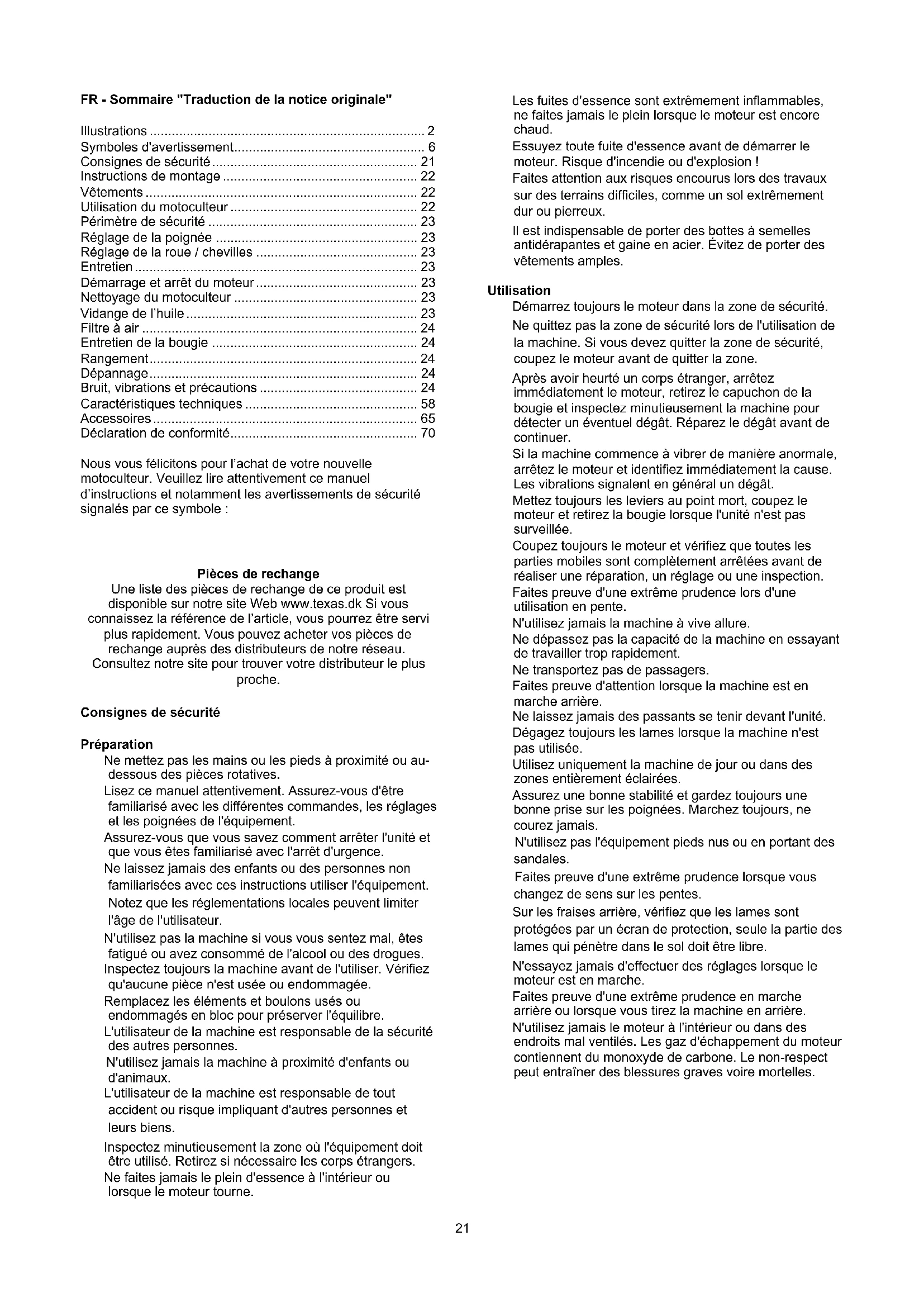 Pièces de rechange Une liste des pièces de rechange de ce produit est disponible sur notre site Web www.texas.dk Si vous connaissez la référence de l’article, vous pourrez être servi plus rapidement. Vous pouvez acheter vos pièces de rechange auprès des distributeurs de notre réseau. Consultez notre site pour trouver votre distributeur le plus proche. Consignes de sécurité Préparation Ne mettez pas les mains ou les pieds à proximité ou au- dessous des pièces rotatives. Lisez ce manuel attentivement. Assurez-vous d'être familiarisé avec les différentes commandes, les réglages et les poignées de l'équipement. Assurez-vous que vous savez comment arrêter l'unité et que vous êtes familiarisé avec l'arrêt d'urgence. Ne laissez jamais des enfants ou des personnes non familiarisées avec ces instructions utiliser l'équipement. Notez que les réglementations locales peuvent limiter l'âge de l'utilisateur. N'utilisez pas la machine si vous vous sentez mal, êtes fatigué ou avez consommé de l'alcool ou des drogues. Inspectez toujours la machine avant de l'utiliser. Vérifiez qu'aucune pièce n'est usée ou endommagée. Remplacez les éléments et boulons usés ou endommagés en bloc pour préserver l'équilibre. L'utilisateur de la machine est responsable de la sécurité des autres personnes. N'utilisez jamais la machine à proximité d'enfants ou d'animaux. L'utilisateur de la machine est responsable de tout accident ou risque impliquant d'autres personnes et leurs biens. Inspectez minutieusement la zone où l'équipement doit être utilisé. Retirez si nécessaire les corps étrangers. Ne faites jamais le plein d'essence à l'intérieur ou lorsque le moteur tourne. Les fuites d'essence sont extrêmement inflammables, ne faites jamais le plein lorsque le moteur est encore chaud. Essuyez toute fuite d'essence avant de démarrer le moteur. Risque d'incendie ou d'explosion ! Faites attention aux risques encourus lors des travaux sur des terrains difficiles, comme un sol extrêmement dur ou pierreux. Il est indispensable de porter des bottes à semelles antidérapantes et gaine en acier. Évitez de porter des vêtements amples. Utilisation Démarrez toujours le moteur dans la zone de sécurité. Ne quittez pas la zone de sécurité lors de l'utilisation de la machine. Si vous devez quitter la zone de sécurité, coupez le moteur avant de quitter la zone. Après avoir heurté un corps étranger, arrêtez immédiatement le moteur, retirez le capuchon de la bougie et inspectez minutieusement la machine pour détecter un éventuel dégât. Réparez le dégât avant de continuer. Si la machine commence à vibrer de manière anormale, arrêtez le moteur et identifiez immédiatement la cause. Les vibrations signalent en général un dégât. Mettez toujours les leviers au point mort, coupez le moteur et retirez la bougie lorsque l'unité n'est pas surveillée. Coupez toujours le moteur et vérifiez que toutes les parties mobiles sont complètement arrêtées avant de réaliser une réparation, un réglage ou une inspection. Faites preuve d'une extrême prudence lors d'une utilisation en pente. N'utilisez jamais la machine à vive allure. Ne dépassez pas la capacité de la machine en essayant de travailler trop rapidement. Ne transportez pas de passagers. Faites preuve d'attention lorsque la machine est en marche arrière. Ne laissez jamais des passants se tenir devant l'unité. Dégagez toujours les lames lorsque la machine n'est pas utilisée. Utilisez uniquement la machine de jour ou dans des zones entièrement éclairées. Assurez une bonne stabilité et gardez toujours une bonne prise sur les poignées. Marchez toujours, ne courez jamais. N'utilisez pas l'équipement pieds nus ou en portant des sandales. Faites preuve d'une extrême prudence lorsque vous changez de sens sur les pentes. Sur les fraises arrière, vérifiez que les lames sont protégées par un écran de protection, seule la partie des lames qui pénètre dans le sol doit être libre. N'essayez jamais d'effectuer des réglages lorsque le moteur est en marche. Faites preuve d'une extrême prudence en marche arrière ou lorsque vous tirez la machine en arrière. N'utilisez jamais le moteur à l'intérieur ou dans des endroits mal ventilés. Les gaz d'échappement du moteur contiennent du monoxyde de carbone. Le non-respect peut entraîner des blessures graves voire mortelles.22