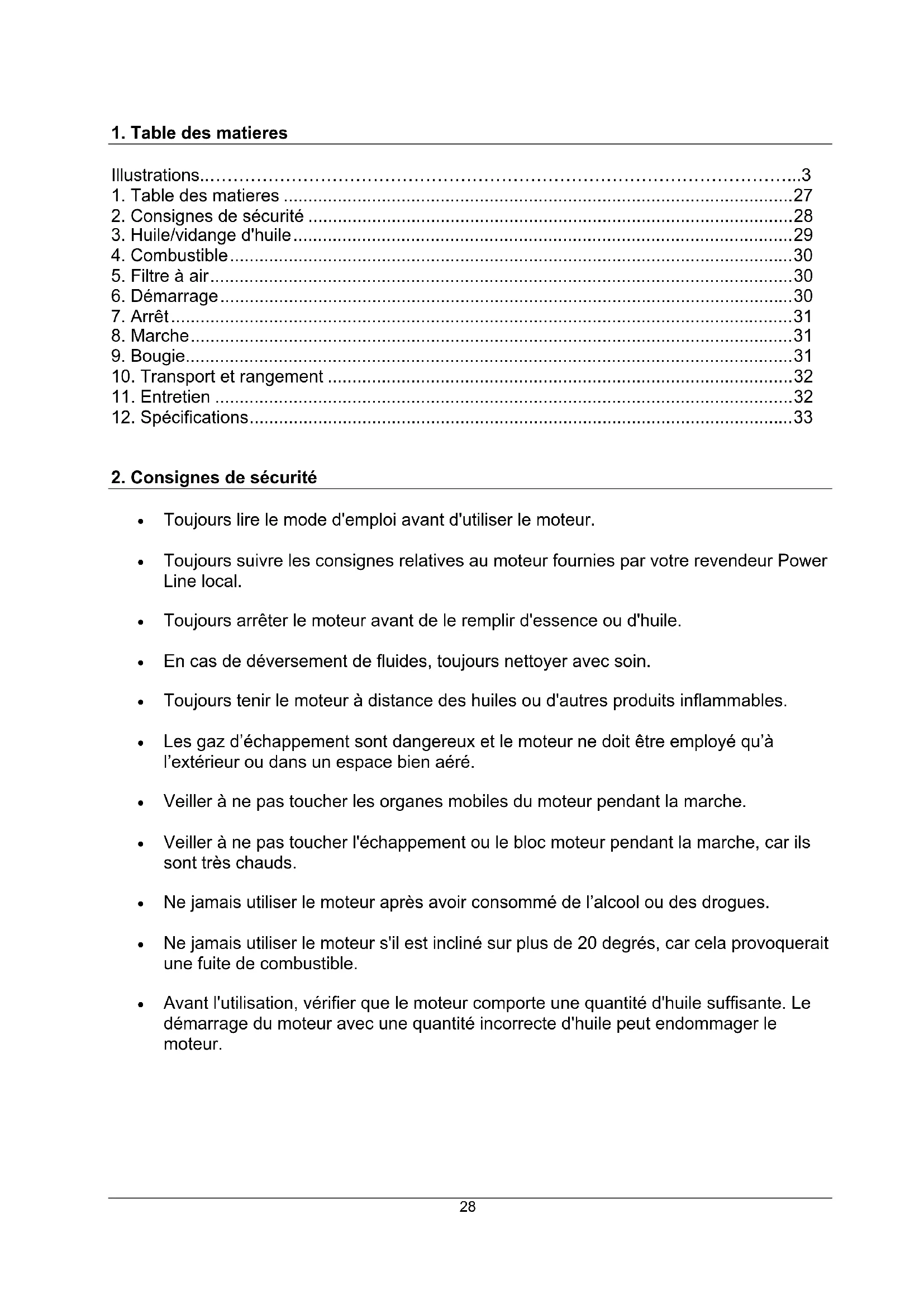 - Toujours suivre les consignes relatives au moteur fournies par votre revendeur Power Line local.