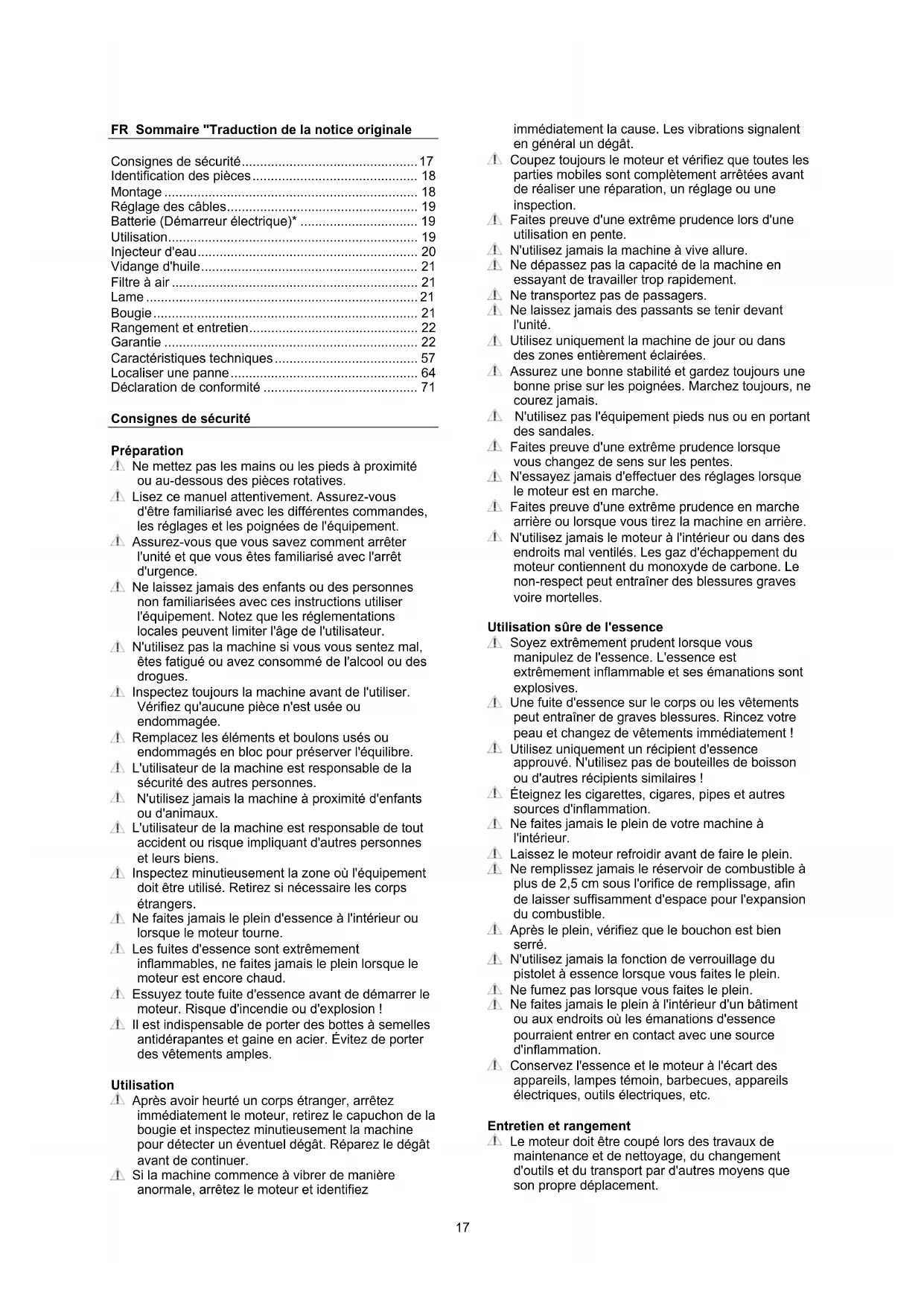 - Déclaration de conformité Consignes de sécurité Préparation Ne mettez pas les mains ou les pieds à proximité ou au-dessous des pièces rotatives. Lisez ce manuel attentivement. Assurez-vous d'être familiarisé avec les différentes commandes, les réglages et les poignées de l'équipement. Assurez-vous que vous savez comment arrêter l'unité et que vous êtes familiarisé avec l'arrêt d'urgence. Ne laissez jamais des enfants ou des personnes non familiarisées avec ces instructions utiliser l'équipement. Notez que les réglementations locales peuvent limiter l'âge de l'utilisateur. N'utilisez pas la machine si vous vous sentez mal, êtes fatigué ou avez consommé de l'alcool ou des drogues. Inspectez toujours la machine avant de l'utiliser. Vérifiez qu'aucune pièce n'est usée ou endommagée. Remplacez les éléments et boulons usés ou endommagés en bloc pour préserver l'équilibre. L'utilisateur de la machine est responsable de la sécurité des autres personnes. N'utilisez jamais la machine à proximité d'enfants ou d'animaux. L'utilisateur de la machine est responsable de tout accident ou risque impliquant d'autres personnes et leurs biens. Inspectez minutieusement la zone où l'équipement doit être utilisé. Retirez si nécessaire les corps étrangers. Ne faites jamais le plein d'essence à l'intérieur ou lorsque le moteur tourne. Les fuites d'essence sont extrêmement inflammables, ne faites jamais le plein lorsque le moteur est encore chaud. Essuyez toute fuite d'essence avant de démarrer le moteur. Risque d'incendie ou d'explosion ! Il est indispensable de porter des bottes à semelles antidérapantes et gaine en acier. Évitez de porter des vêtements amples. Utilisation Après avoir heurté un corps étranger, arrêtez immédiatement le moteur, retirez le capuchon de la bougie et inspectez minutieusement la machine pour détecter un éventuel dégât. Réparez le dégât avant de continuer. Si la machine commence à vibrer de manière anormale, arrêtez le moteur et identifiez immédiatement la cause. Les vibrations signalent en général un dégât. Coupez toujours le moteur et vérifiez que toutes les parties mobiles sont complètement arrêtées avant de réaliser une réparation, un réglage ou une inspection. Faites preuve d'une extrême prudence lors d'une utilisation en pente. N'utilisez jamais la machine à vive allure. Ne dépassez pas la capacité de la machine en essayant de travailler trop rapidement. Ne transportez pas de passagers. Ne laissez jamais des passants se tenir devant l'unité. Utilisez uniquement la machine de jour ou dans des zones entièrement éclairées. Assurez une bonne stabilité et gardez toujours une bonne prise sur les poignées. Marchez toujours, ne courez jamais. N'utilisez pas l'équipement pieds nus ou en portant des sandales. Faites preuve d'une extrême prudence lorsque vous changez de sens sur les pentes. N'essayez jamais d'effectuer des réglages lorsque le moteur est en marche. Faites preuve d'une extrême prudence en marche arrière ou lorsque vous tirez la machine en arrière. N'utilisez jamais le moteur à l'intérieur ou dans des endroits mal ventilés. Les gaz d'échappement du moteur contiennent du monoxyde de carbone. Le non-respect peut entraîner des blessures graves voire mortelles. Utilisation sûre de l'essence Soyez extrêmement prudent lorsque vous manipulez de l'essence. L'essence est extrêmement inflammable et ses émanations sont explosives. Une fuite d'essence sur le corps ou les vêtements peut entraîner de graves blessures. Rincez votre peau et changez de vêtements immédiatement ! Utilisez uniquement un récipient d'essence approuvé. N'utilisez pas de bouteilles de boisson ou d'autres récipients similaires ! Éteignez les cigarettes, cigares, pipes et autres sources d'inflammation. Ne faites jamais le plein de votre machine à l'intérieur. Laissez le moteur refroidir avant de faire le plein. Ne remplissez jamais le réservoir de combustible à plus de 2,5 cm sous l'orifice de remplissage, afin de laisser suffisamment d'espace pour l'expansion du combustible. Après le plein, vérifiez que le bouchon est bien serré. N'utilisez jamais la fonction de verrouillage du pistolet à essence lorsque vous faites le plein. Ne fumez pas lorsque vous faites le plein. Ne faites jamais le plein à l'intérieur d'un bâtiment ou aux endroits où les émanations d'essence pourraient entrer en contact avec une source d'inflammation. Conservez l'essence et le moteur à l'écart des appareils, lampes témoin, barbecues, appareils électriques, outils électriques, etc. Entretien et rangement Le moteur doit être coupé lors des travaux de maintenance et de nettoyage, du changement d'outils et du transport par d'autres moyens que son propre déplacement.18 Vérifiez régulièrement que tous les boulons et écrous sont serrés. Resserrez-les si nécessaire. Le moteur doit être complètement refroidi avant d'être rangé à l'intérieur ou couvert. Si la machine n'est pas utilisée pendant un certain temps, veuillez consulter les consignes de ce manuel. Si nécessaire, les étiquettes de sécurité et de consignes doivent être entretenues et remplacées. Utilisez uniquement des pièces de rechange ou accessoires d'origine. En cas d'utilisation d'autres pièces ou accessoires, la responsabilité ne s'applique plus. Divers Le moteur n'est pas livré avec le plein d'huile. Les dispositifs de commande ajustés en usine, comme le câble d'embrayage monté sur la poignée, ne doivent pas être retirés ou mis à jour. Ne purgez le réservoir de combustible qu'à l'extérieur. L'essence est extrêmement inflammable et ses émanations sont explosives. Vérifiez que la machine est bien sécurisée lors de son transport sur une plate-forme, etc. Les déchets de produits électriques ne doivent pas être jetés avec les déchets domestiques. Ils doivent être déposés dans votre centre de recyclage local pour un 