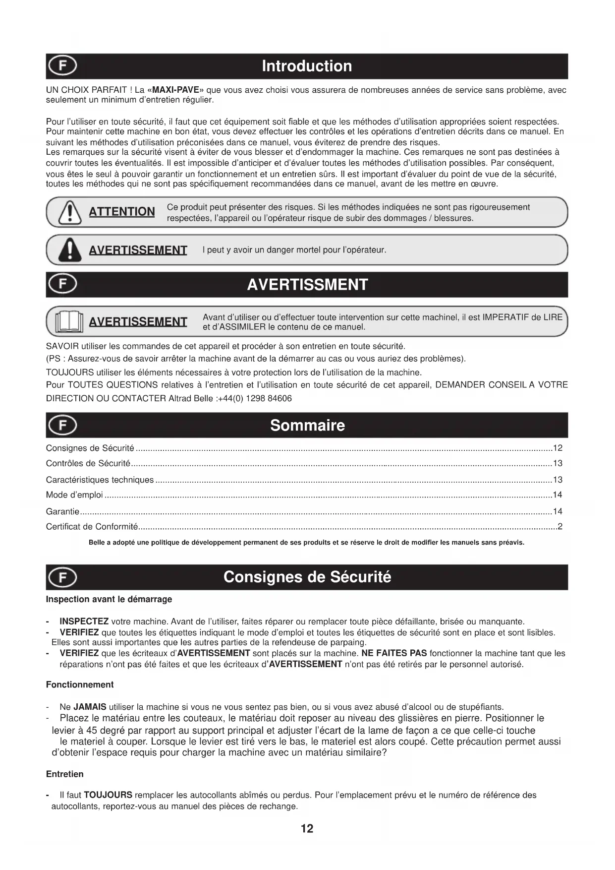 Placez le matériau entre les couteaux, le matériau doit reposer au niveau des glissières en pierre. Positionner le levier à 45 degré par rapport au support principal et adjuster l’écart de la lame de façon a ce que celle-ci touche le materiel à couper. Lorsque le levier est tiré vers le bas, le materiel est alors coupé. Cette précaution permet aussi d’obtenir l’espace requis pour charger la machine avec un matériau similaire? Entretien - Il faut TOUJOURS remplacer les autocollants abîmés ou perdus. Pour l’emplacement prévu et le numéro de référence des autocollants, reportez-vous au manuel des pièces de rechange. l peut y avoir un danger mortel pour l’opérateur. AVERTISSEMENT Ce produit peut présenter des risques. Si les méthodes indiquées ne sont pas rigoureusement respectées, l’appareil ou l’opérateur risque de subir des dommages / blessures. ATTENTION AVERTISSMENT Sommaire Avant d’utiliser ou d’effectuer toute intervention sur cette machinel, il est IMPERATIF de LIRE et d’ASSIMILER le contenu de ce manuel. AVERTISSEMENT SAVOIR utiliser les commandes de cet appareil et procéder à son entretien en toute sécurité. (PS : Assurez-vous de savoir arrêter la machine avant de la démarrer au cas ou vous auriez des problèmes). TOUJOURS utiliser les éléments nécessaires à votre protection lors de l’utilisation de la machine. Pour TOUTES QUESTIONS relatives à l’entretien et l’utilisation en toute sécurité de cet appareil, DEMANDER CONSEIL A VOTRE DIRECTION OU CONTACTER Altrad Belle :+44(0) 1298 8460613 Contrôles de Sécurité Caractéristiques techniques Chaque jour, avant le démarrage, en plus de l’entretien régulier qui demande 10 minutes, contrôlez les éléments suivants pour garantir leur performance sans problème.