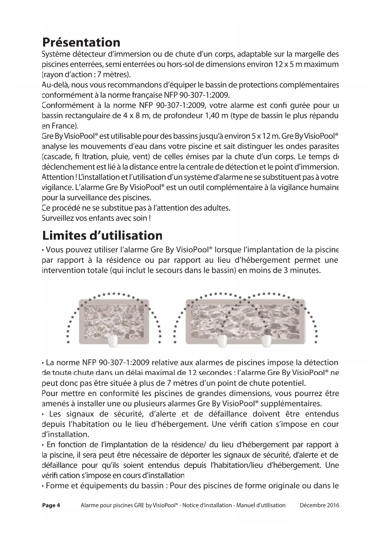 - Information permanente sur l’état de surveillance Notice d’installation - Manuel d’utilisation À lire attentivement et à conserver pour consultation ultérieure. byPage 2 Alarme pour piscines GRE by VisioPool® - Notice d’installation - Manuel d’utilisation Décembre 2016 AVERTISSEMENT Madame, Monsieur, Vous venez d’acquérir un dispositif d’alarme pour piscine conforme à la norme française NFP 90-307-1:2009. Ce système ne se substitue pas au bon sens ni à la responsabilité individuelle. La sécurité de vos enfants ne dépend que de vous ! Le risque est maximum lorsque les enfants ont moins de 5 ans. L’accident n’arrive pas qu’aux autres ! Soyez prêt à y faire face ! En aucun cas, la société ACIS, ne pourra être tenue pour responsable de la chute ou de la noyade de toute personne ou animal. La mise en oeuvre du dispositif Gre By VisioPool® ne doit pas diminuer votre vigilance ou se substituer à une surveillance active de la piscine et de ses abords. Garantie : pour béné cier pleinement de la garantie Gre by VisioPool®, vous devez impérativement compléter et signer la che de garantie fournie et la retourner sous 8 jours à la société ACIS - 15, rue des Marais - 44310 ST PHILBERT DE GRAND LIEU (France) par courrier suivi (lettre recommandée avec accusé de réception, courrier suivi de la Poste). La garantie de l’alarme Gre By VisioPool® ne prendra e et qu’à réception du certi cat de garantie dûment rempli. Sans retour de ces pièces, aucune garantie ne saurait être accordée. Lire attentivement et conserver tout document relatif à l’alarme Gre By VisioPool® pour consultation ultérieure.Décembre 2016 Alarme pour piscines GRE by VisioPool® - Notice d’installation - Manuel d’utilisation Page 3 Table des matières Avertissement ...................................................................................... 4 Contrôles préalables ....................................................................... 5 Contrôle de l’emballage et des composants ............................. 5 Contrôle avant mise en service ...................................................... 6 Choix de l’implantation ..................................................................... 7 Installation sur la margelle .......................................................... 8 Test de fonctionnement dans le bassin ...................................9 Piles alcalines ...................................................................................... 10 Utilisation............................................................................................11 Hivernage ............................................................................................ 11 Arrêt complet ..................................................................................... 12 Mises en garde ................................................................................... 12 Informations complémentaires .................................................... 13 Informations légales ........................................................................ 13 Informations concernant l’alarme Gre By VisioPool® ............13 Conseils de sécurité ....................................................................... 14 Tests mensuels .................................................................................. 16 Garantie ................................................................................................. 17 Exclusions de garantie .................................................................... 17 Retour SAV ............................................................................................ 18 Limites de responsabilité ................................................................ 18 Déclaration de conformité ............................................................. 19 Informations pratiques ....................................................................19Page 4 Alarme pour piscines GRE by VisioPool® - Notice d’installation - Manuel d’utilisation Décembre 2016 Présentation Système détecteur d’immersion ou de chute d’un corps, adaptable sur la margelle des piscines enterrées, semi enterrées ou hors-sol de dimensions environ 12 x 5 m maximum (rayon d’action : 7 mètres). Au-delà, nous vous recommandons d’équiper le bassin de protections complémentaires conformément à la norme française NFP 90-307-1:2009. Conformément à la norme NFP 90-307-1:2009, votre alarme est con gurée pour un bassin rectangulaire de 4 x 8 m, de profondeur 1,40 m (type de bassin le plus répandu en France). Gre By VisioPool® est utilisable pour des bassins jusqu’à environ 5 x 12 m. Gre By VisioPool® analyse les mouvements d’eau dans votre piscine et sait distinguer les ondes parasites (cascade, ltration, pluie, vent) de celles émises par la chute d’un corps. Le temps de déclenchement est lié à la distance entre la centrale de détection et le point d’immersion. Attention ! L’installation et l’utilisation d’un système d’alarme ne se substituent pas à votre vigilance. L’alarme Gre By VisioPool® est un outil complémentaire à la vigilance humaine pour la surveillance des piscines. Ce procédé ne se substitue pas à l’attention des adultes. Surveillez vos enfants avec soin ! Limites d’utilisation