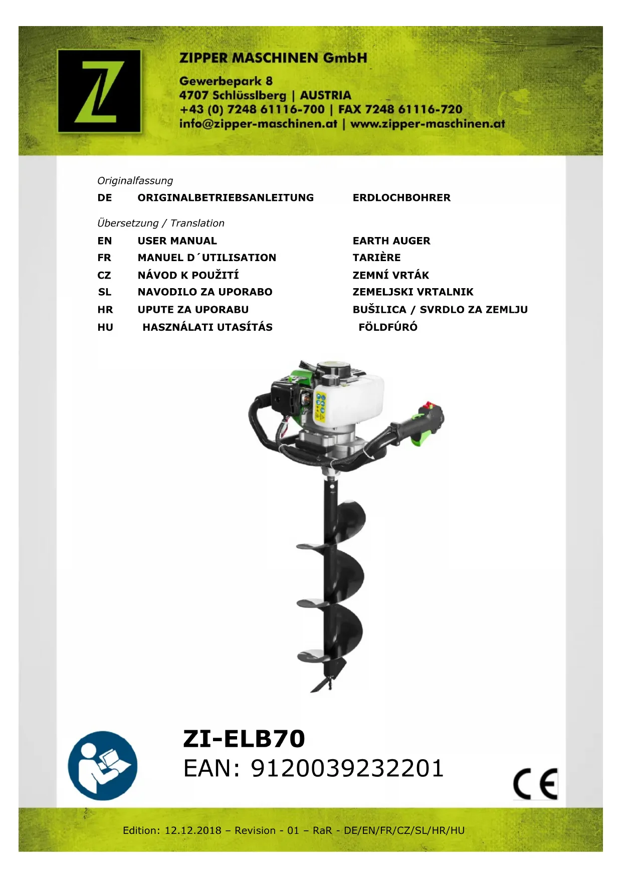 Should you in necessary repairs not able to properly to perform or you have not the prescribed training for it always attract a workshop to fix the problem.MODE D´EMPLOI (FR) ZIPPER MASCHINEN GmbH www.Zipper-Maschinen.at 27 ZI-ELB70 27 17 MODE D´EMPLOI (FR) Cher Client! Ce manuel contient des informations et des conseils pour une utilisation correcte et sûre et l'entretien de la tarière thermique ZIPPER ZI-ELB70. Le manuel fait partie de la machine et ne doit pas être stocké séparément. Lire attentivement avant la première utilisation de la machine et le conserver pour référence future. Lorsque la machine est utilisée par d'autres personnes, toujours remettre le manuel avec la machine. S'il vous plaît, suivez les consignes de sécurité! Le développement continu de nos produits, les illustrations, les images peuvent varier légèrement. Attention! Sous réserve de modifications techniques. Droit d'auteur © 2016 Ce document est protégé par le droit international des droits d'auteur. Tous droits réservés. Surtout la réimpression et la traduction et la représentation des images seront poursuivies par la loi. Compétence de la Cour de Wels, en Autriche. Contact service après-vente