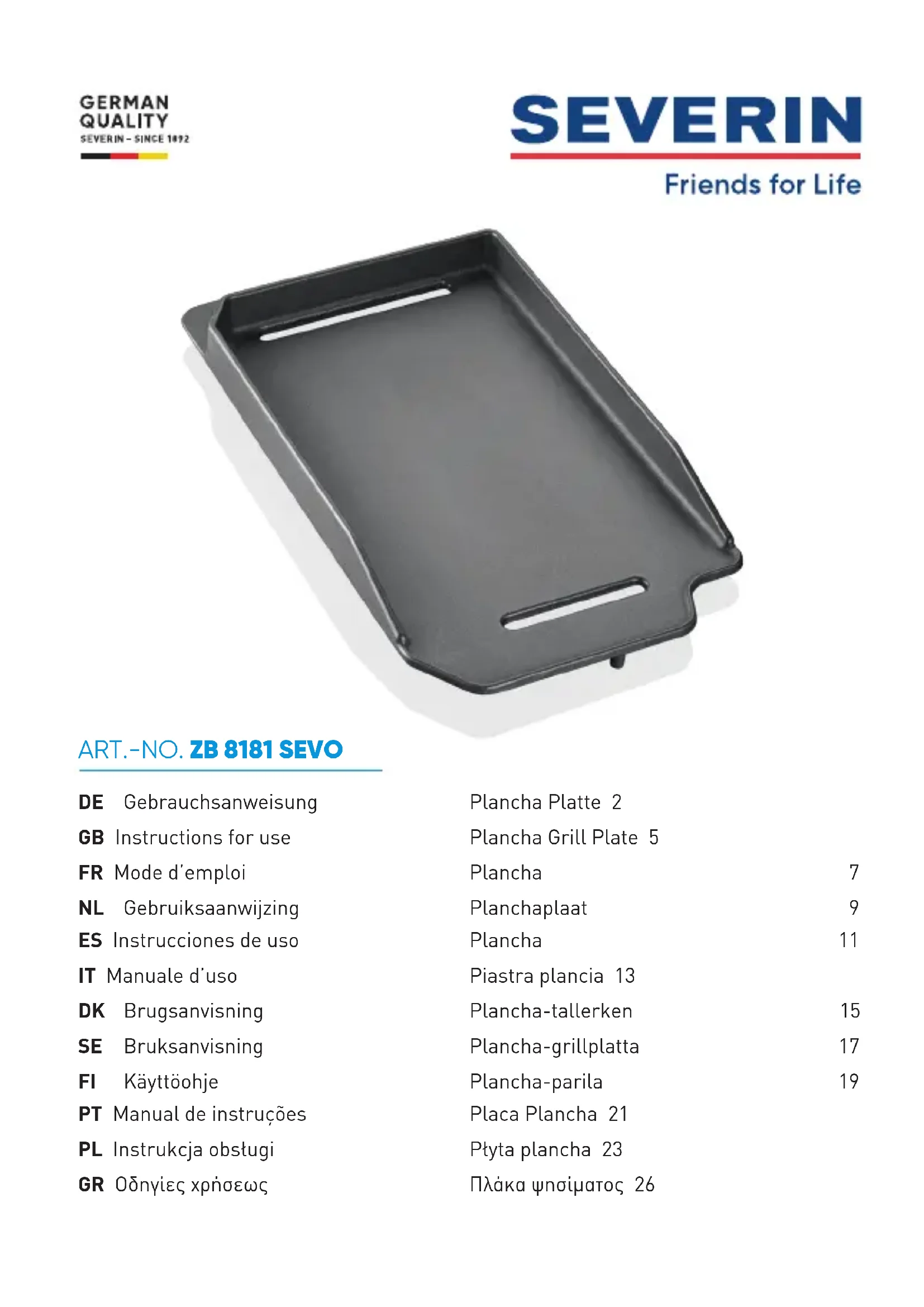 Plancha Chère cliente, Cher client, Avant d’utiliser cet appareil, veuillez lire soigneusement les instructions suivantes et conserver ce manuel pour future référence. L’appareil doit être utilisé exclusivement par des personnes familiarisées avec les présentes instructions. Consignes de sécurité ∙ La plancha SEVO ne peut être utilisée qu’avec les grils de la gamme SEVO. Les consignes de sécurité du gril respectif s’appliquent donc également. ∙ Posez toujours la plancha sur un gril froid. ∙ Attention ! Laissez toujours le gril refroidir complètement avant de retirer la plancha. ∙ Ne versez jamais d’eau sur la plancha montée et ne plongez jamais la plancha chaude dans de l’eau froide. ∙ Pour éviter d’endommager la plancha, abstenez-vous d’utiliser des instruments pointus ou tranchants pour retirer les aliments. ∙ N’utilisez pas d’éponges en métal ni de produits abrasifs pour le nettoyage. Avant la première utilisation ∙ Déballez la plancha et retirez entièrement tous les matériaux d’emballage. ∙ Nettoyez la plancha tel qu’indiqué dans la section « Entretien et nettoyage ». ∙ Montez la plancha tel que décrit dans la section « Utilisation ». ∙ Faites chauffer la plancha sans aliments pendant 10 minutes environ à puissance maximale. Une légère fumée peut se dégager. Par conséquent, en cas d’utilisation dans une pièce fermée, prévoyez une aération sufsante en ouvrant les fenêtres ou portes-fenêtres, ou placez l’appareil sous une hotte aspirante. ∙ Ensuite, laissez bien refroidir la plancha et nettoyez-la de nouveau. Utilisation ∙ Retirez la partie gauche de la grille et positionnez la plancha de manière à ce que ses tiges se placent dans les ouvertures correspondantes du bac à réserve d’eau. Le pare-vent ne peut pas FR8 104 x 142 mm être monté. ∙ Si vous le souhaitez, enduisez la plancha d’une ne couche d’huile de consommation résistante à la chaleur. ∙ Faites chauffer le gril à la température désirée. Si votre appareil est équipé d’un couvercle, fermez-le. ∙ Après avoir fait chauffer la plancha, posez les aliments. ∙ Le temps de chauffe de la plancha est d’environ 10 minutes. Nettoyage et entretien ∙ Attention ! Laissez toujours le gril refroidir complètement avant de retirer la plancha. ∙ Nettoyez la plancha refroidie après chaque utilisation. ∙ N’utilisez pas d’éponges en métal ni de produits abrasifs pour le nettoyage. ∙ Retirez la plancha et nettoyez-la à l’eau savonneuse. Laissez-la tremper si besoin. ∙ Ensuite, essuyez-la soigneusement et rangez-la dans un endroit sec. ∙ Ne mettez pas la plancha au lave- vaisselle. Mise au rebut Les appareils qui portent ce symbole doivent être collectés et traités séparément de vos déchets ménagers, car ils contiennent des matériaux précieux qui peuvent être recyclés. En vous débarrassant correctement de ces appareils, vous contribuez à la prévention de potentiels effets négatifs sur la santé humaine et l’environnement. Votre mairie ou le magasin auprès duquel vous avez acquis l’appareil peuvent vous donner des informations à ce sujet. Garantie Cet appareil est garanti par le fabricant pendant une durée de deux ans à partir de la date d‘achat, contre tous défauts de matière et vices de fabrication. Au cours de cette période, toute pièce défectueuse sera remplacée gratuitement. Cette garantie ne couvre pas l‘usure normale de l‘appareil, les pièces cassables telles que du verre, des ampoules, etc., ni les détériorations provoquées par une mauvaise utilisation et le non-respect du mode d‘emploi. Aucune garantie ne sera due si l‘appareil a fait l‘objet d‘une intervention à titre de réparation ou d‘entretien par des personnes non-agréées par nous-mêmes. Cette garantie n‘affecte pas les droits légaux des consommateurs sous les lois nationales applicables en vigueur, ni les droits du consommateur face au revendeur résultant du contrat de vente/d‘achat. Si votre appareil ne fonctionne plus normalement, veuillez l‘adresser, sous emballage solide, à une de nos stations de service après-vente agréées, muni de votre nom et adresse. Si vous retournez votre appareil pendant la période de garantie, n‘oubliez pas de joindre à votre envoi la preuve de garantie (ticket de caisse, facture etc.) certiée par le vendeur.104 x 142 mm